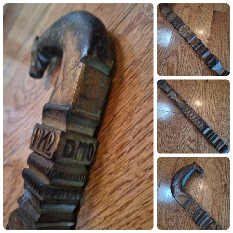 Lot # 61 - 1912 Carved Wood Walking Stick – Horse Head Handle & Symbolic Motifs Starting Bid: $ 100.00 Bids: This sale will end in: |