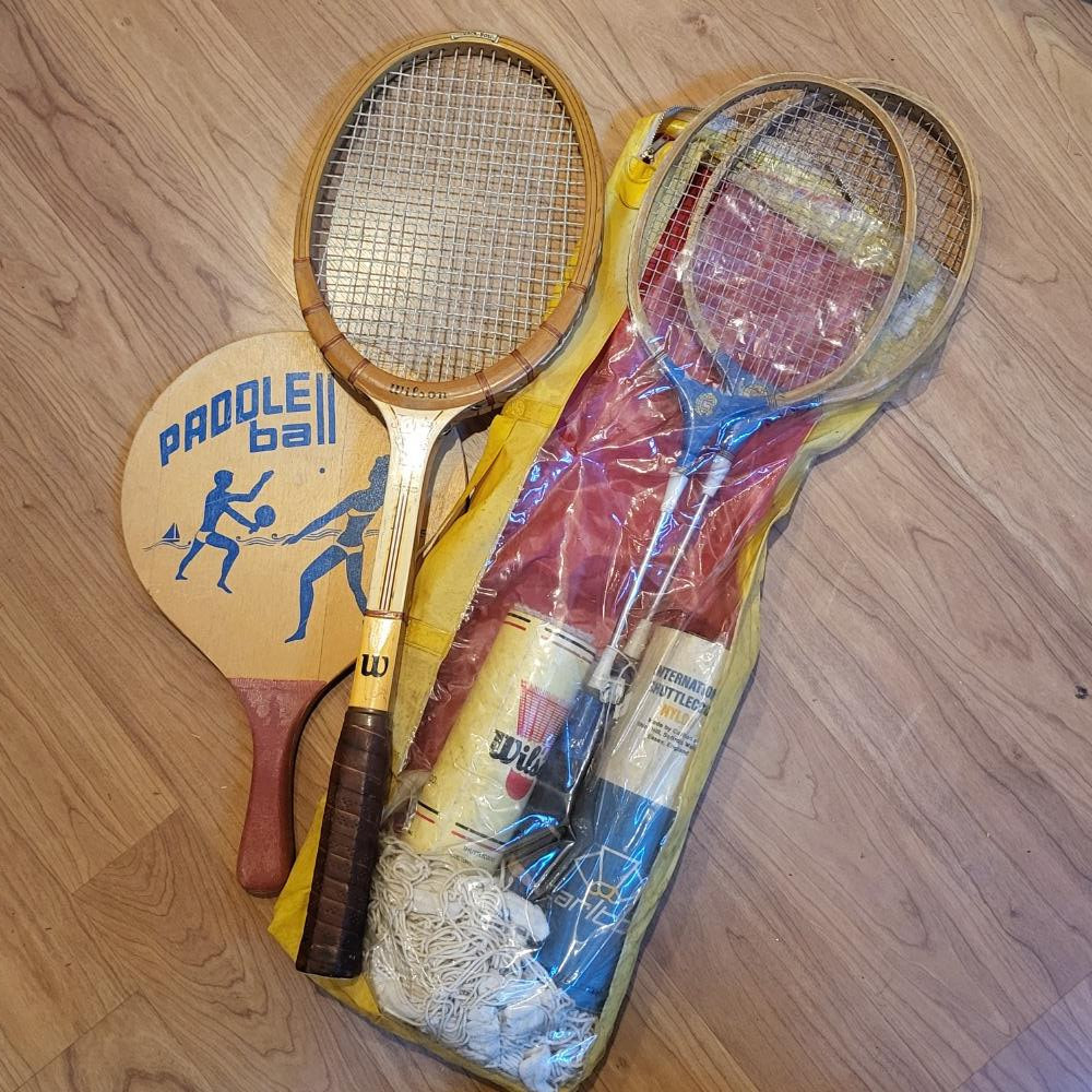 Lot # 23 - Vintage Outdoor Sports Rackets - Badminton, Tennis, Paddle Ball Starting Bid: $ 10.00 Bids: This sale will end in: |