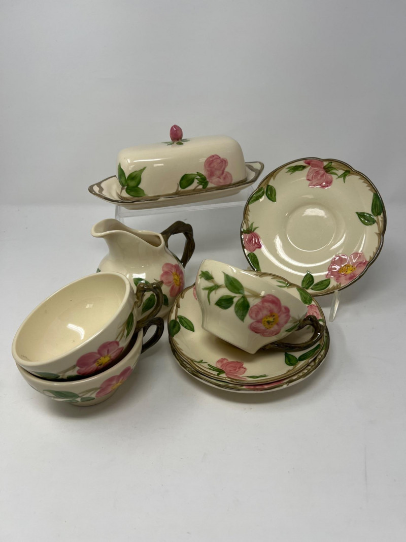 Lot # 101 - Franciscan Desert Rose Dishes – Butter, Creamer & Trio of Cups/Saucers Starting Bid: $ 5.00 Bids: Bidding starts in: |