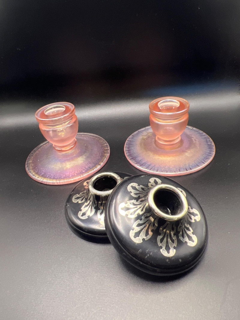 Lot # 46 - Fenton Velva Rose Stretch Glass & Harvite Black Silver Candle Holders Starting Bid: $ 5.00 Bids: Bidding starts in: |