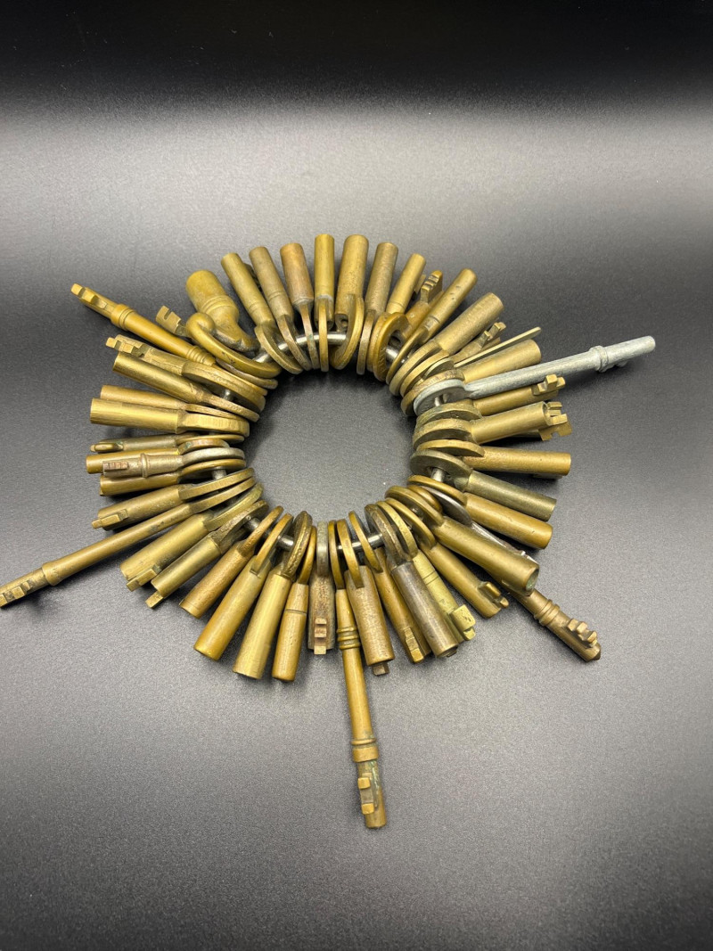 Lot # 93 - Antique Brass Railroad Keys (Early 20th C) – Multi‑Key Ring Set #3 Starting Bid: $ 10.00 Bids: Bidding starts in: |