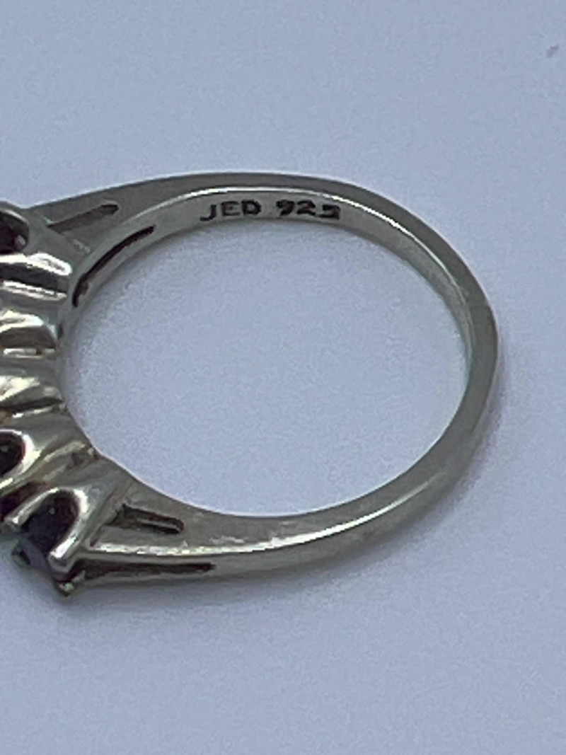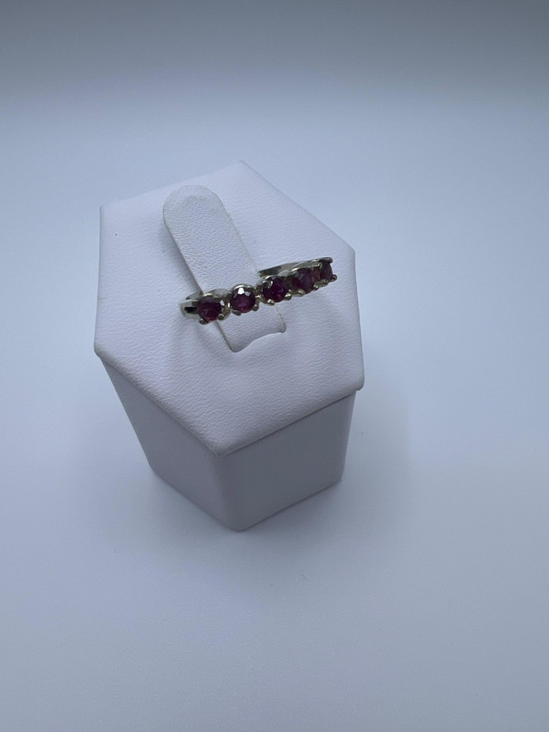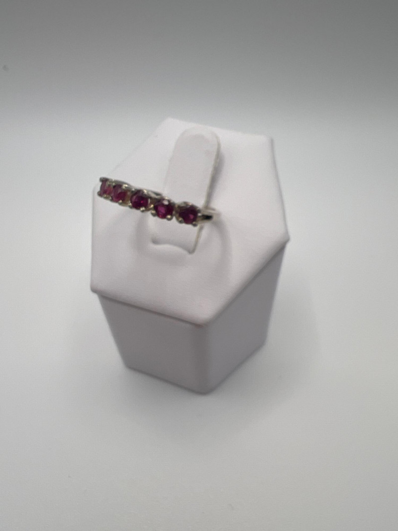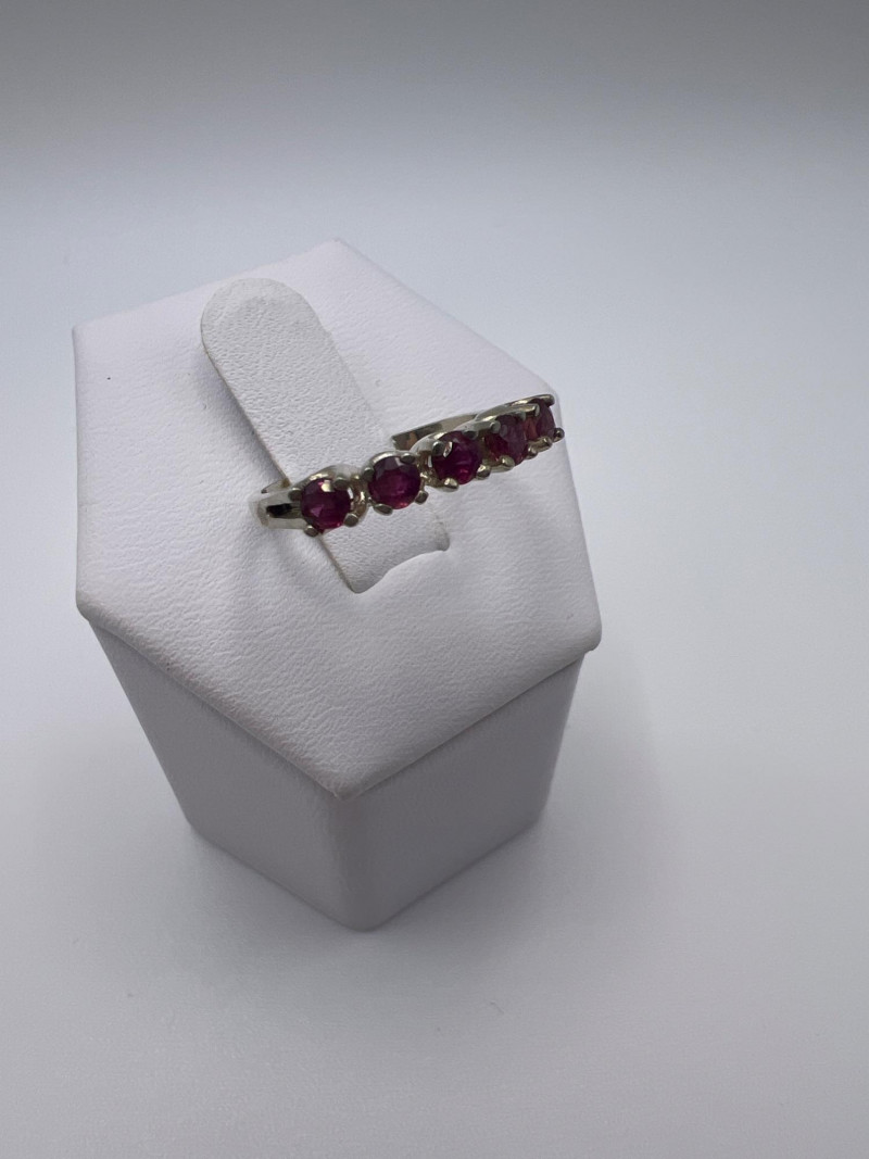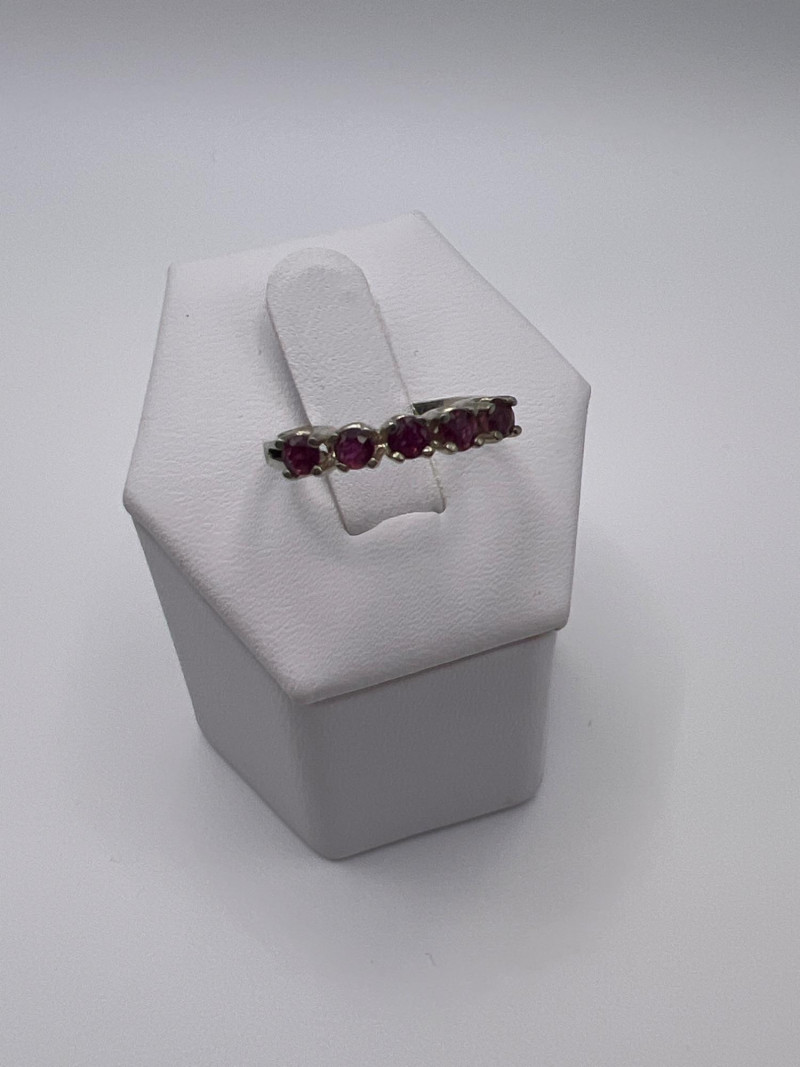 A delicate and elegant five‑stone ruby band crafted in 925 sterling silver and marked JED. This ring features five vibrant ruby stones set in a classic row, offering a timeless look that pairs beautifully with stacking bands or stands alone as a subtle pop of color. Lightweight and comfortable, it’s an easy everyday piece with vintage charm. Approximately 1 gram.