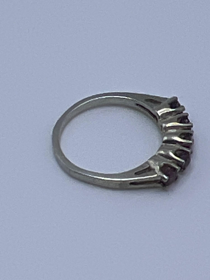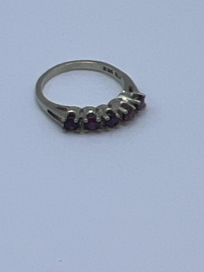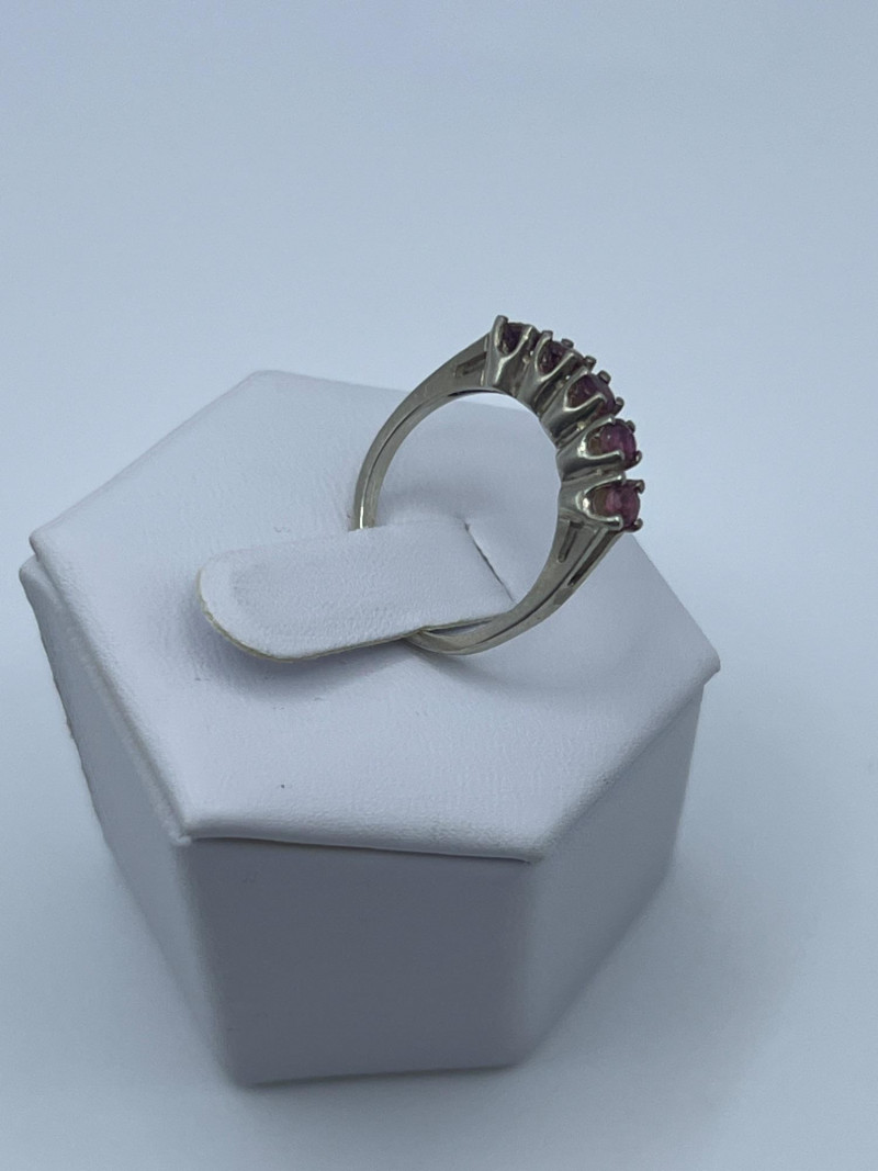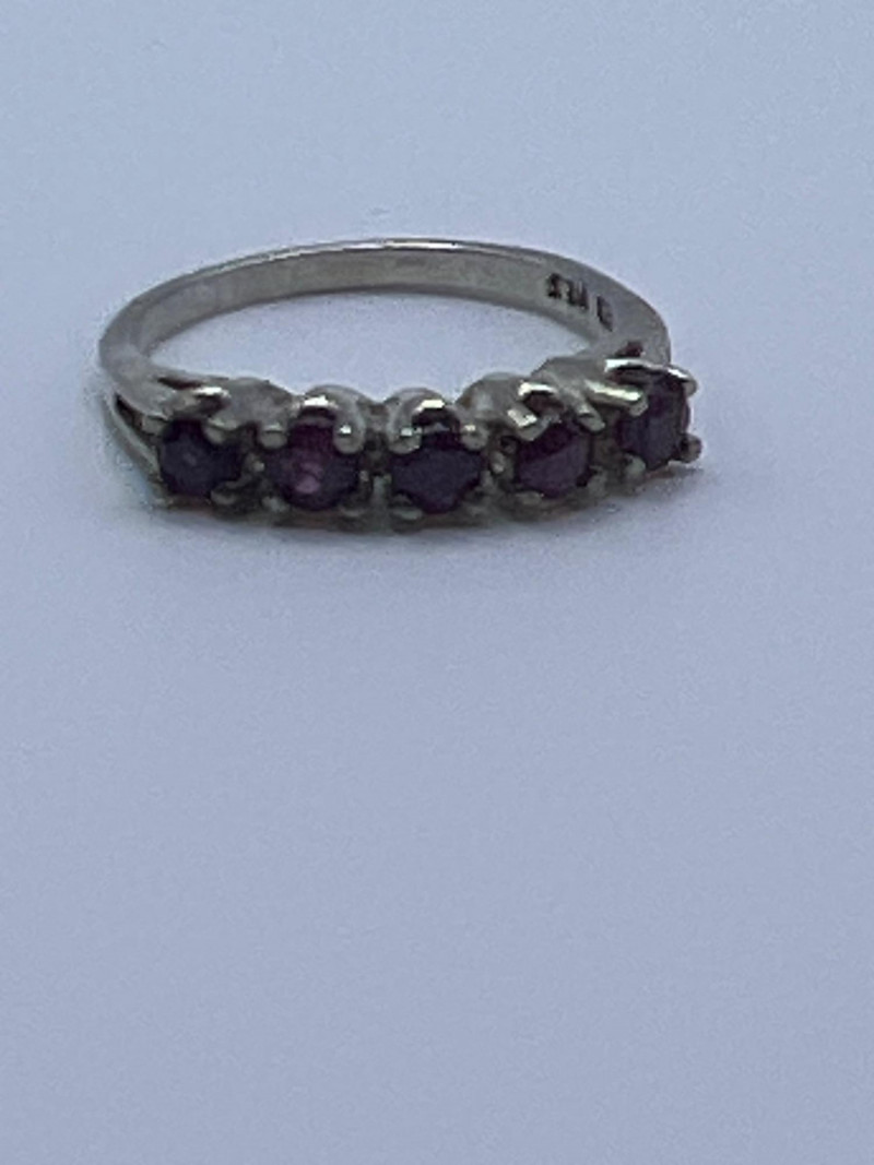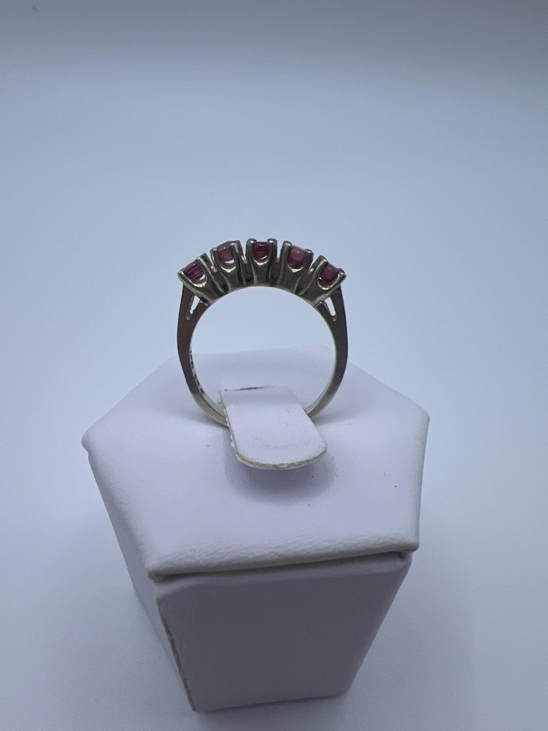 A delicate and elegant five‑stone ruby band crafted in 925 sterling silver and marked JED. This ring features five vibrant ruby stones set in a classic row, offering a timeless look that pairs beautifully with stacking bands or stands alone as a subtle pop of color. Lightweight and comfortable, it’s an easy everyday piece with vintage charm. Approximately 1 gram.