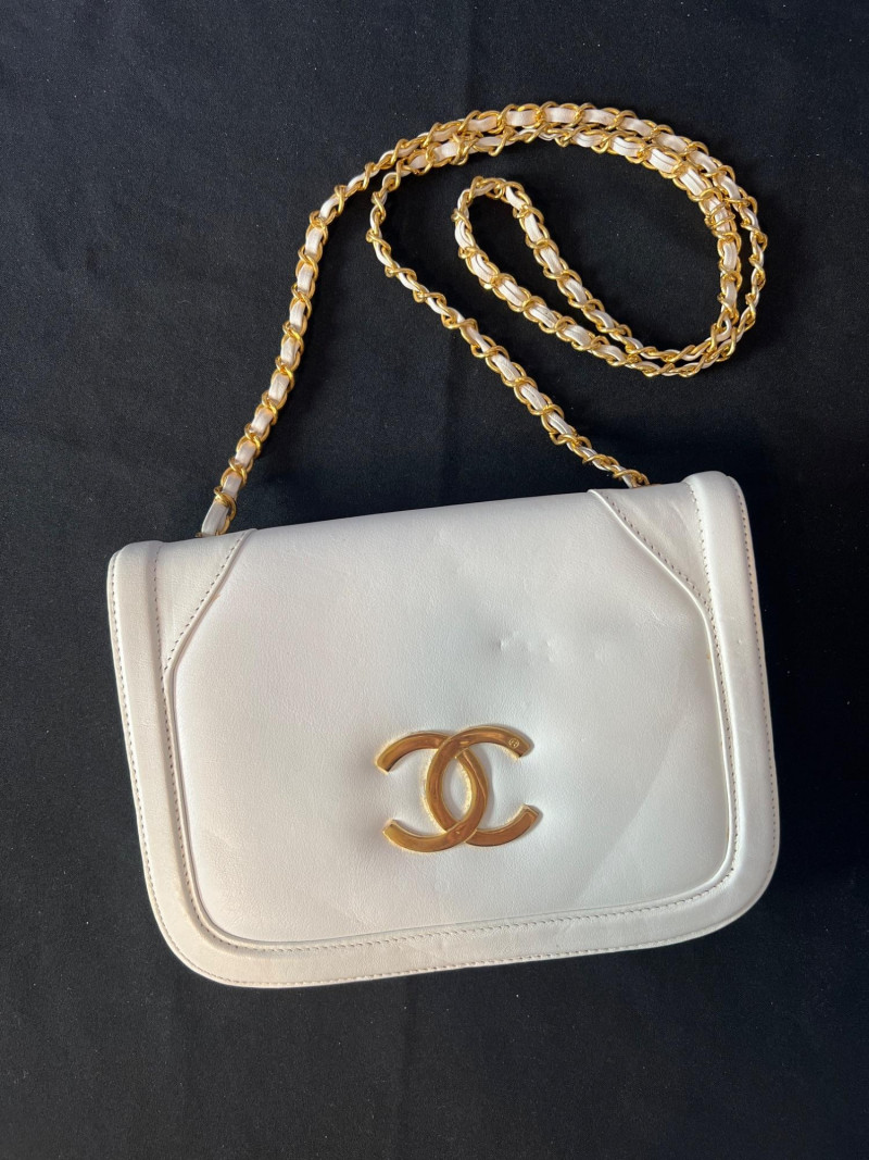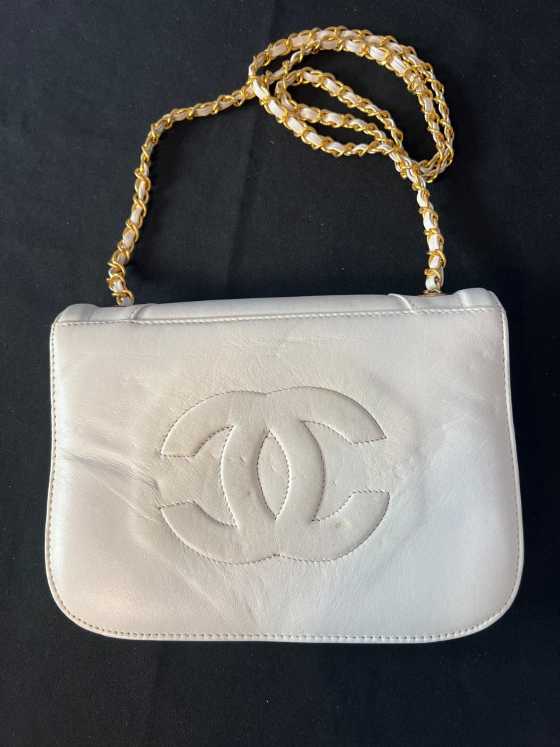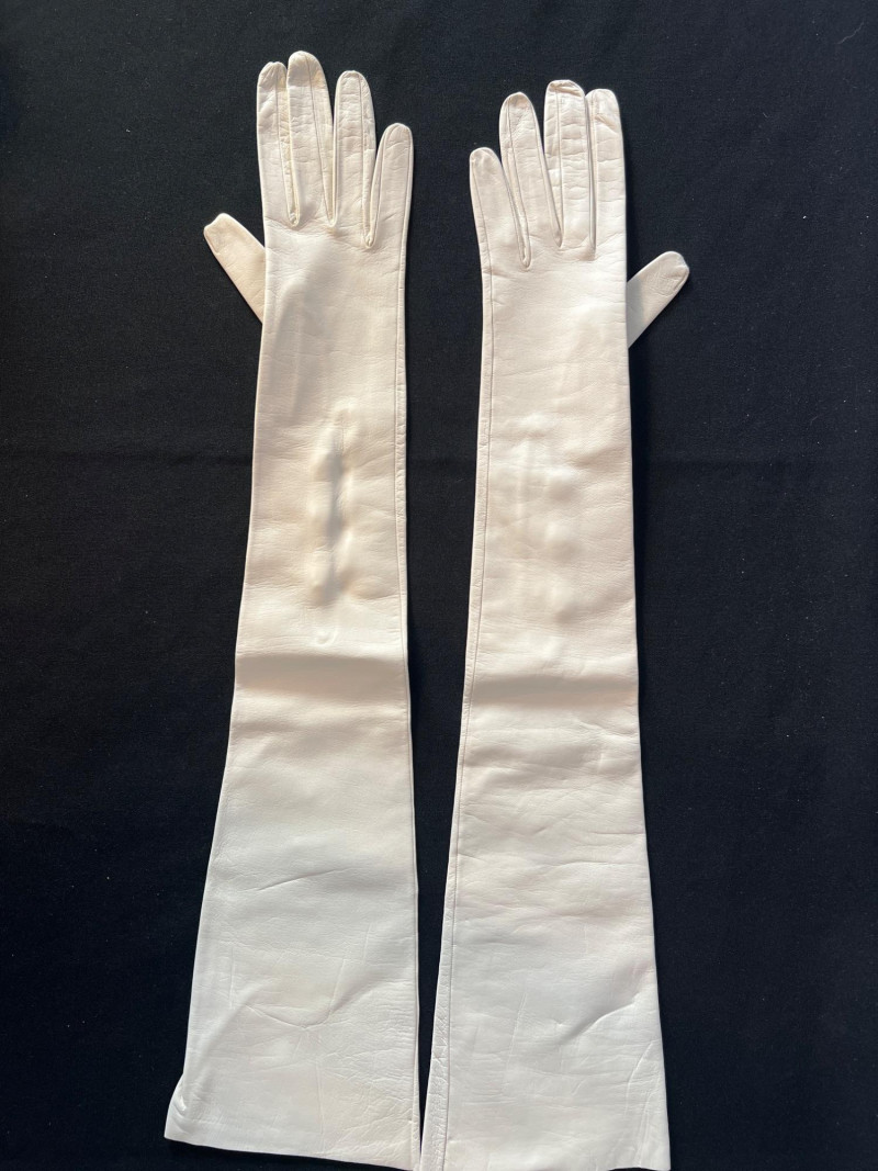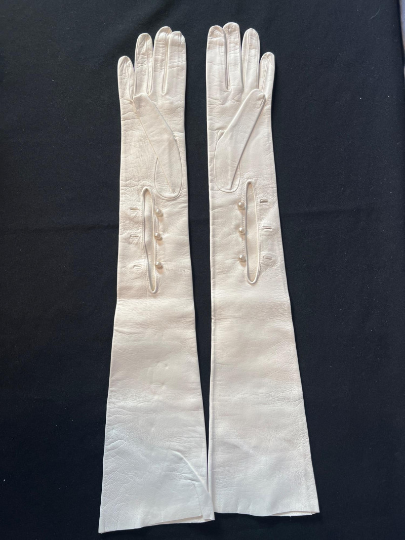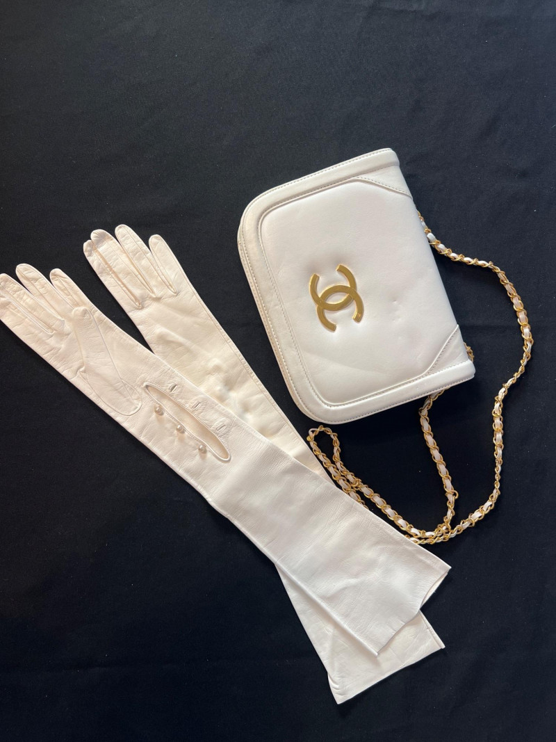 A refined pairing of timeless luxury featuring a white Chanel leather handbag and a set of vintage kidskin opera‑length gloves. The Chanel bag showcases smooth white leather with gold‑tone chain strap and iconic CC hardware, secured with a classic snap‑closure flap — a hallmark of Chanel’s late‑1980s to 1990s boutique collections. Accompanying the bag is a pair of elegant white kidskin opera gloves, crafted from exceptionally soft leather and finished with a three‑button wrist placket on the underside of the arm, a couture detail typical of mid‑century formal accessories. Together, these pieces evoke sophisticated Parisian style and mid‑century glamour, offering collectors a beautifully coordinated fashion ensemble.