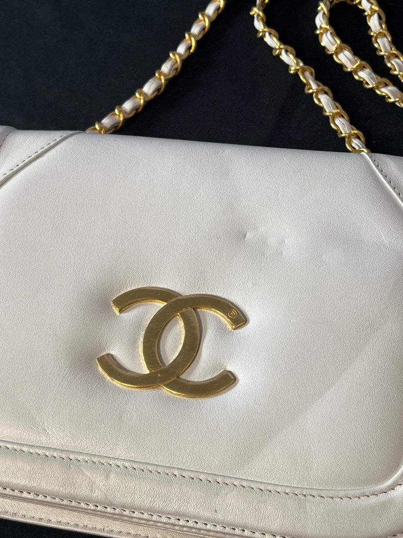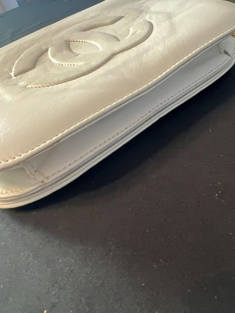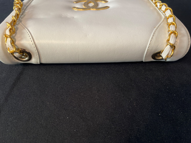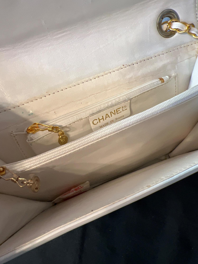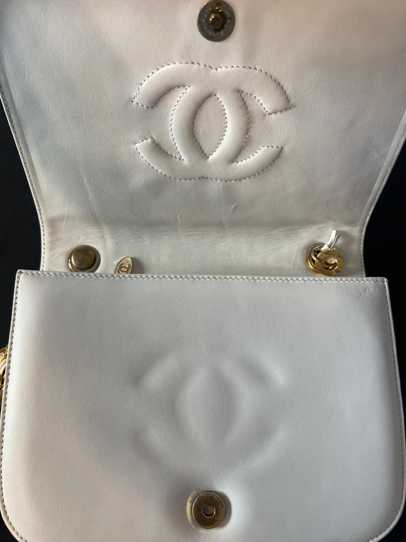 A refined pairing of timeless luxury featuring a white Chanel leather handbag and a set of vintage kidskin opera‑length gloves. The Chanel bag showcases smooth white leather with gold‑tone chain strap and iconic CC hardware, secured with a classic snap‑closure flap — a hallmark of Chanel’s late‑1980s to 1990s boutique collections. Accompanying the bag is a pair of elegant white kidskin opera gloves, crafted from exceptionally soft leather and finished with a three‑button wrist placket on the underside of the arm, a couture detail typical of mid‑century formal accessories. Together, these pieces evoke sophisticated Parisian style and mid‑century glamour, offering collectors a beautifully coordinated fashion ensemble.