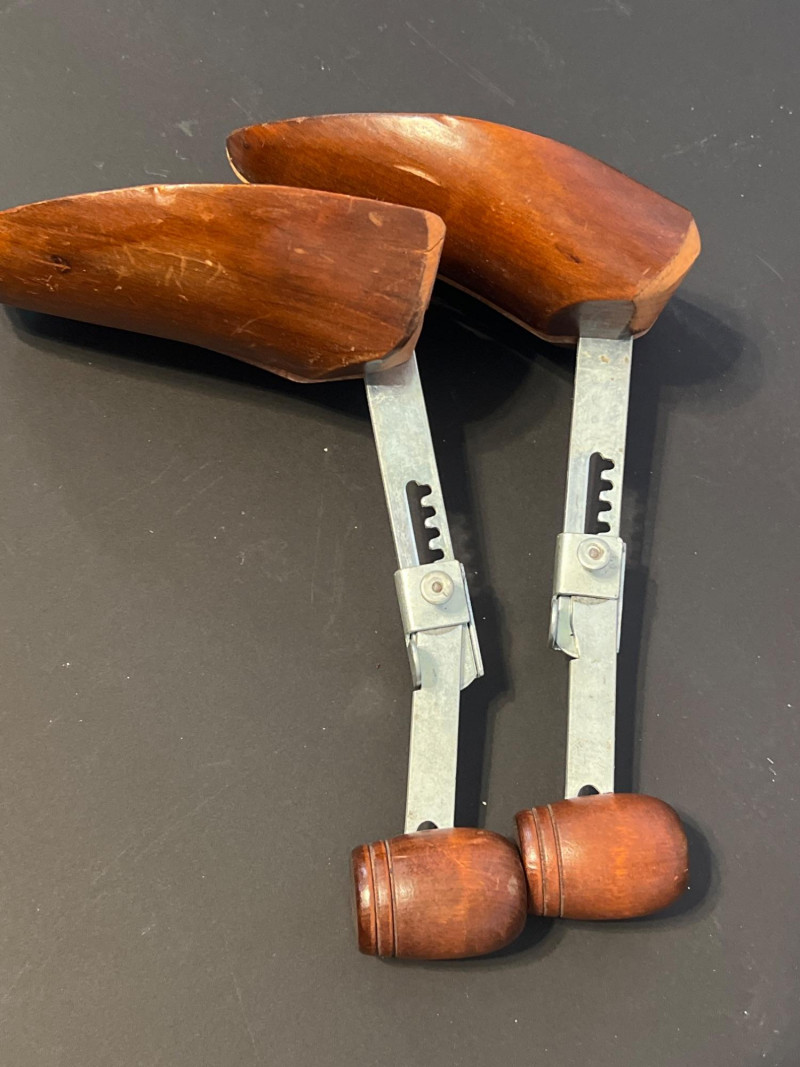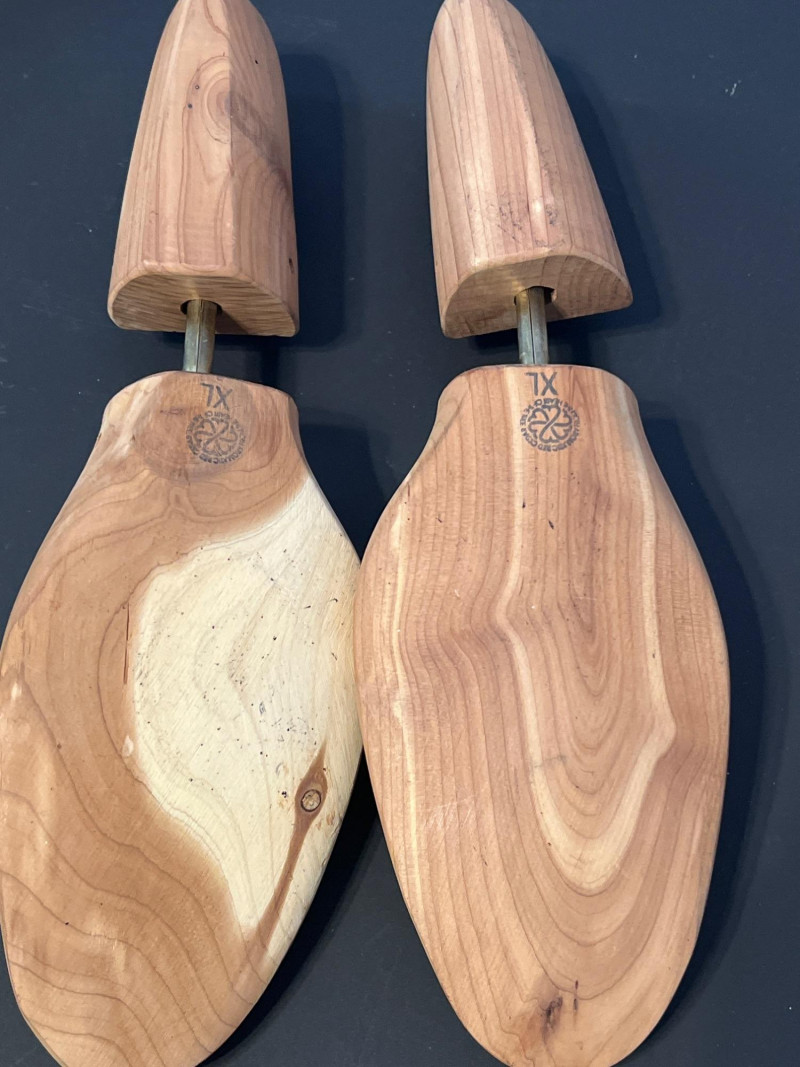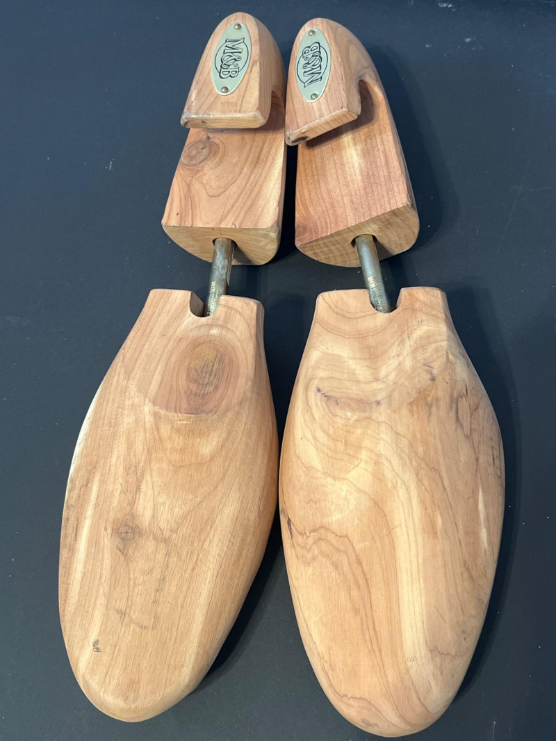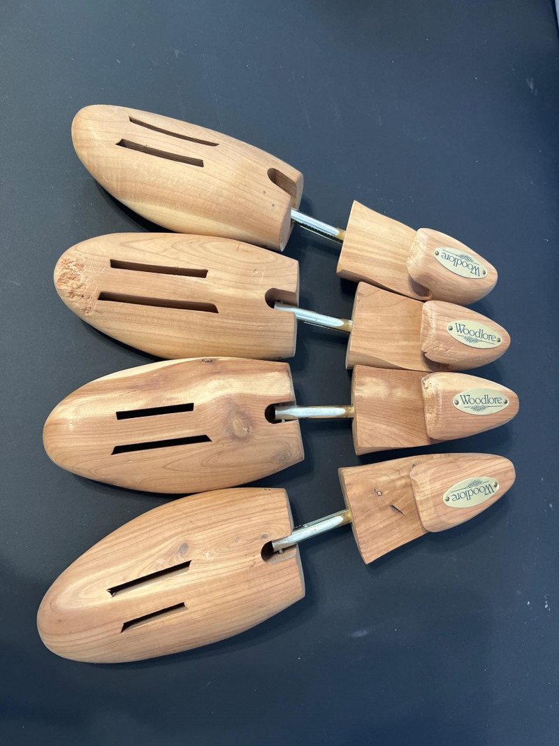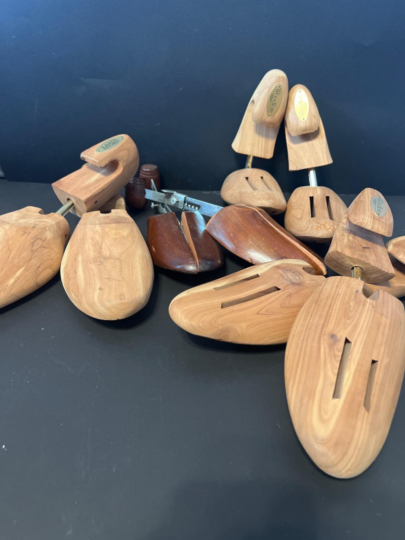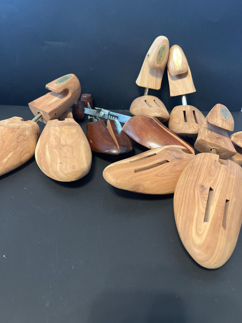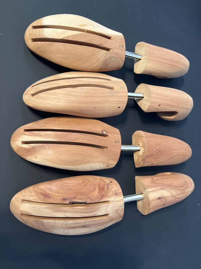 A grouped lot of four pairs of classic wooden shoe trees, ideal for maintaining the shape and longevity of leather shoes. Each pair features a natural wood finish with spring‑loaded tension to support the toe box and heel. Perfect for collectors, resellers, or anyone who appreciates proper shoe care.