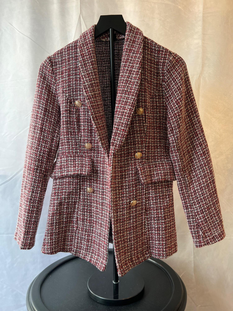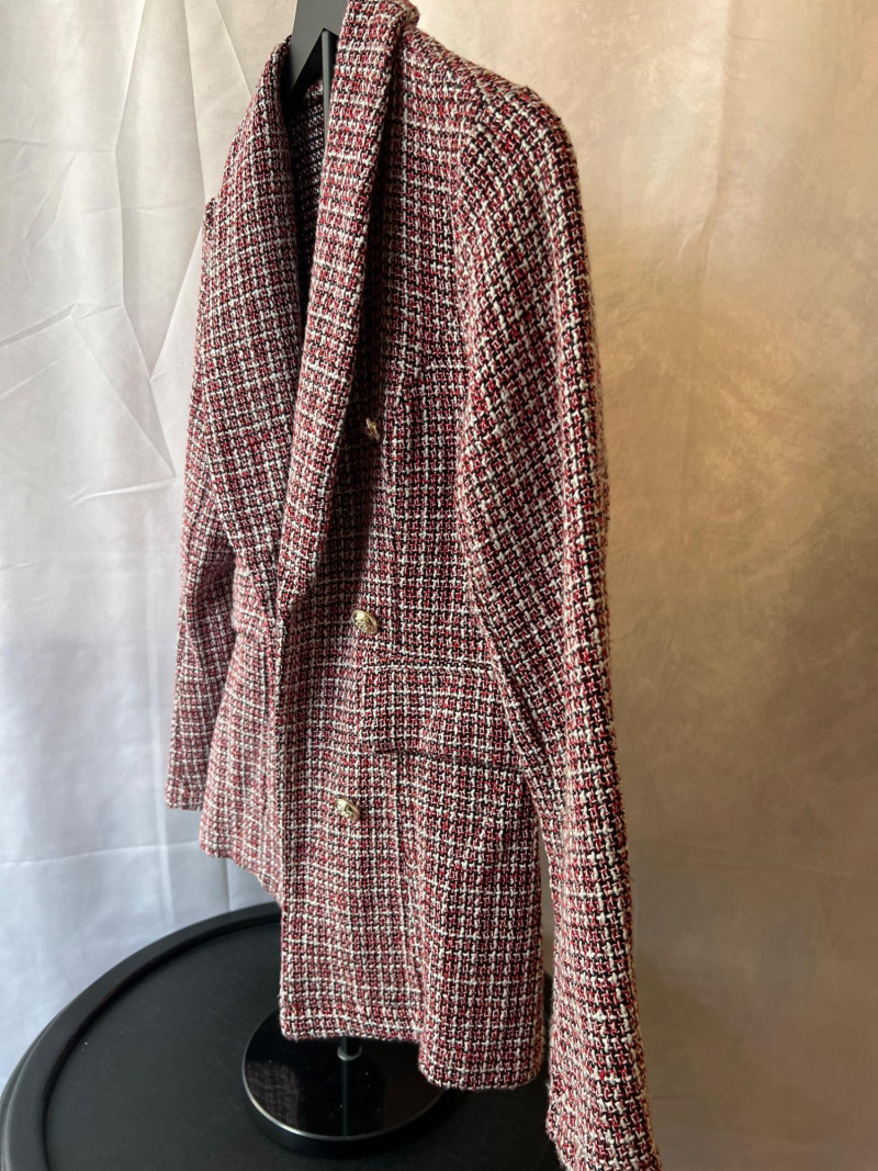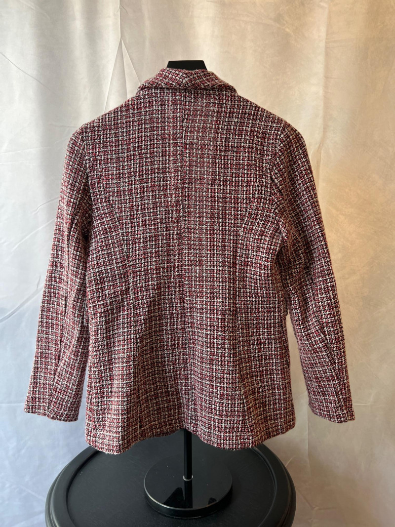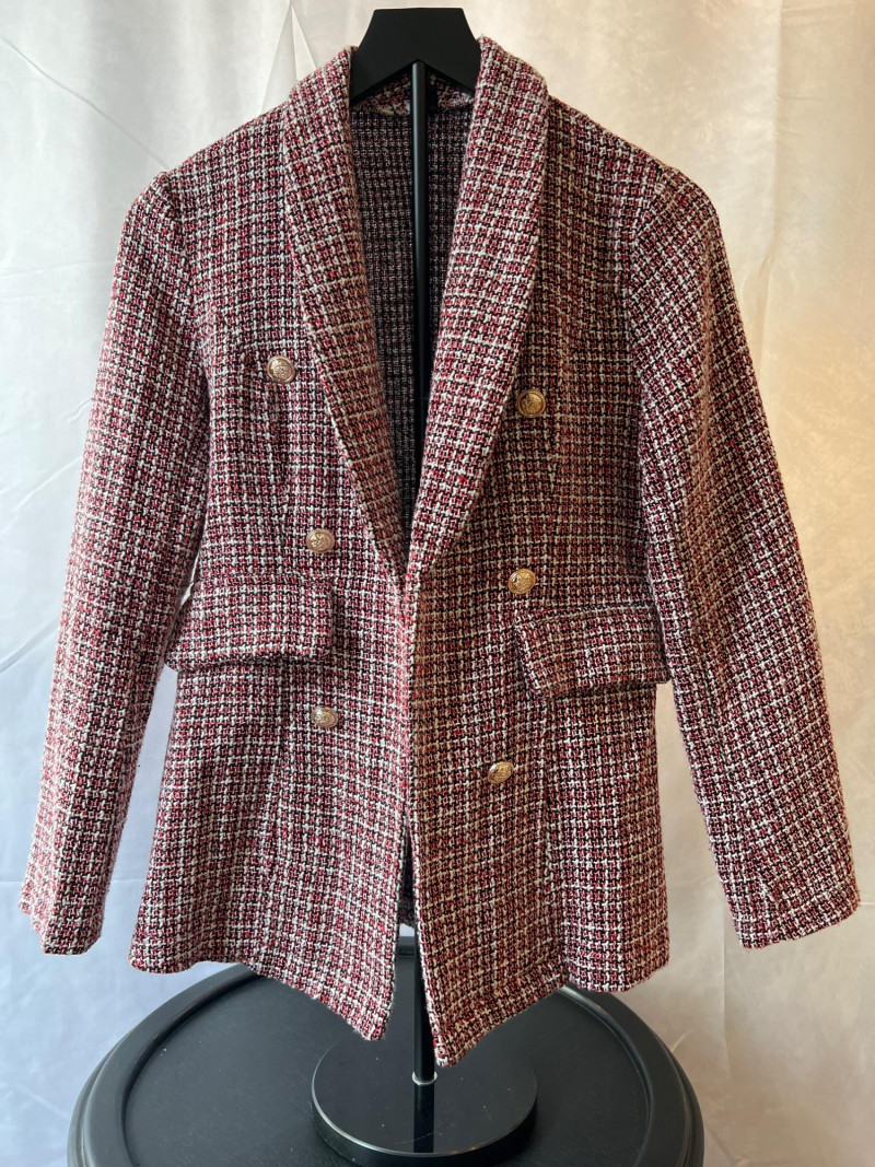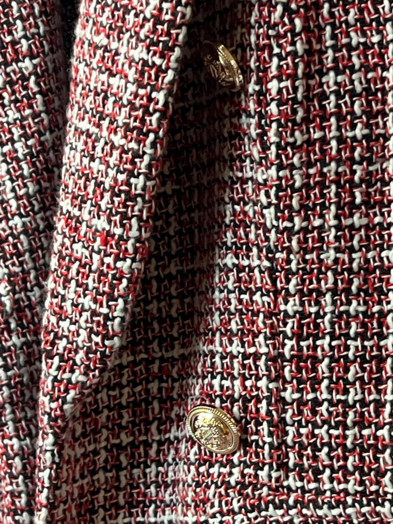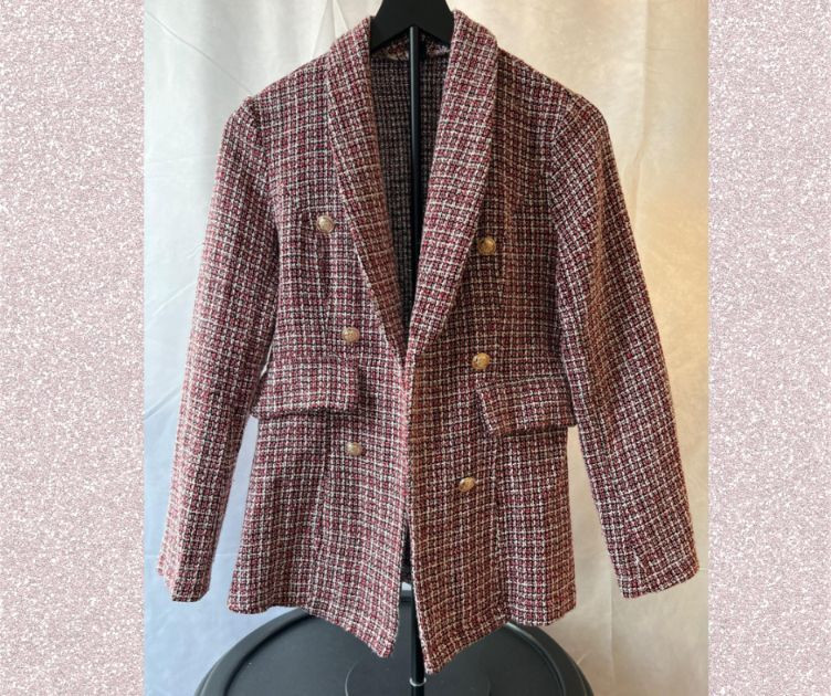 A contemporary piece with vintage echoes, this SHEIN tweed blazer in size small (4) blends soft structure with a minimalist silhouette. The open front design and textured weave offer effortless layering—perfect for transitional seasons or elevated casual wear. Double-breasted appearance. Size: Small (4) Color: Red, black and white neutral tweed Style: Open front, collar, tailored Dimensions: 24" length × 15" shoulder width Condition: Gently worn, well preserved Ideal for collectors curating modern wardrobe staples or those seeking a versatile piece with quiet sophistication.