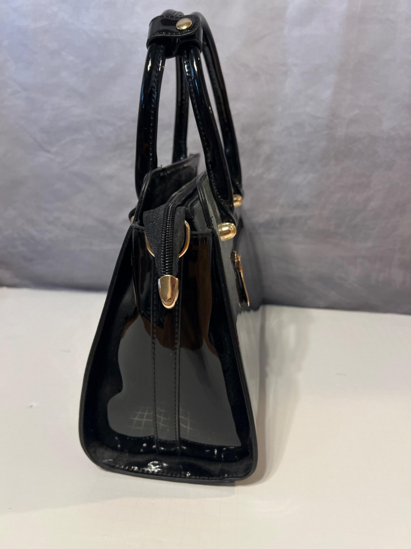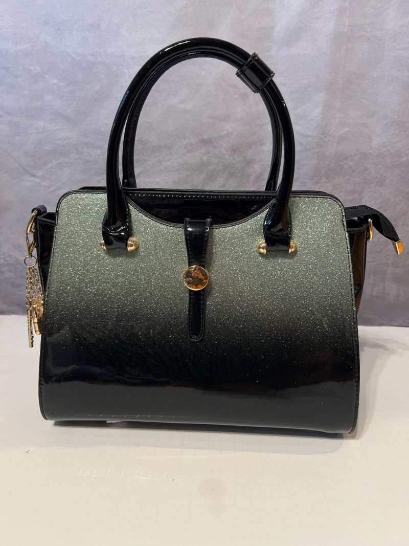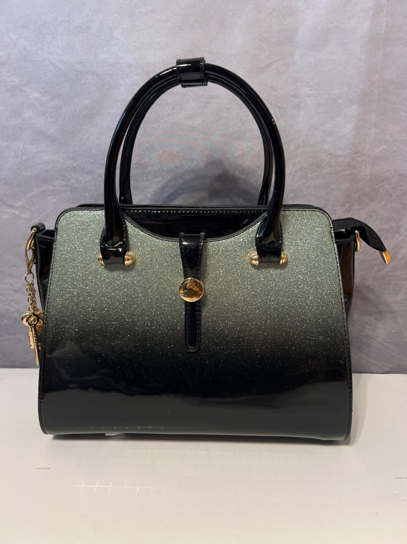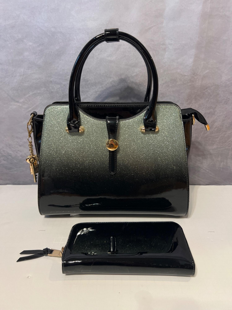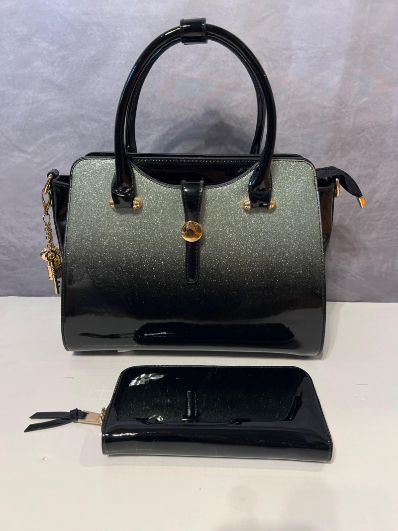 A striking black ombre patent leather handbag paired with a matching coordinating wallet. The glossy finish and gradient color give this set a modern, elevated look, perfect for everyday use or adding a bold accent to an outfit. Attachable shoulder strap included. The handbag offers ample room for essentials, while the wallet provides organized storage in a matching style. It appears to be never used.