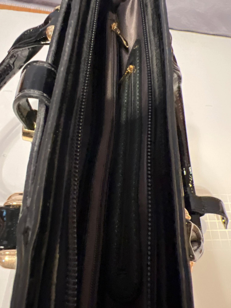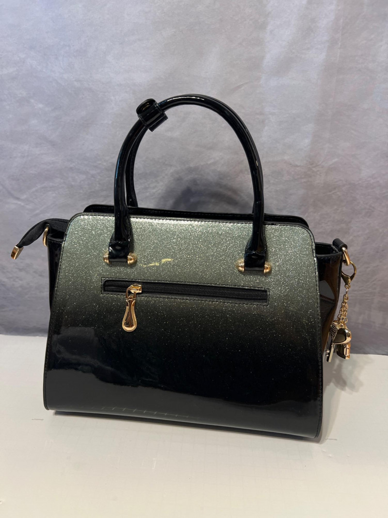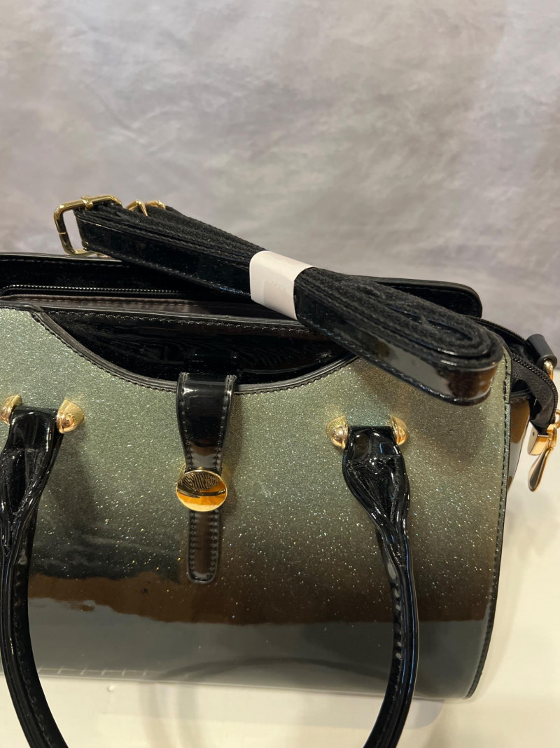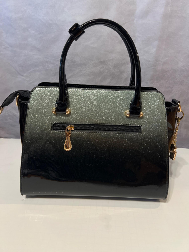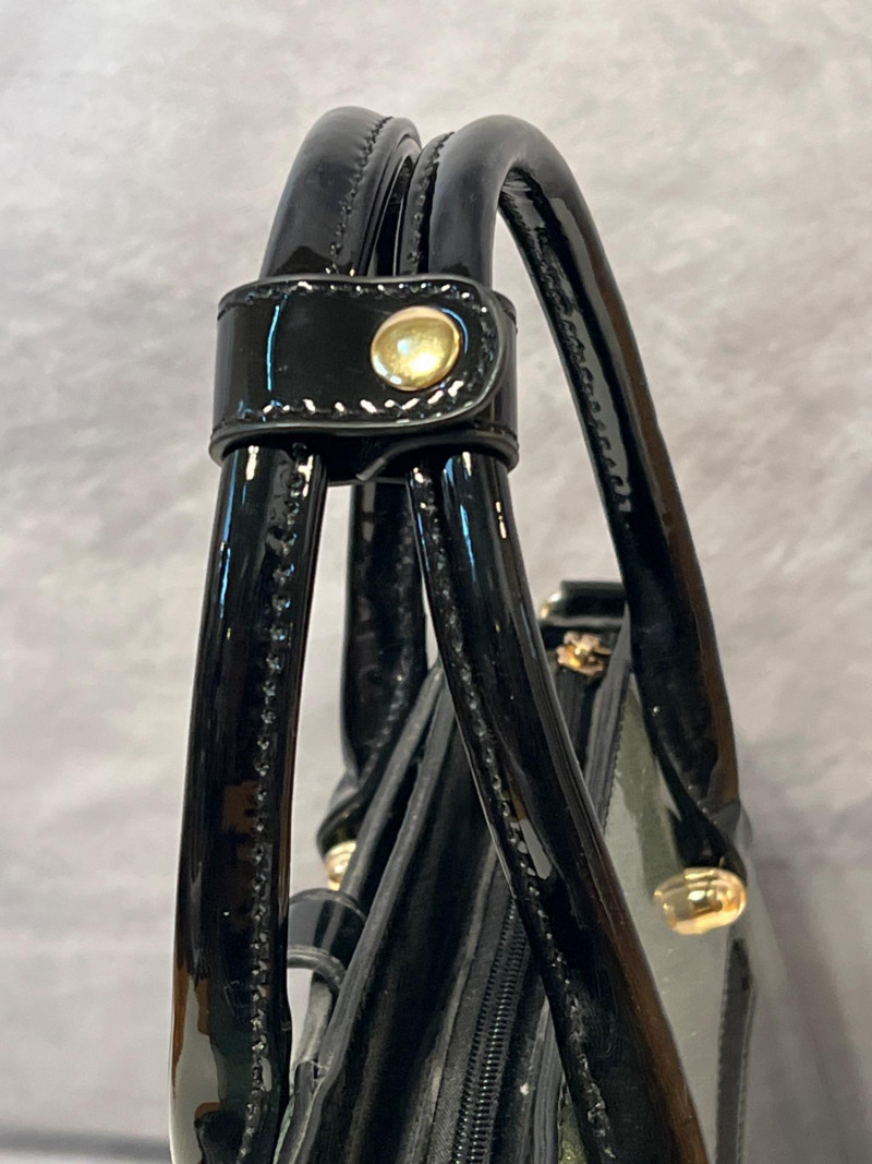 A striking black ombre patent leather handbag paired with a matching coordinating wallet. The glossy finish and gradient color give this set a modern, elevated look, perfect for everyday use or adding a bold accent to an outfit. Attachable shoulder strap included. The handbag offers ample room for essentials, while the wallet provides organized storage in a matching style. It appears to be never used.