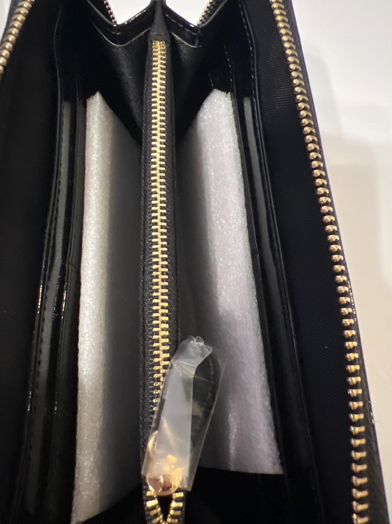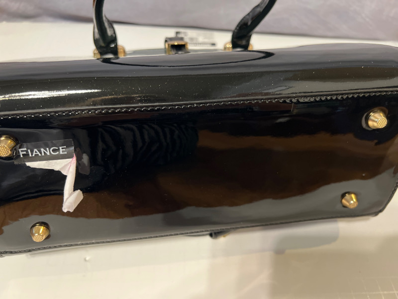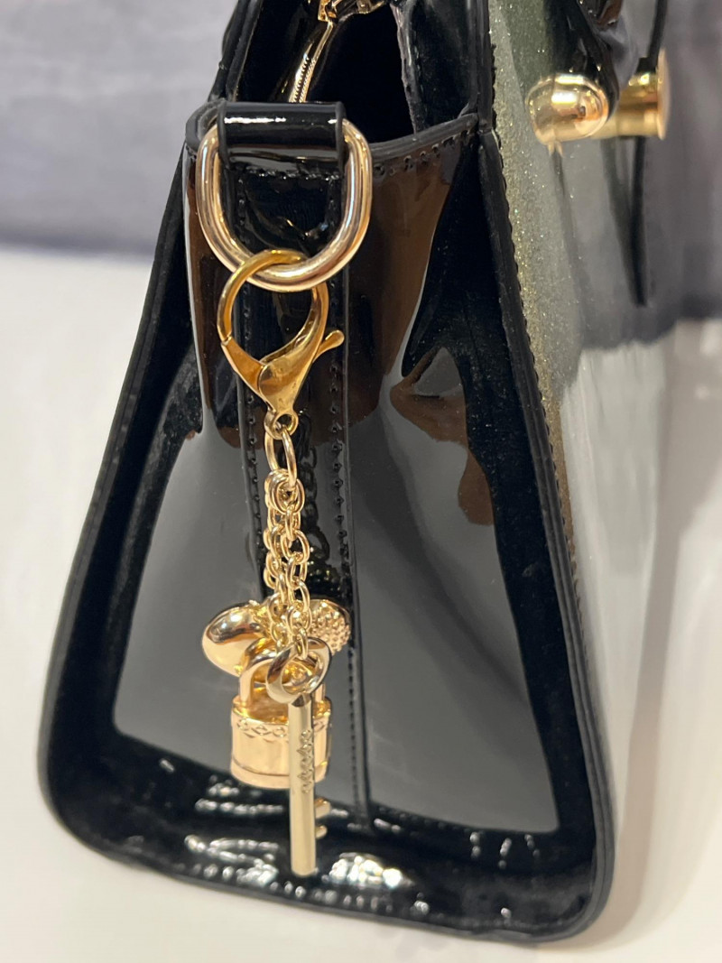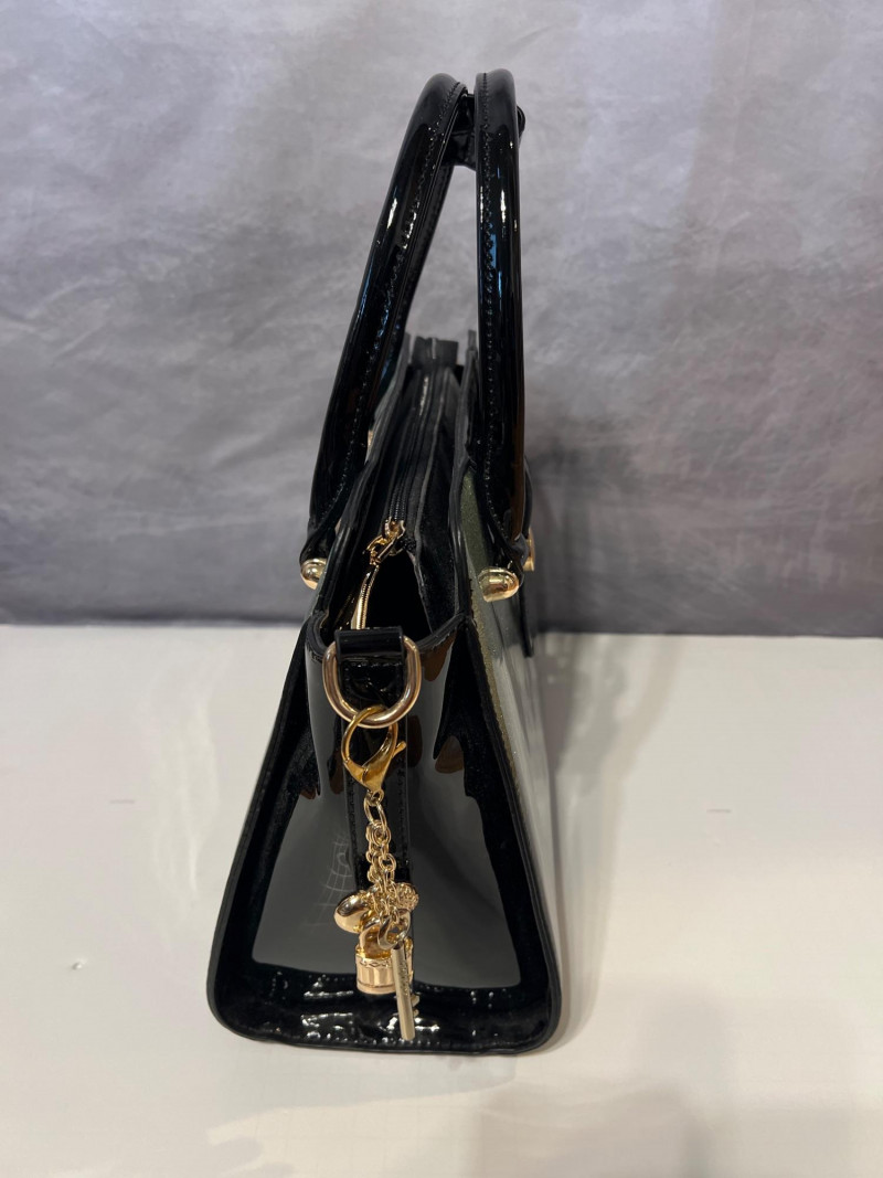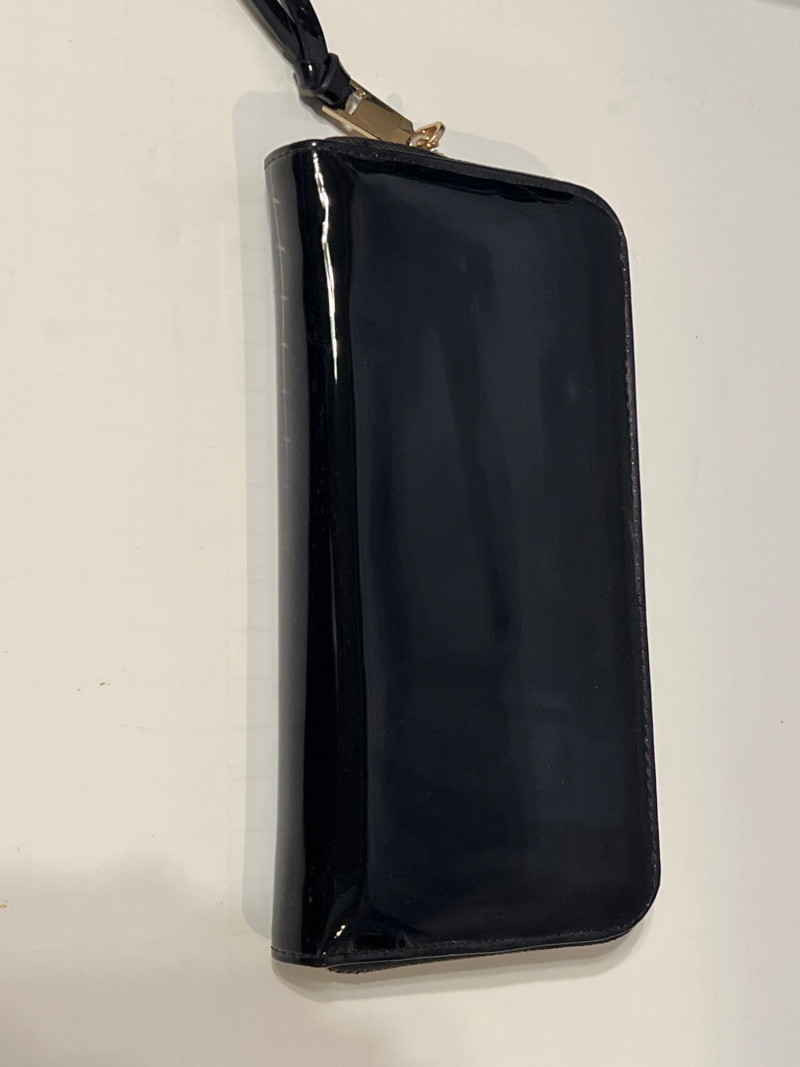 A striking black ombre patent leather handbag paired with a matching coordinating wallet. The glossy finish and gradient color give this set a modern, elevated look, perfect for everyday use or adding a bold accent to an outfit. Attachable shoulder strap included. The handbag offers ample room for essentials, while the wallet provides organized storage in a matching style. It appears to be never used.