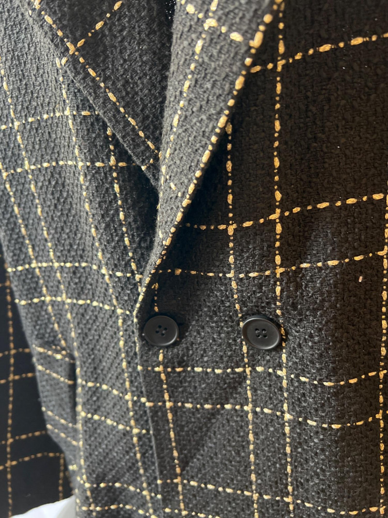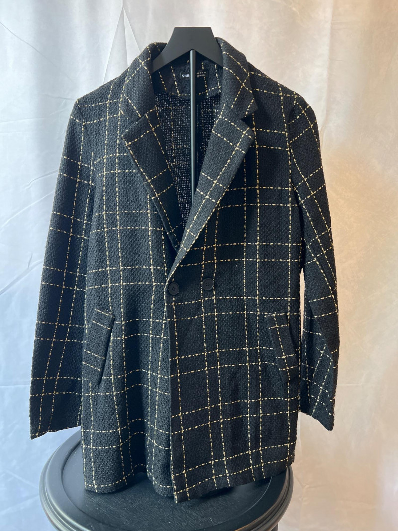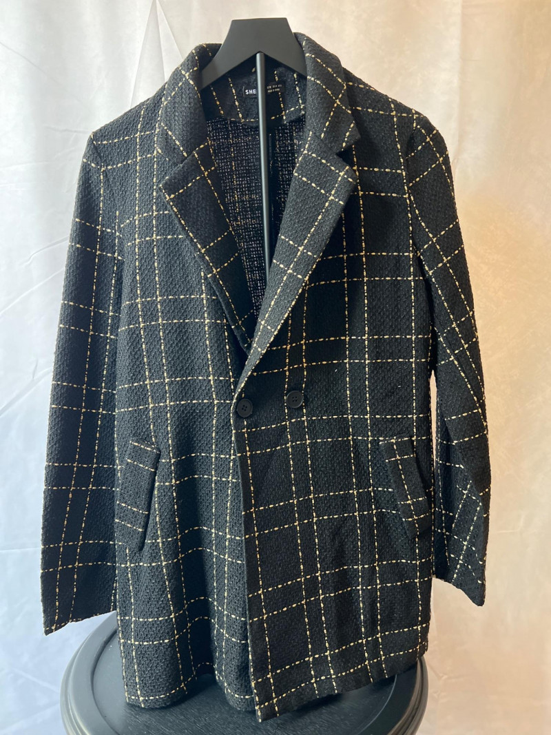 A tailored plaid jacket from SHEIN featuring a double-breasted front and neutral tones. Its structured silhouette and classic patterning make it a versatile piece for seasonal layering or polished everyday wear. Size: Medium (6). Perfect for collectors curating seasonal staples or those seeking a versatile piece with timeless appeal.