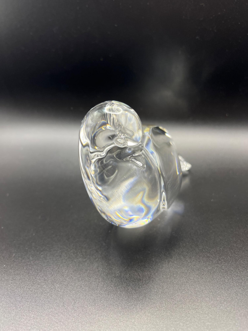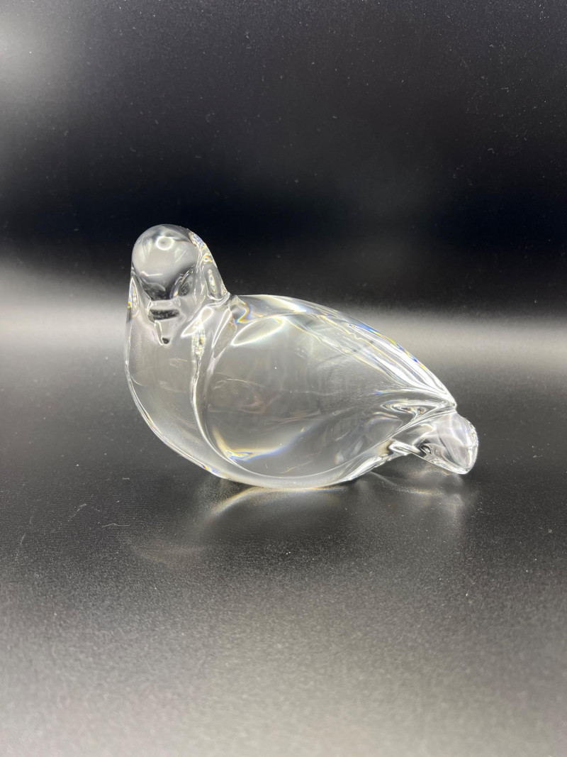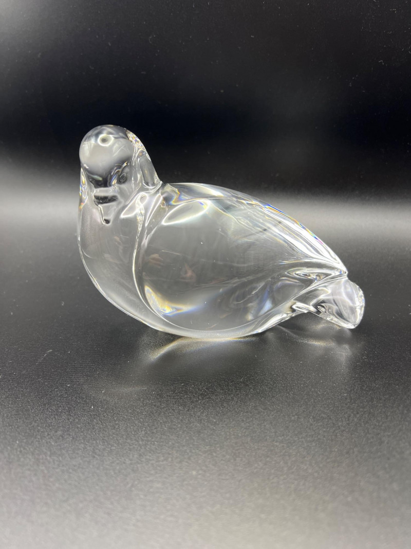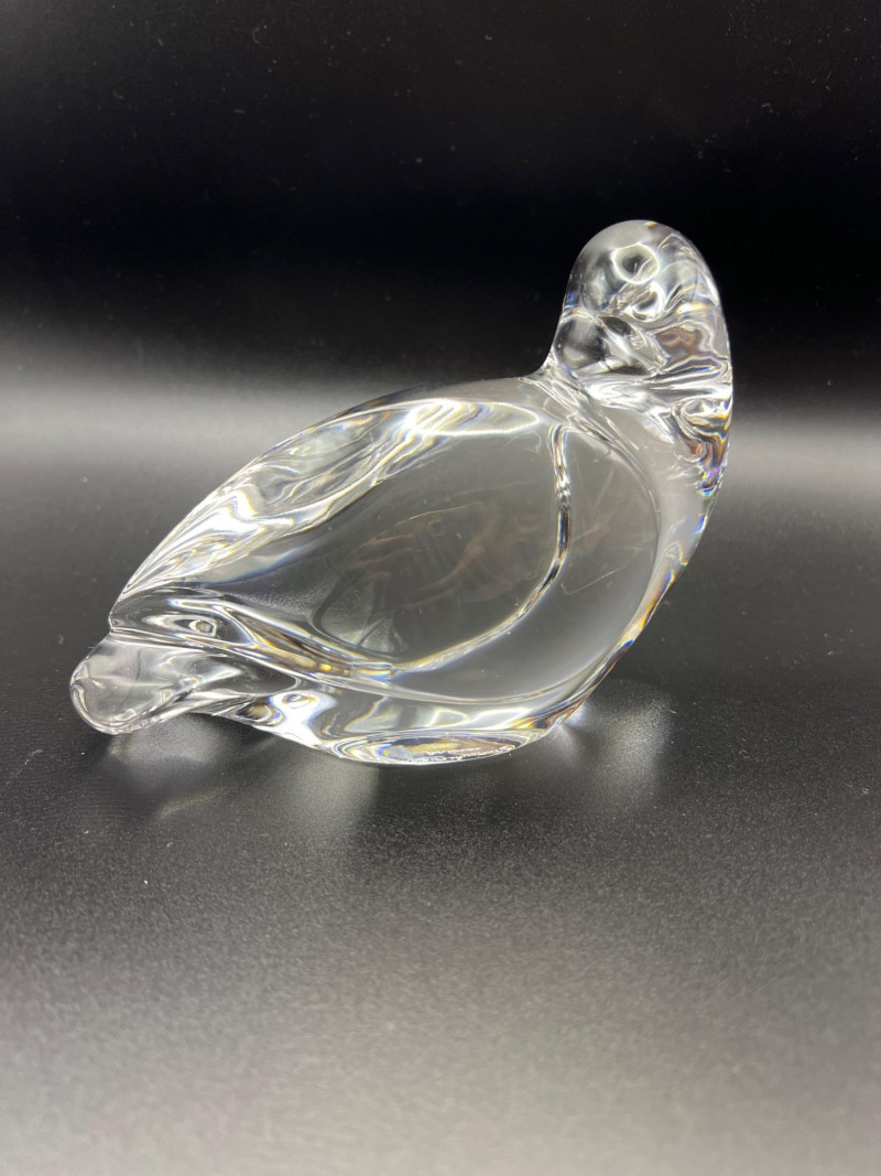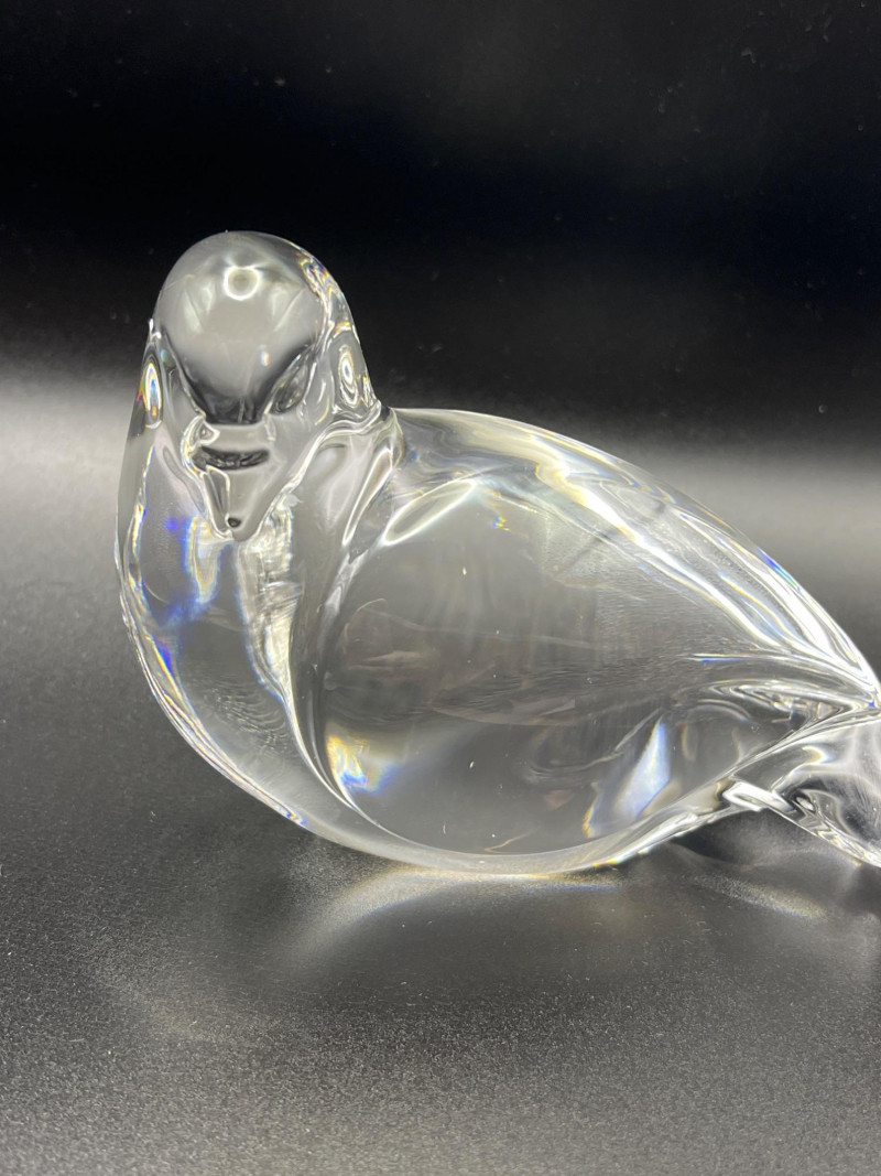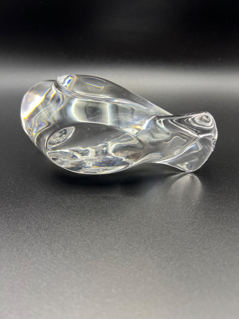 A beautifully crafted clear‑crystal bird sculpture by Val Saint‑Lambert, Belgium’s historic royal glassworks. The piece is signed “Val St Lambert”and etched with the model designation “Des Soiss.”, consistent with the company’s mid‑ to late‑20th‑century production marks. Hand‑blown and hand‑finished, the sculpture features smooth contours, excellent clarity, and the refined craftsmanship that defines Val Saint‑Lambert’s work. A graceful decorative piece and a collectible example from one of Europe’s premier crystal manufacturers.
