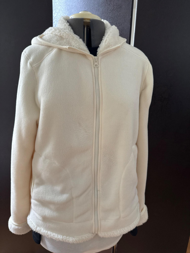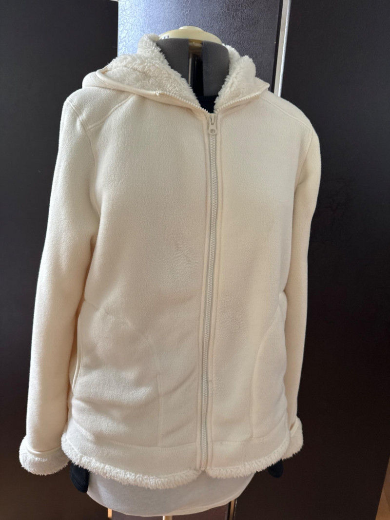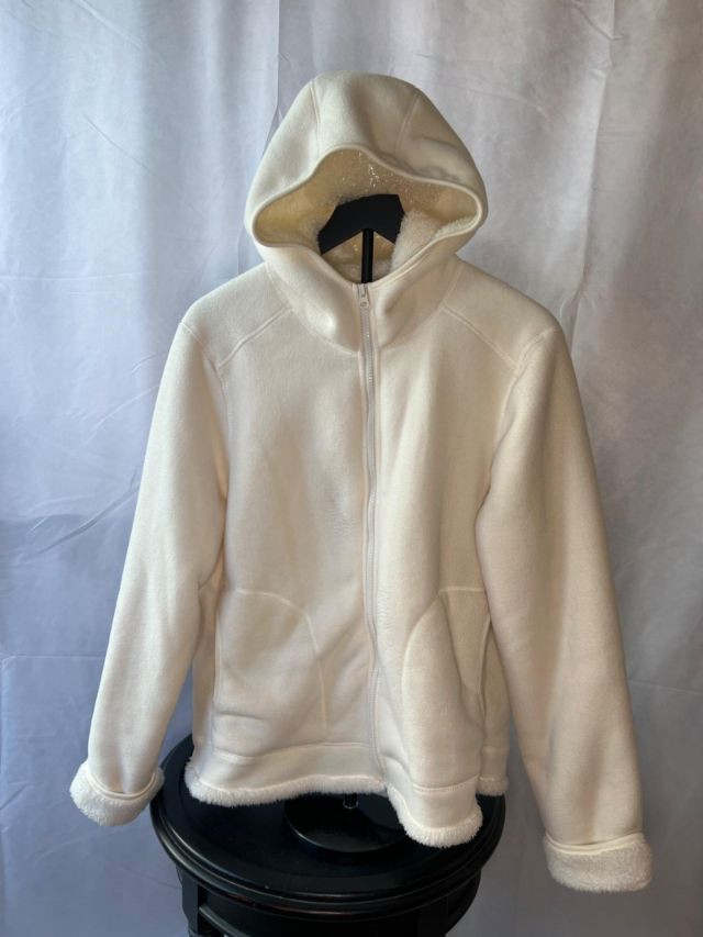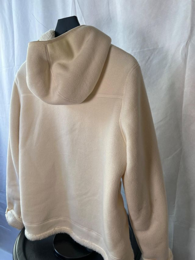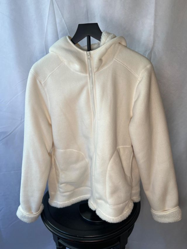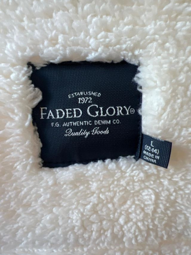 A cozy sherpa-lined jacket from Faded Glory in size L (14-16), designed for warmth and casual layering. Its soft texture and relaxed silhouette make it a versatile staple for cooler days, whether styled for errands or weekend outings. Zip up front and hood.
