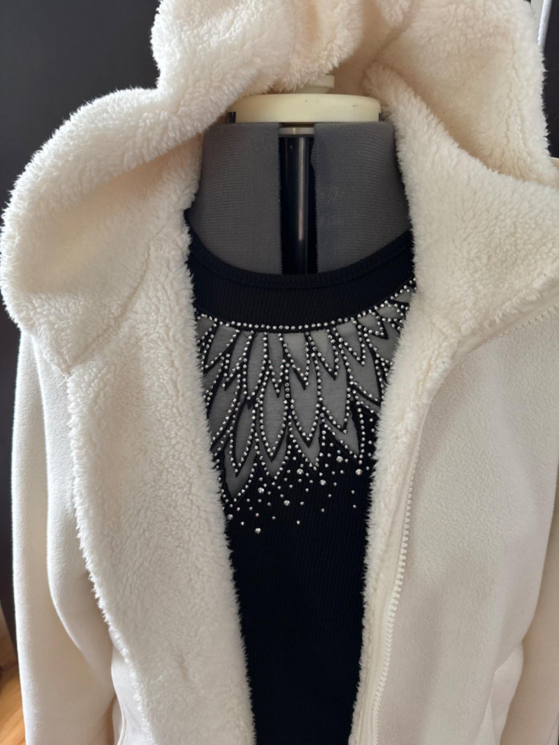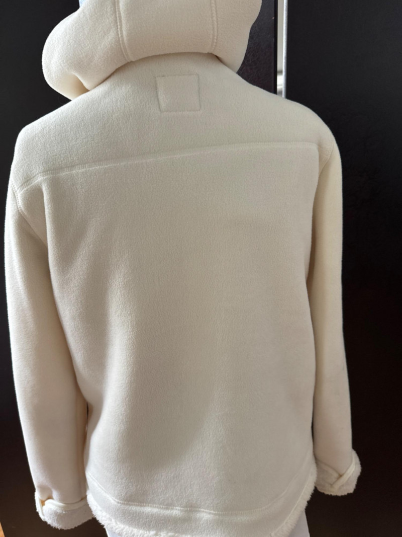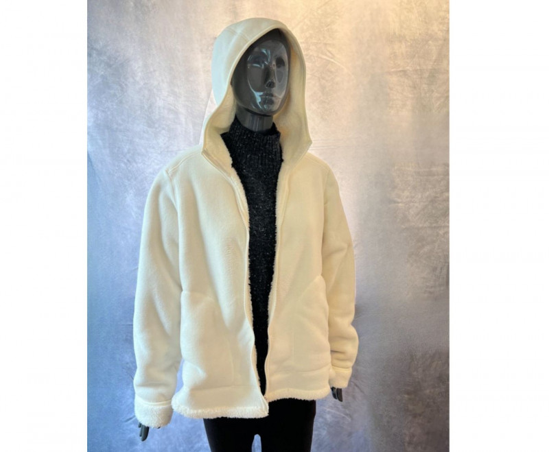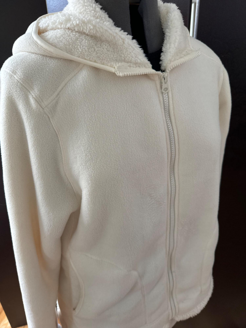 A cozy sherpa-lined jacket from Faded Glory in size L (14-16), designed for warmth and casual layering. Its soft texture and relaxed silhouette make it a versatile staple for cooler days, whether styled for errands or weekend outings. Zip up front and hood.