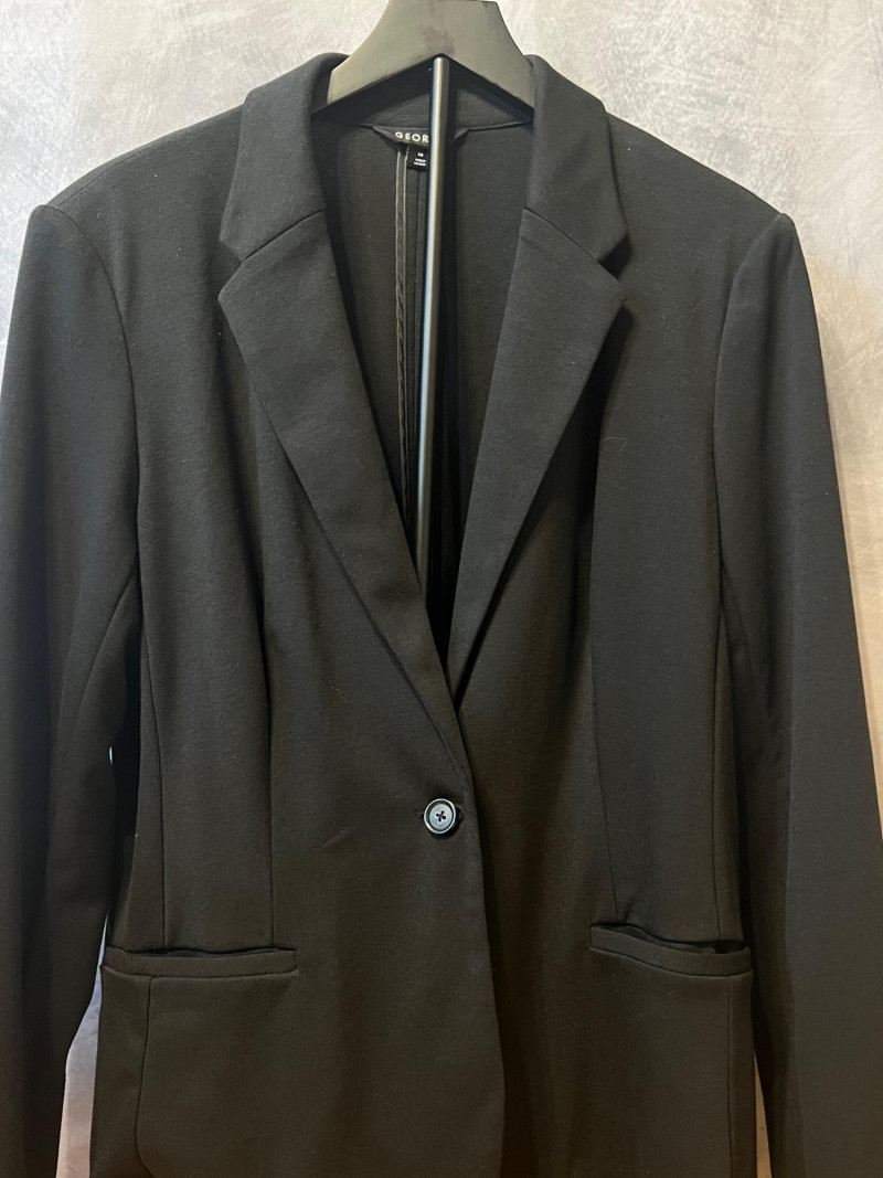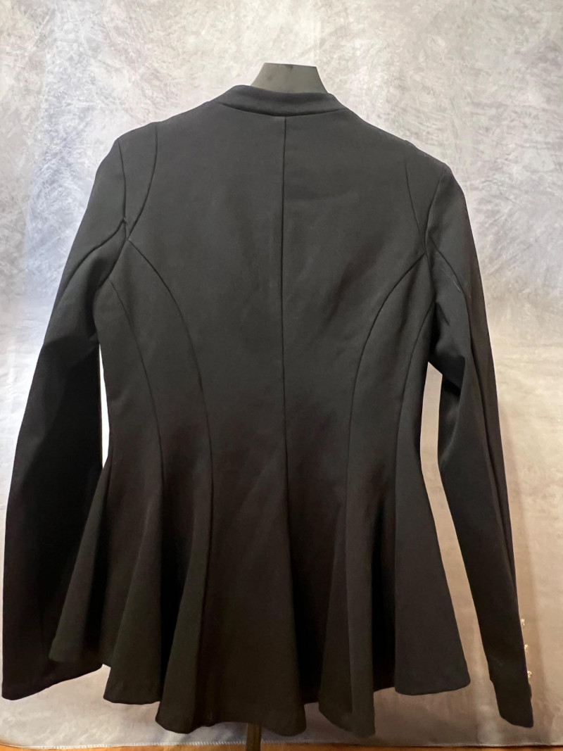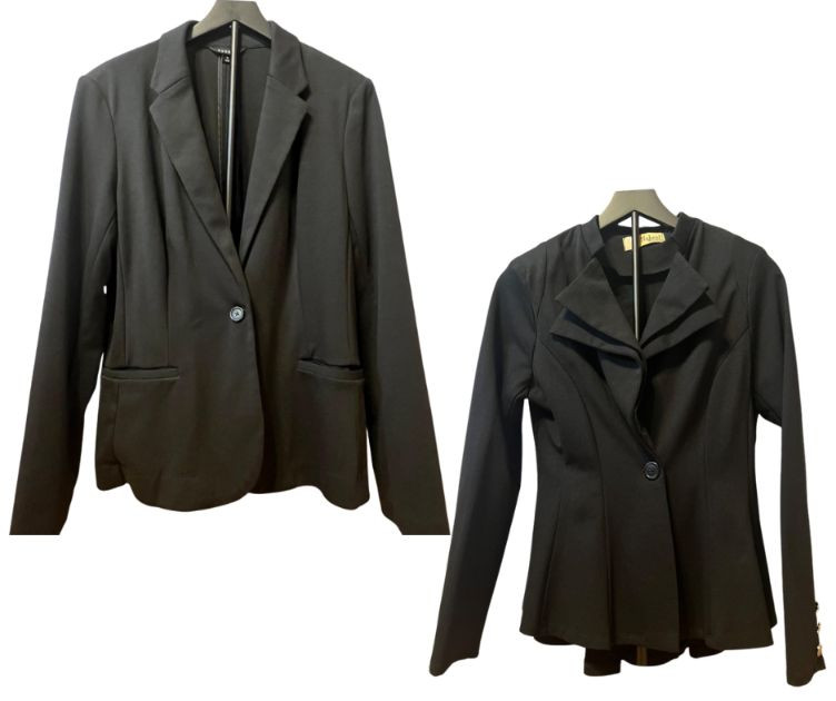 A more sculpted, fashion‑forward blazer featuring a layered lapel design and a subtly flared hemline. Decorative sleeve buttons add a refined touch. Both pieces are in clean, gently worn condition with no noted flaws. A great two‑piece bundle for wardrobe building, resale, or costume design.