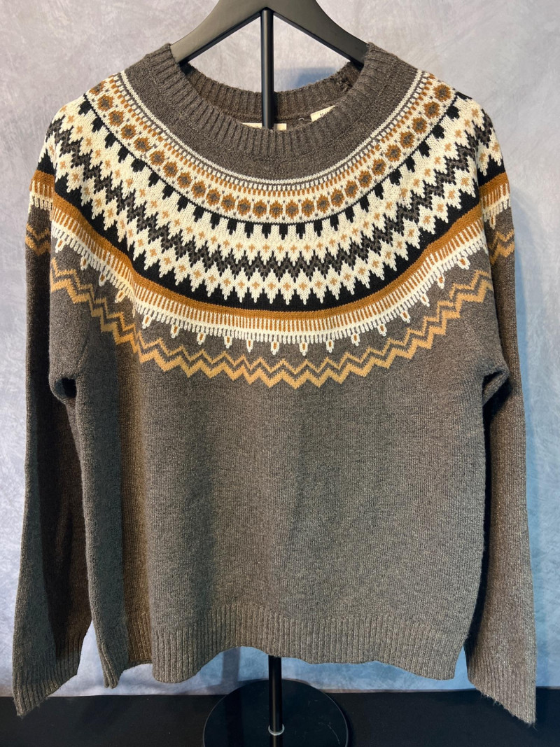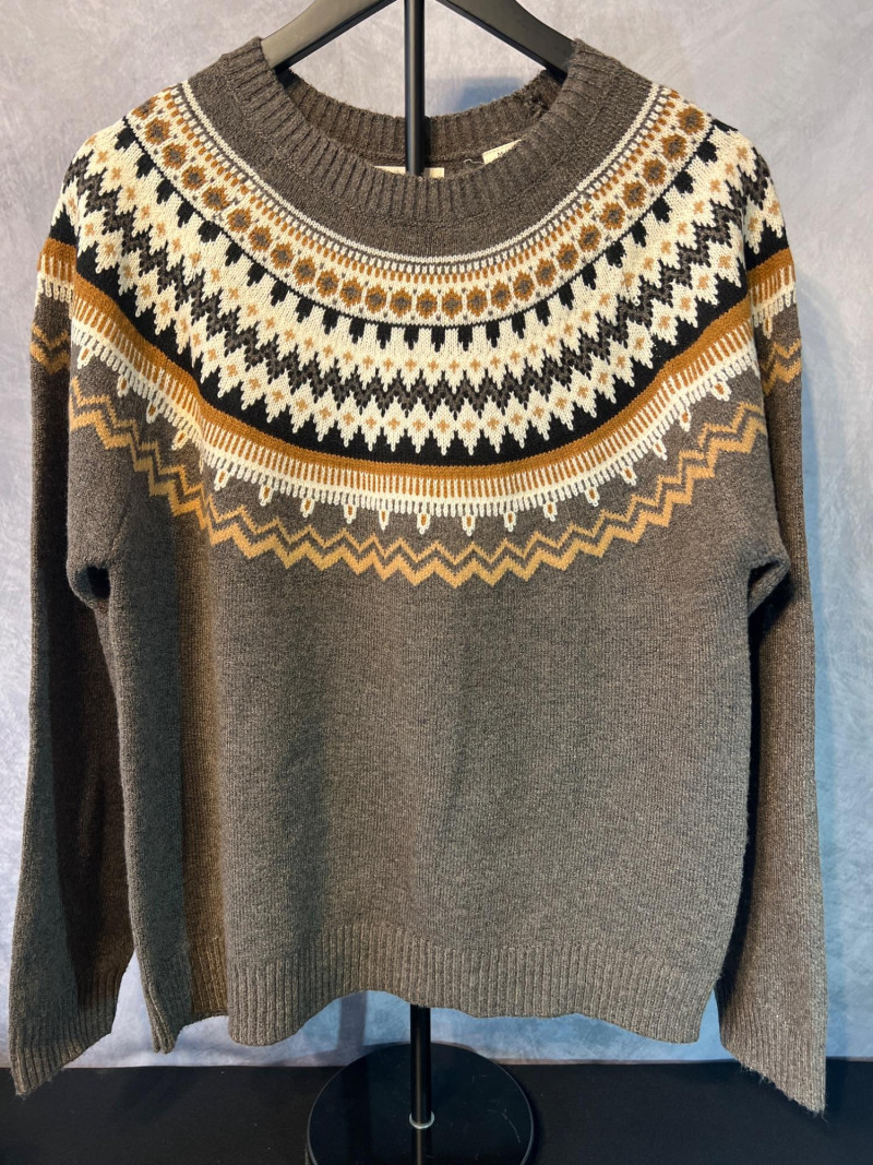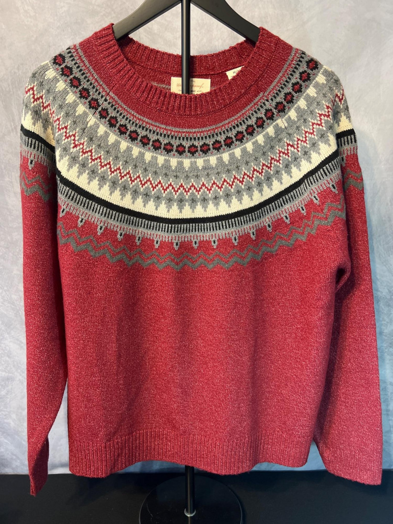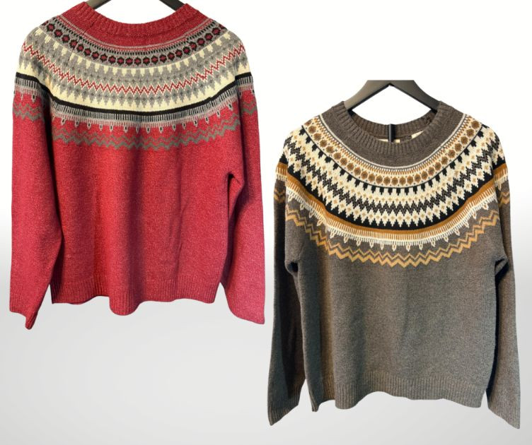 A cozy pair of Weatherproof Vintage knit sweaters in classic Fair Isle yoke designs. Each sweater features a multicolor patterned yoke across the shoulders, inspired by traditional Nordic knitwear. The red sweater offers a bold, wintry palette, while the brown sweater brings a warm, earthy tone with contrasting geometric motifs. Both pieces include ribbed cuffs and hems for a comfortable, timeless fit. A perfect duo for cold‑weather layering, lodge‑style outfits, or collectors of heritage‑inspired knitwear.