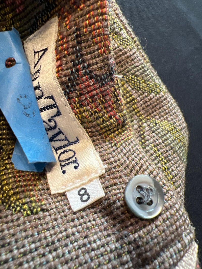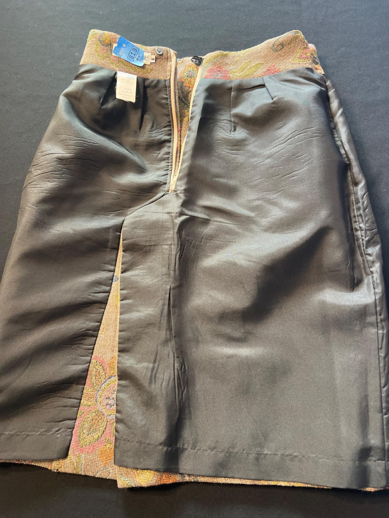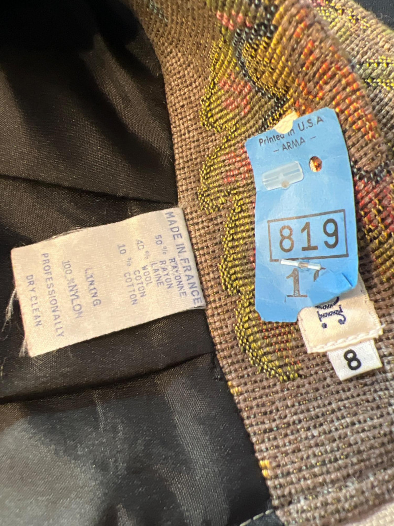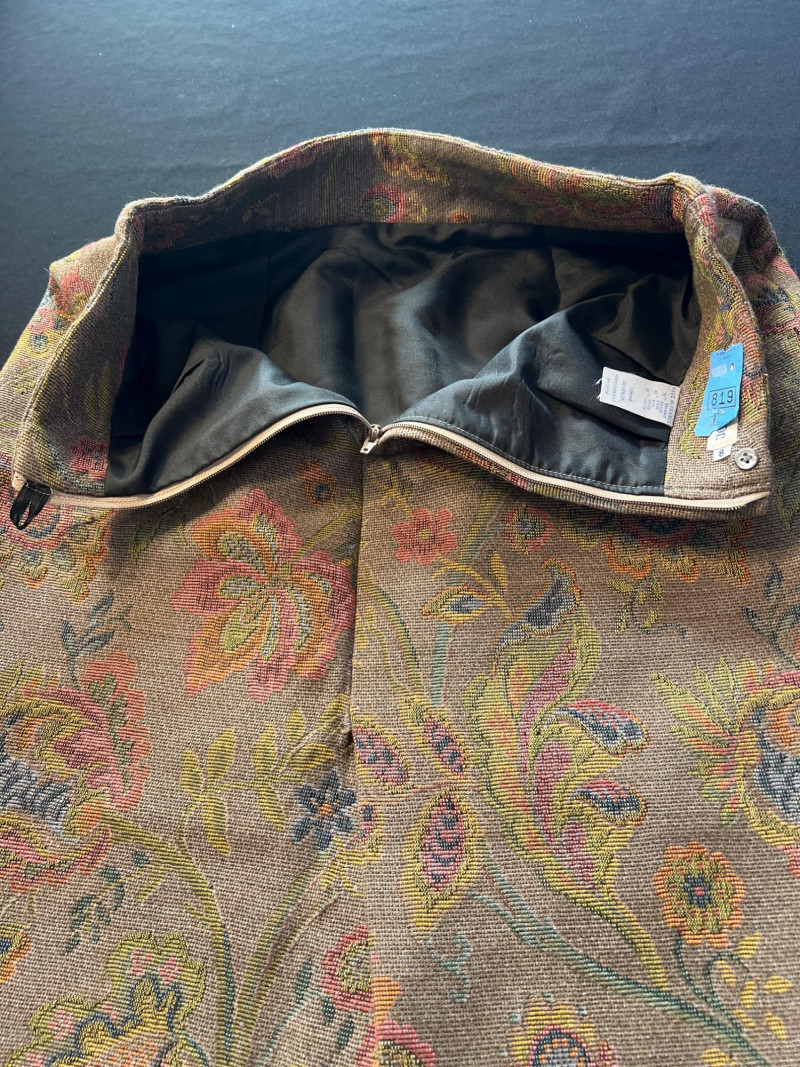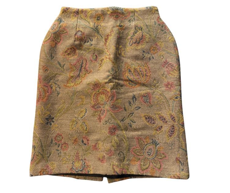 A beautifully constructed vintage Ann Taylor tapestry skirt, made in France and tailored in a structured woven floral fabric. The skirt features a classic high‑waisted silhouette with darted shaping and a softly flared hem, showcasing an intricate multicolor floral pattern reminiscent of traditional French jacquard textiles. The craftsmanship and fabric quality reflect Ann Taylor’s earlier European‑made collections, offering a timeless, elegant piece perfect for fall styling, cottagecore looks, or collectors of vintage woven garments. Fully lined.