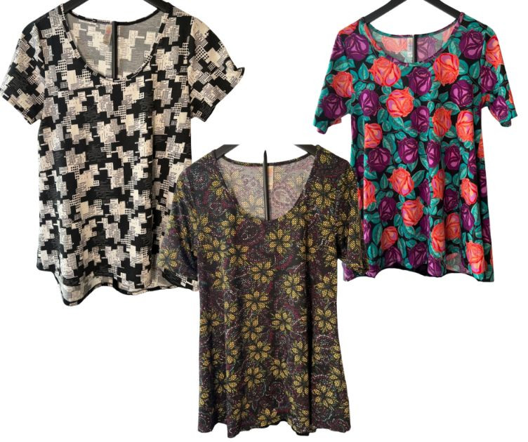 A trio of LuLaRoe printed tops in Size Small, perfect for layering, everyday wear, or boutique resale. Known for their soft fabrics and easy silhouettes, these pieces offer comfort with a pop of pattern and color. A great value bundle for fans of LuLaRoe’s signature comfort and stretch.