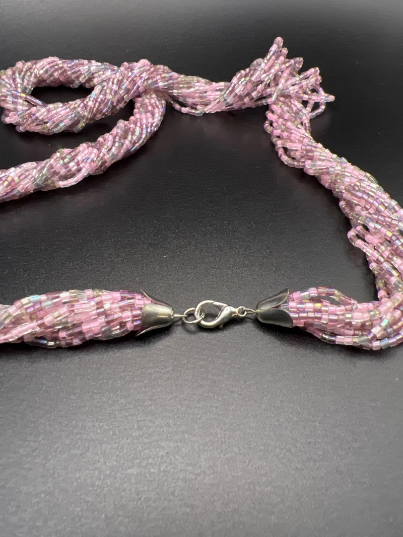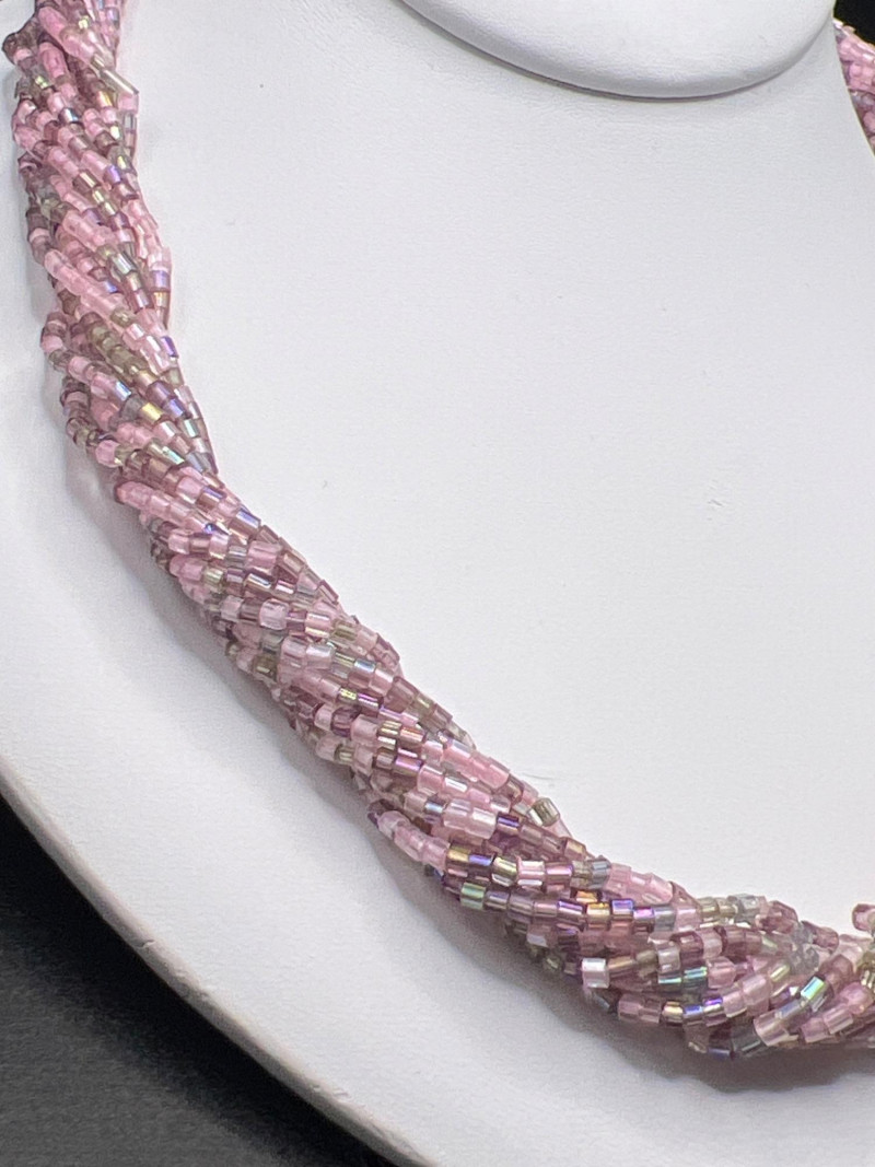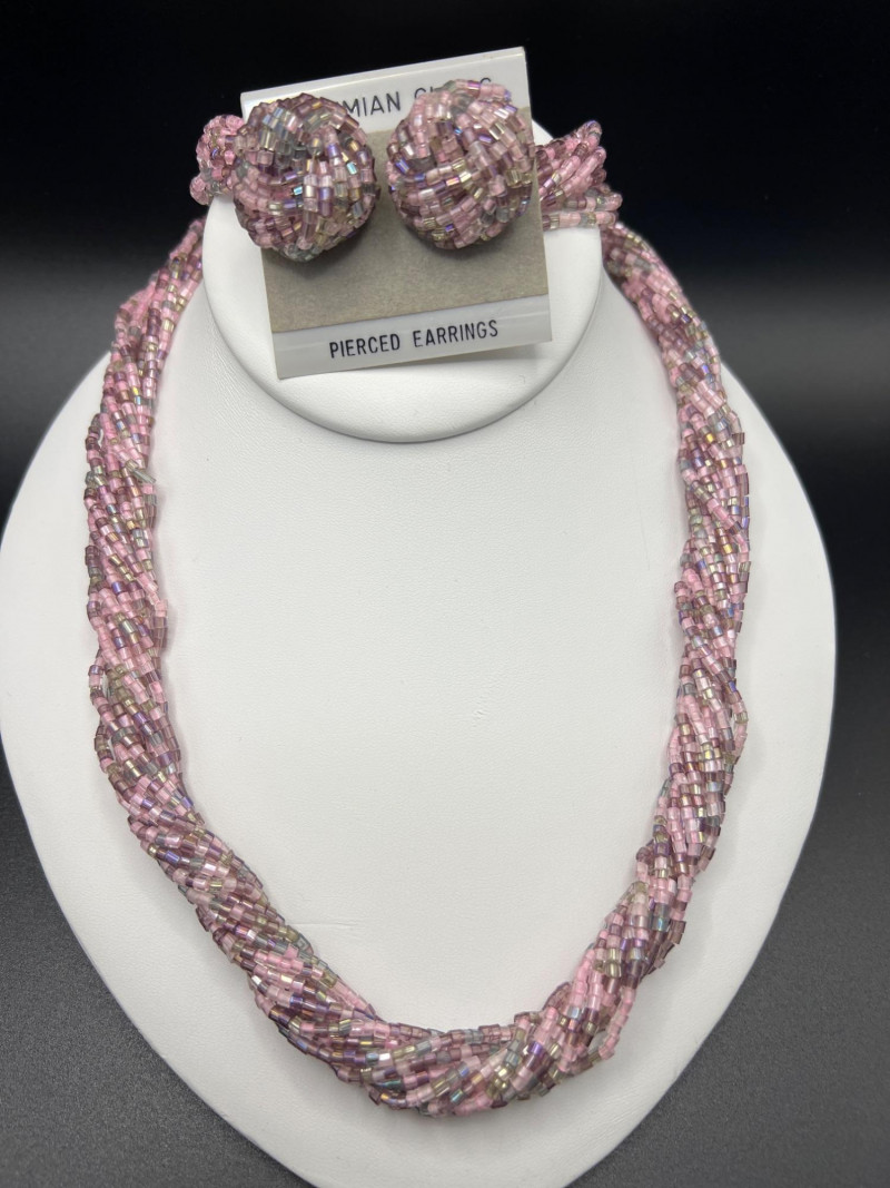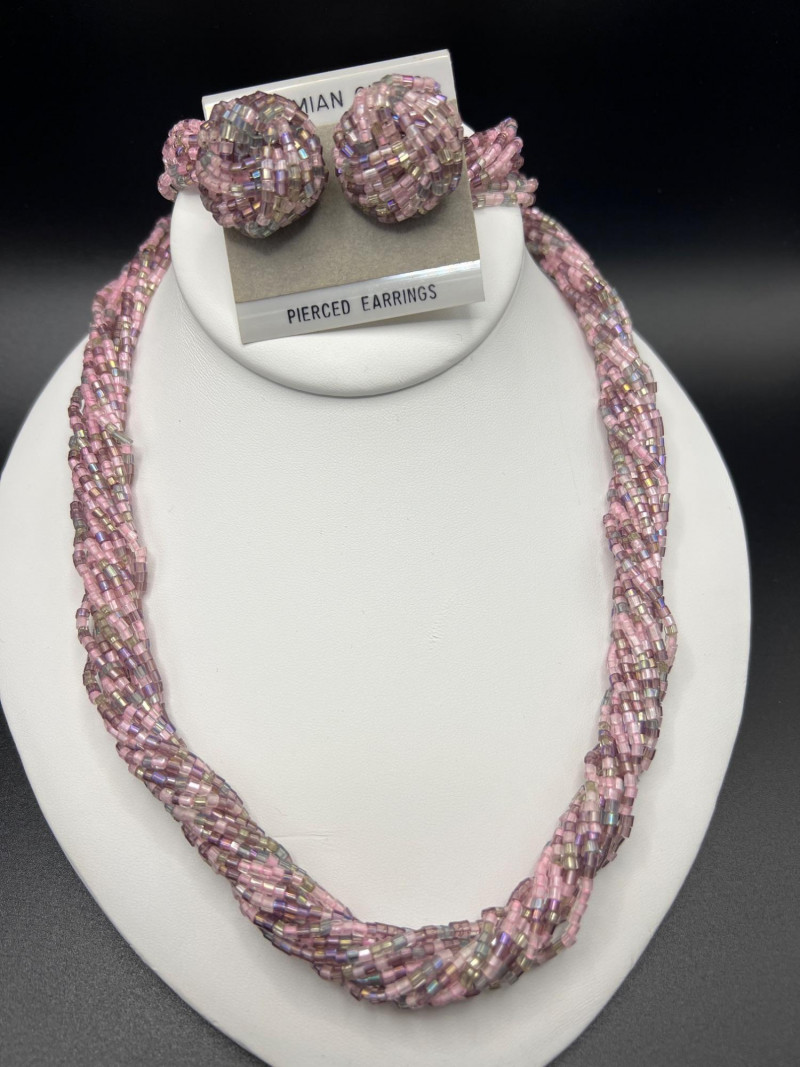 A vibrant Bohemian glass jewelry set featuring a twisted multi‑strand necklace and coordinating pierced earrings. The necklace is crafted from iridescent seed beads in shades of pink, purple, and aurora tones, braided into a richly textured, dimensional design. The matching earrings form spherical clusters of the same glass beads, creating a cohesive and eye‑catching ensemble. Likely dating from the late 1980s to 1990s, this set reflects the colorful, handcrafted beadwork popular in boutique fashion jewelry of the era. A playful yet elegant accessory set that adds shimmer and movement to any outfit.