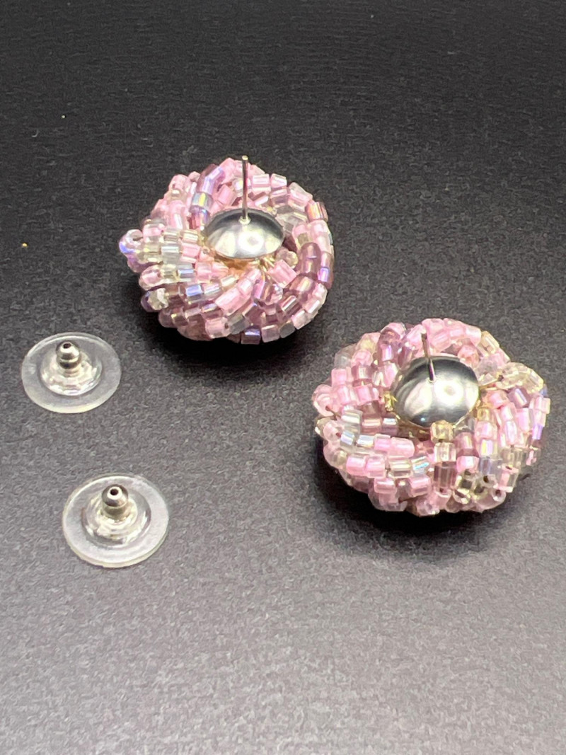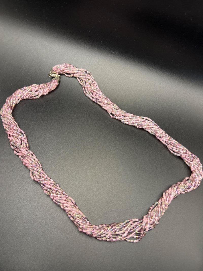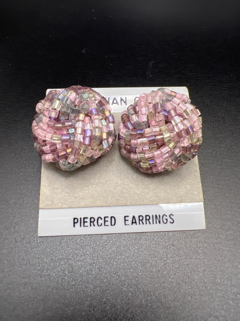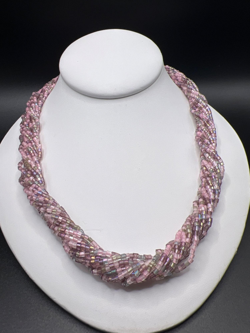 A vibrant Bohemian glass jewelry set featuring a twisted multi‑strand necklace and coordinating pierced earrings. The necklace is crafted from iridescent seed beads in shades of pink, purple, and aurora tones, braided into a richly textured, dimensional design. The matching earrings form spherical clusters of the same glass beads, creating a cohesive and eye‑catching ensemble. Likely dating from the late 1980s to 1990s, this set reflects the colorful, handcrafted beadwork popular in boutique fashion jewelry of the era. A playful yet elegant accessory set that adds shimmer and movement to any outfit.