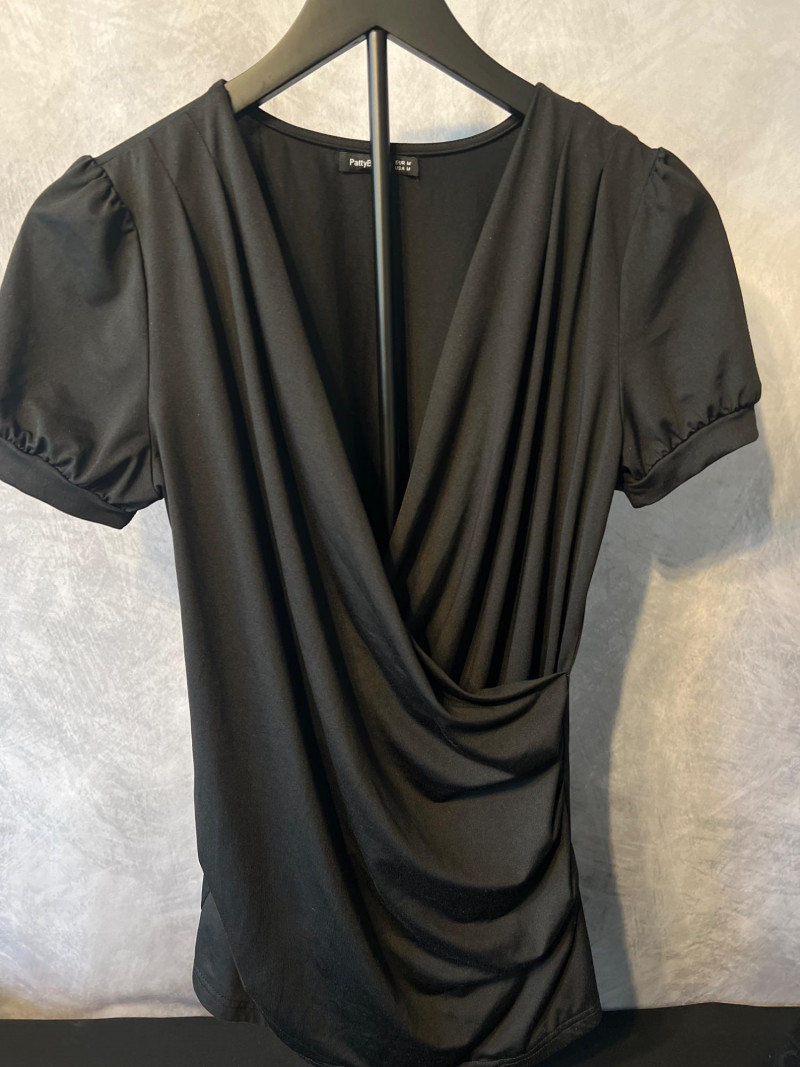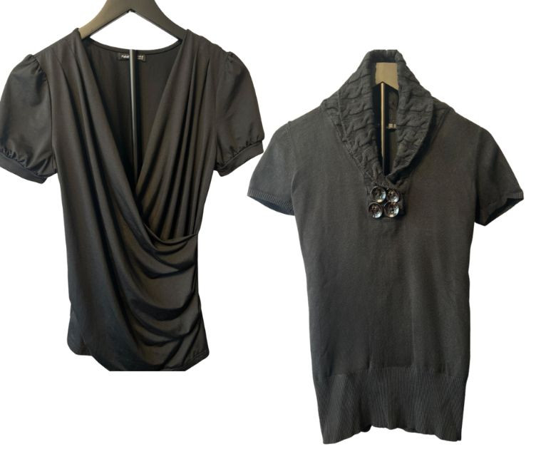 Designed with soft pleated sleeves and a cross‑body draped front, echoing the dramatic, feminine styling popular in the late 70s–80s. The smooth, slightly silky fabric creates a flattering, fluid shape that feels both nostalgic and contemporary. Both tops offer easy wearability in classic black, blending comfort with fashion‑forward detailing. Perfect for everyday outfits, layering, or adding subtle vintage flair to a modern wardrobe.
