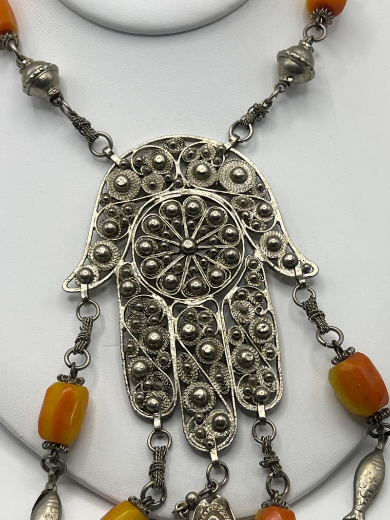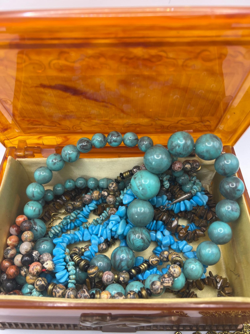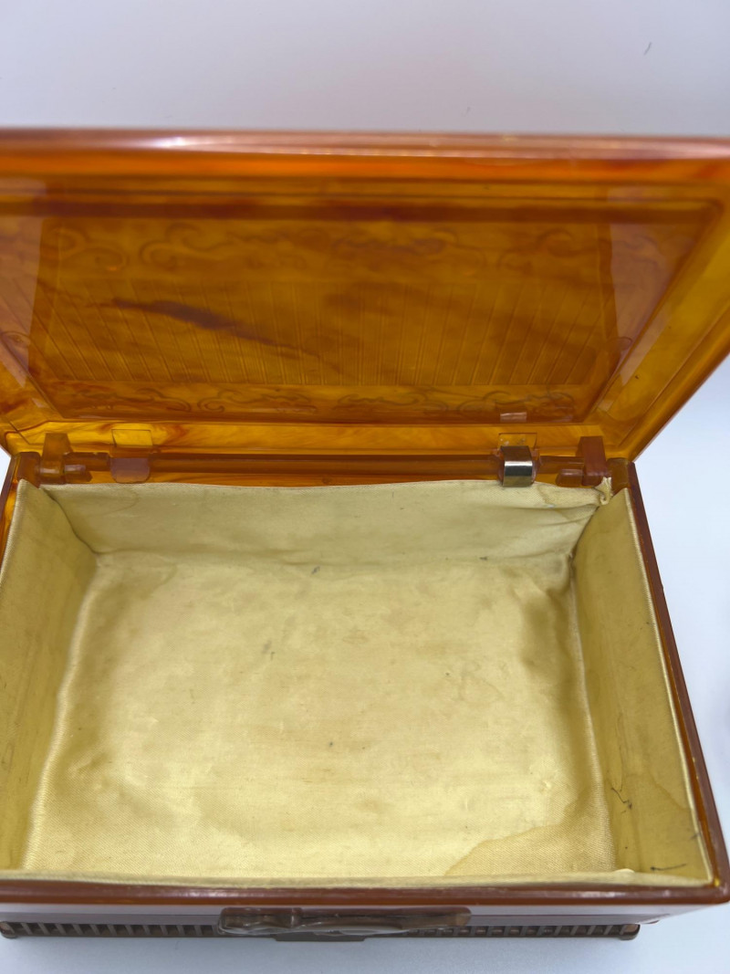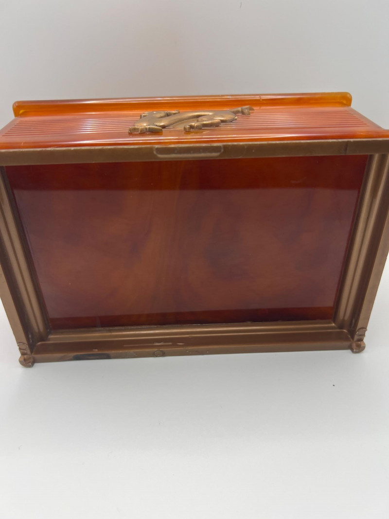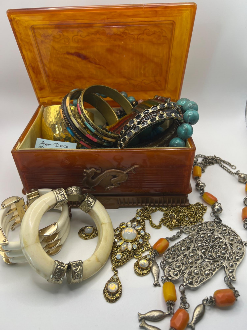 Amber, Bakelite‑style jewelry box (appears to be early phenolic resin style) filled with an eclectic assortment of vintage and vintage‑inspired costume jewelry. The collection includes multiple bracelets, necklaces, and vintage enamel Elleo pin. Ideal for collectors, resellers, or makers seeking wearable vintage costume pieces and display‑ready presentation. Some included items Amber Bakelite‑Style Jewelry Box — Warm amber tone with carved ornamentation and period styling; solid, weighty feel consistent with early phenolic resin cases. Interior holds the jewelry shown. Appears to be Bakelite style; not tested for material. Vargas Marked Faux‑Ivory Segmented Bracelet — Hinged, multi‑segment bracelet with gold‑tone links; stamped Vargas on the interior indicating mid‑20th‑century costume manufacture. Flexible, layered look; good vintage character. Faux‑Ivory Bangle with Blue Cabochon — Solid circular bangle with ornate silver‑tone mounts and a central blue glass or synthetic cabochon; decorative, wearable costume piece. Pair of Brass Inlay Bangles — Golden brass‑tone bangles with colorful rectangular inlays (pink, blue, turquoise) and twisted metal accents; stamped “HAND MADE IN INDIA” on one piece. Handcrafted aesthetic; could be vintage or modern artisan production. Pair of Black Faux‑Stone Bracelets — Brass‑tone bracelets set with oval black cabochons (glass or resin). Black Enamel Hinged Bangle with Magnetic Closure — Glossy black enamel exterior, textured gold‑tone interior, clear rhinestone floral accents, and a magnetic snap closure for easy wear; statement evening/cocktail style. Opalescent Filigree Pendant Necklace — Dressy, vintage‑inspired pendant with filigree metalwork and opalescent stones (central round stone surrounded by smaller stones and teardrop dangles); ornate, antique‑revival aesthetic. Hamsa Hand Filigree Necklace — Large filigree Hamsa pendant with dangling fish charms and orange bead chain; bohemian/ethnic talisman style, ideal as a statement or layering piece.
