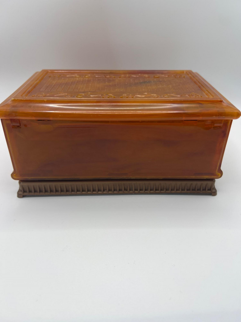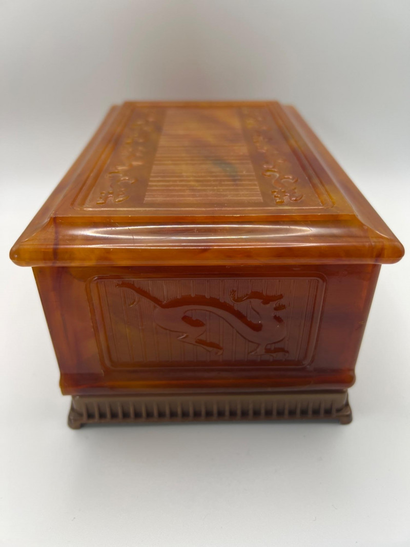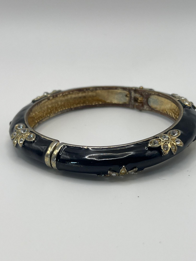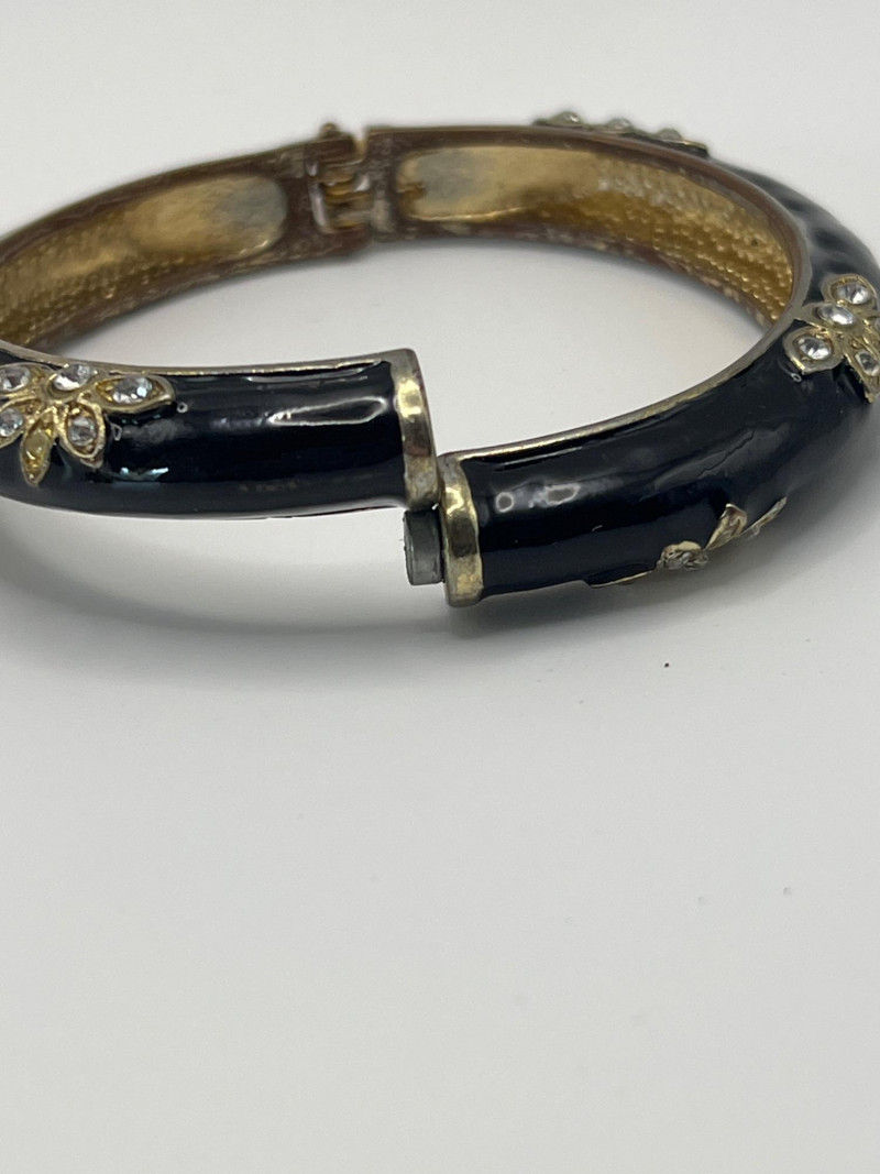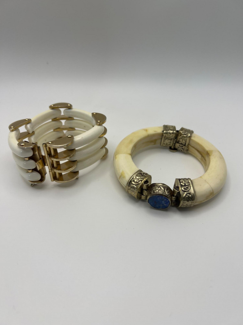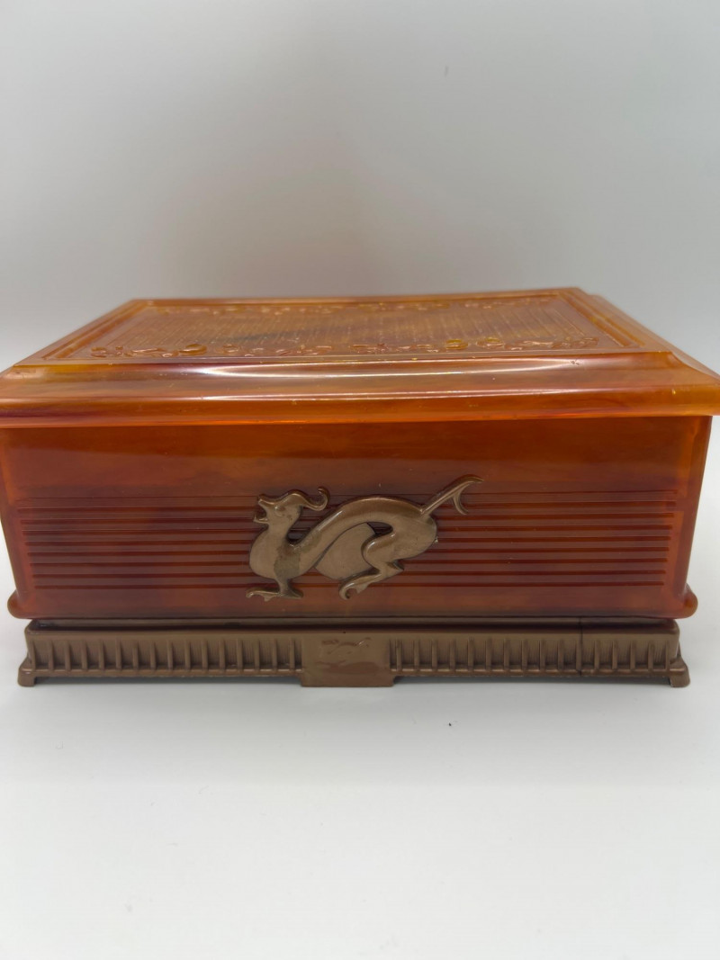 Amber, Bakelite‑style jewelry box (appears to be early phenolic resin style) filled with an eclectic assortment of vintage and vintage‑inspired costume jewelry. The collection includes multiple bracelets, necklaces, and vintage enamel Elleo pin. Ideal for collectors, resellers, or makers seeking wearable vintage costume pieces and display‑ready presentation. Some included items Amber Bakelite‑Style Jewelry Box — Warm amber tone with carved ornamentation and period styling; solid, weighty feel consistent with early phenolic resin cases. Interior holds the jewelry shown. Appears to be Bakelite style; not tested for material. Vargas Marked Faux‑Ivory Segmented Bracelet — Hinged, multi‑segment bracelet with gold‑tone links; stamped Vargas on the interior indicating mid‑20th‑century costume manufacture. Flexible, layered look; good vintage character. Faux‑Ivory Bangle with Blue Cabochon — Solid circular bangle with ornate silver‑tone mounts and a central blue glass or synthetic cabochon; decorative, wearable costume piece. Pair of Brass Inlay Bangles — Golden brass‑tone bangles with colorful rectangular inlays (pink, blue, turquoise) and twisted metal accents; stamped “HAND MADE IN INDIA” on one piece. Handcrafted aesthetic; could be vintage or modern artisan production. Pair of Black Faux‑Stone Bracelets — Brass‑tone bracelets set with oval black cabochons (glass or resin). Black Enamel Hinged Bangle with Magnetic Closure — Glossy black enamel exterior, textured gold‑tone interior, clear rhinestone floral accents, and a magnetic snap closure for easy wear; statement evening/cocktail style. Opalescent Filigree Pendant Necklace — Dressy, vintage‑inspired pendant with filigree metalwork and opalescent stones (central round stone surrounded by smaller stones and teardrop dangles); ornate, antique‑revival aesthetic. Hamsa Hand Filigree Necklace — Large filigree Hamsa pendant with dangling fish charms and orange bead chain; bohemian/ethnic talisman style, ideal as a statement or layering piece.