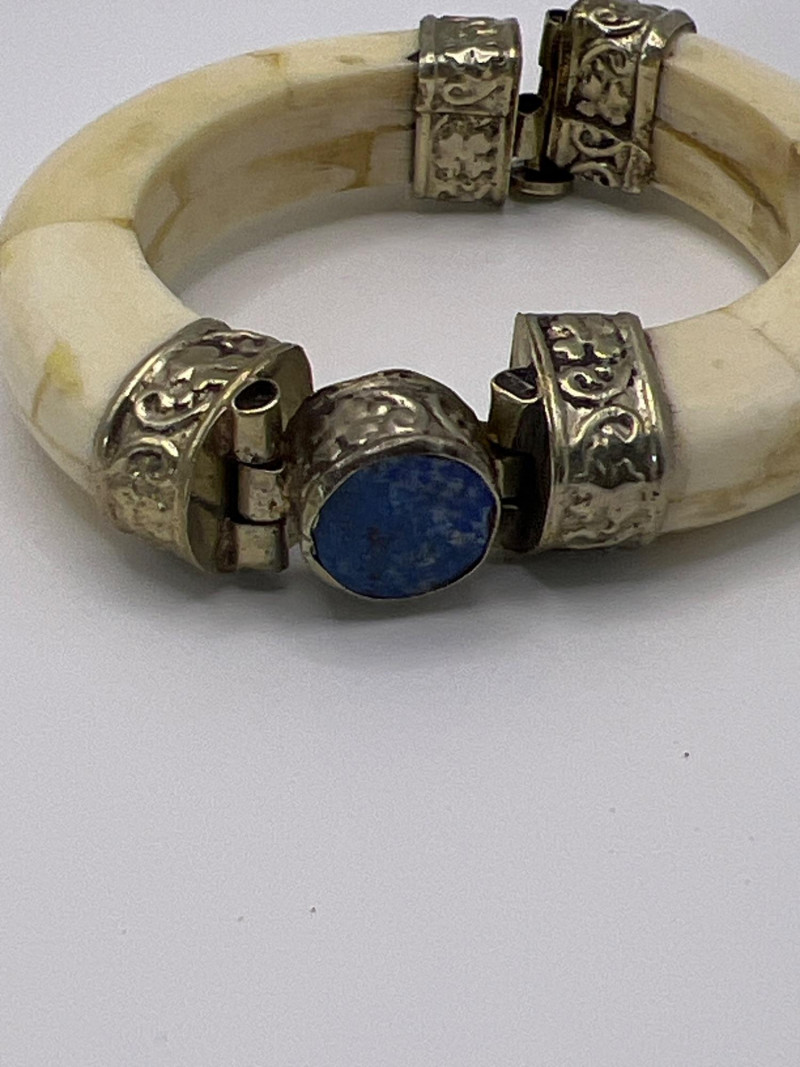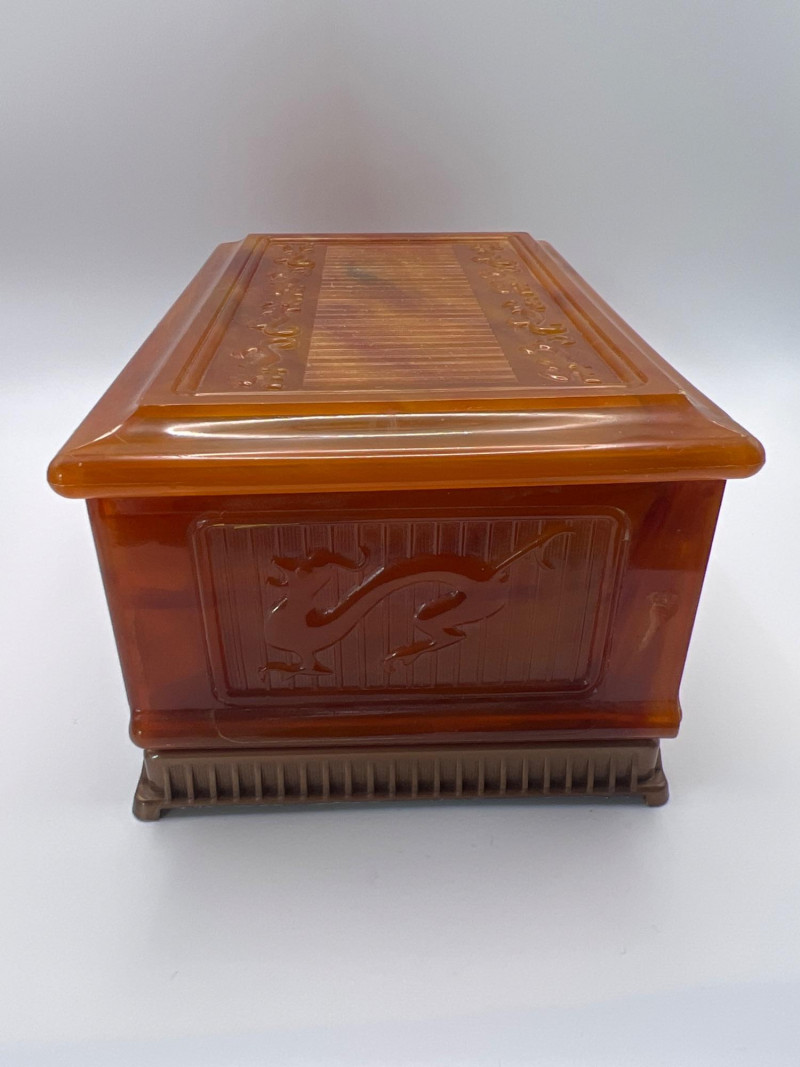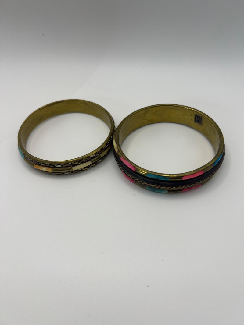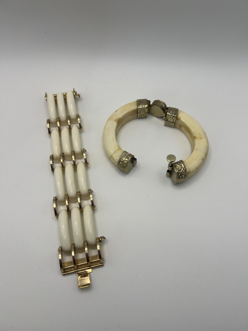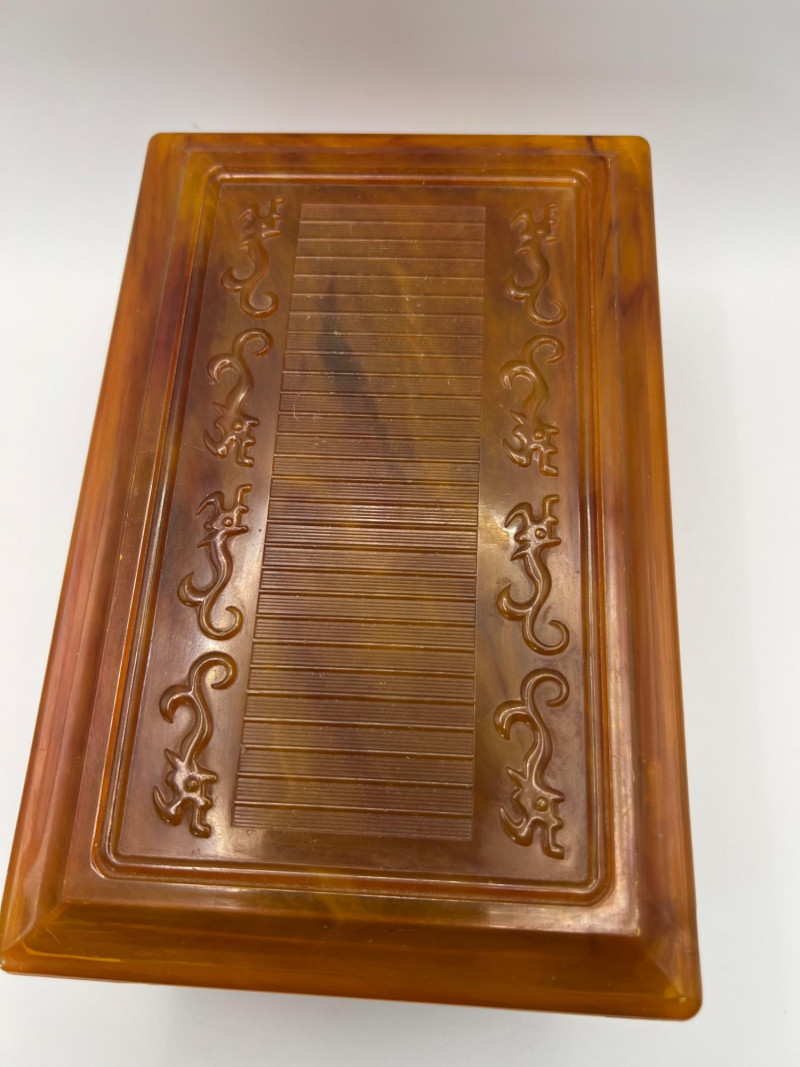 Amber, Bakelite‑style jewelry box (appears to be early phenolic resin style) filled with an eclectic assortment of vintage and vintage‑inspired costume jewelry. The collection includes multiple bracelets, necklaces, and vintage enamel Elleo pin. Ideal for collectors, resellers, or makers seeking wearable vintage costume pieces and display‑ready presentation. Some included items Amber Bakelite‑Style Jewelry Box — Warm amber tone with carved ornamentation and period styling; solid, weighty feel consistent with early phenolic resin cases. Interior holds the jewelry shown. Appears to be Bakelite style; not tested for material. Vargas Marked Faux‑Ivory Segmented Bracelet — Hinged, multi‑segment bracelet with gold‑tone links; stamped Vargas on the interior indicating mid‑20th‑century costume manufacture. Flexible, layered look; good vintage character. Faux‑Ivory Bangle with Blue Cabochon — Solid circular bangle with ornate silver‑tone mounts and a central blue glass or synthetic cabochon; decorative, wearable costume piece. Pair of Brass Inlay Bangles — Golden brass‑tone bangles with colorful rectangular inlays (pink, blue, turquoise) and twisted metal accents; stamped “HAND MADE IN INDIA” on one piece. Handcrafted aesthetic; could be vintage or modern artisan production. Pair of Black Faux‑Stone Bracelets — Brass‑tone bracelets set with oval black cabochons (glass or resin). Black Enamel Hinged Bangle with Magnetic Closure — Glossy black enamel exterior, textured gold‑tone interior, clear rhinestone floral accents, and a magnetic snap closure for easy wear; statement evening/cocktail style. Opalescent Filigree Pendant Necklace — Dressy, vintage‑inspired pendant with filigree metalwork and opalescent stones (central round stone surrounded by smaller stones and teardrop dangles); ornate, antique‑revival aesthetic. Hamsa Hand Filigree Necklace — Large filigree Hamsa pendant with dangling fish charms and orange bead chain; bohemian/ethnic talisman style, ideal as a statement or layering piece.