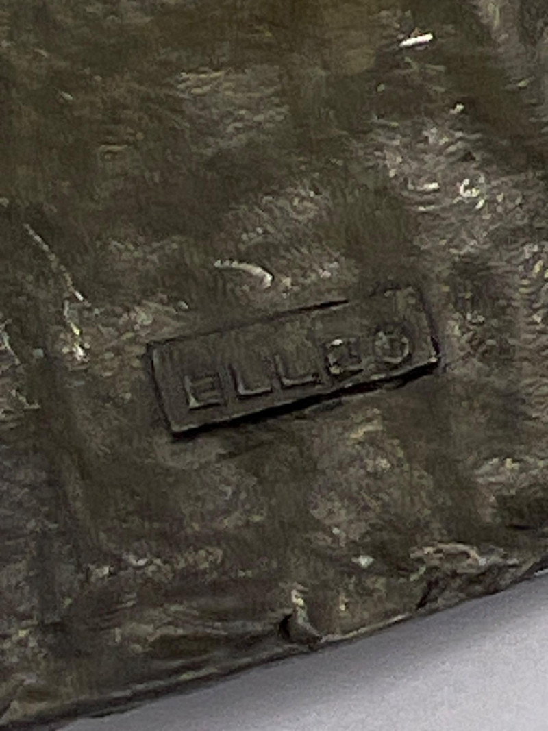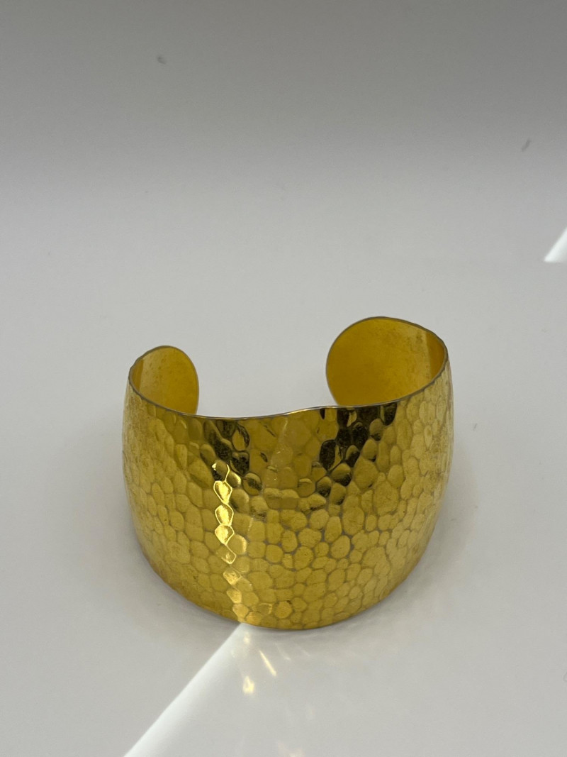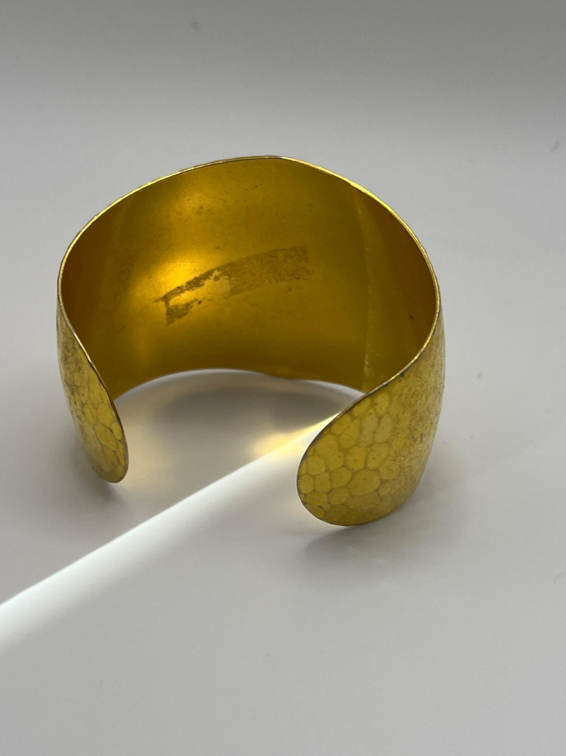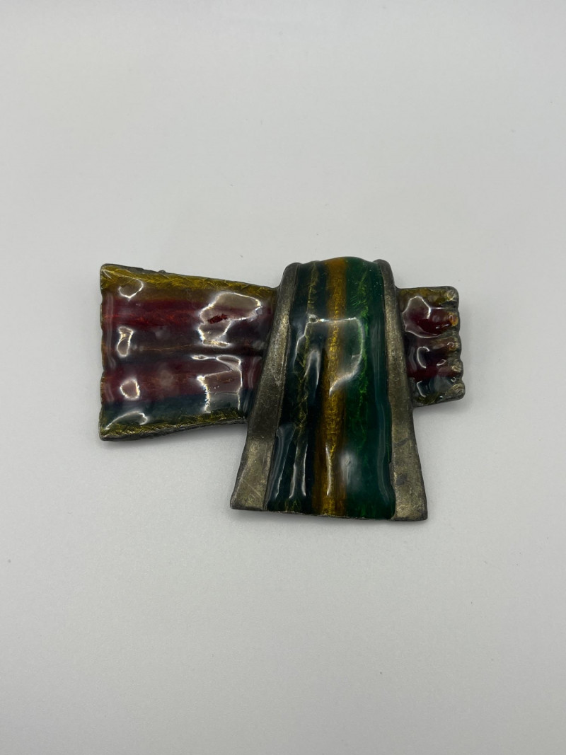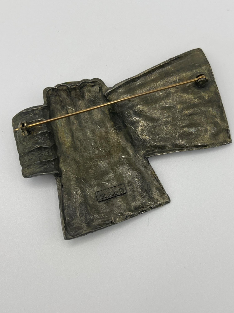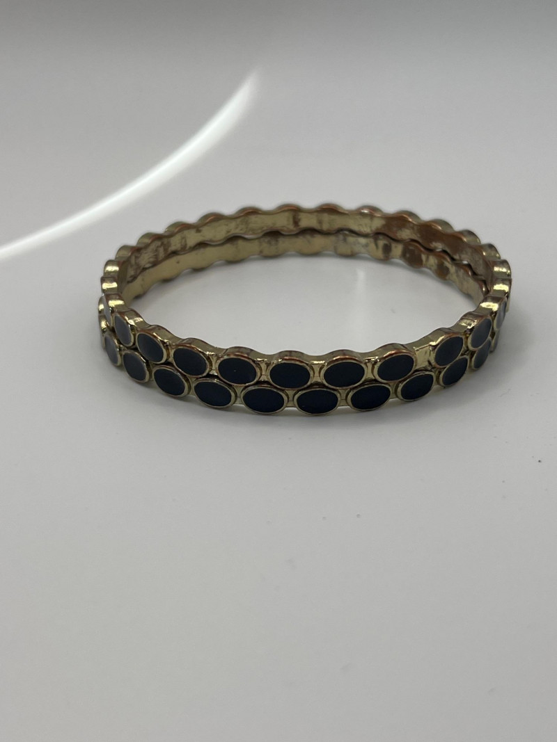 Amber, Bakelite‑style jewelry box (appears to be early phenolic resin style) filled with an eclectic assortment of vintage and vintage‑inspired costume jewelry. The collection includes multiple bracelets, necklaces, and vintage enamel Elleo pin. Ideal for collectors, resellers, or makers seeking wearable vintage costume pieces and display‑ready presentation. Some included items Amber Bakelite‑Style Jewelry Box — Warm amber tone with carved ornamentation and period styling; solid, weighty feel consistent with early phenolic resin cases. Interior holds the jewelry shown. Appears to be Bakelite style; not tested for material. Vargas Marked Faux‑Ivory Segmented Bracelet — Hinged, multi‑segment bracelet with gold‑tone links; stamped Vargas on the interior indicating mid‑20th‑century costume manufacture. Flexible, layered look; good vintage character. Faux‑Ivory Bangle with Blue Cabochon — Solid circular bangle with ornate silver‑tone mounts and a central blue glass or synthetic cabochon; decorative, wearable costume piece. Pair of Brass Inlay Bangles — Golden brass‑tone bangles with colorful rectangular inlays (pink, blue, turquoise) and twisted metal accents; stamped “HAND MADE IN INDIA” on one piece. Handcrafted aesthetic; could be vintage or modern artisan production. Pair of Black Faux‑Stone Bracelets — Brass‑tone bracelets set with oval black cabochons (glass or resin). Black Enamel Hinged Bangle with Magnetic Closure — Glossy black enamel exterior, textured gold‑tone interior, clear rhinestone floral accents, and a magnetic snap closure for easy wear; statement evening/cocktail style. Opalescent Filigree Pendant Necklace — Dressy, vintage‑inspired pendant with filigree metalwork and opalescent stones (central round stone surrounded by smaller stones and teardrop dangles); ornate, antique‑revival aesthetic. Hamsa Hand Filigree Necklace — Large filigree Hamsa pendant with dangling fish charms and orange bead chain; bohemian/ethnic talisman style, ideal as a statement or layering piece.