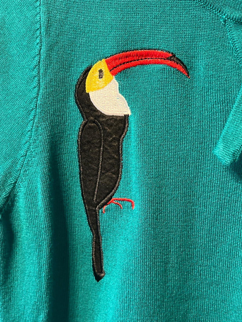 Turquoise Belle Poque knit sweater with an embroidered toucan on the bodice and a soft bow at the neckline. Mid‑sleeve style with a ribbed hem and playful, retro‑novelty vibe. Size M.