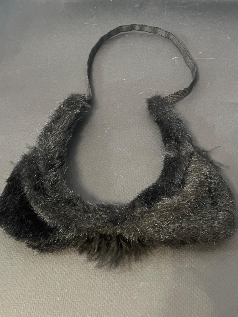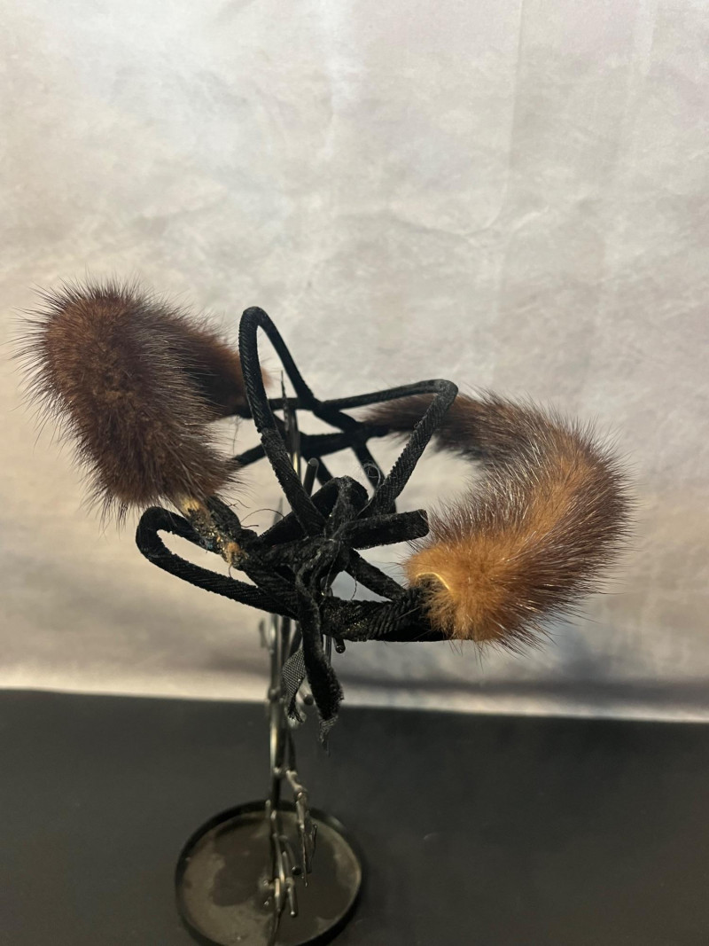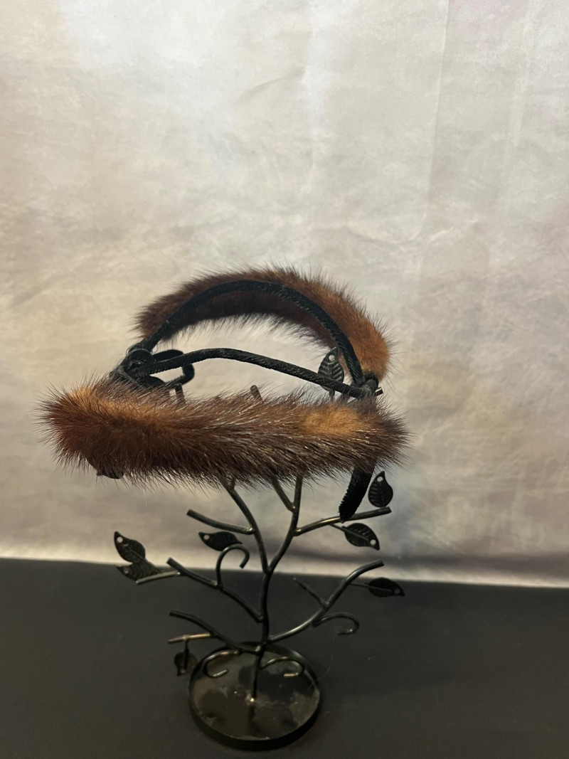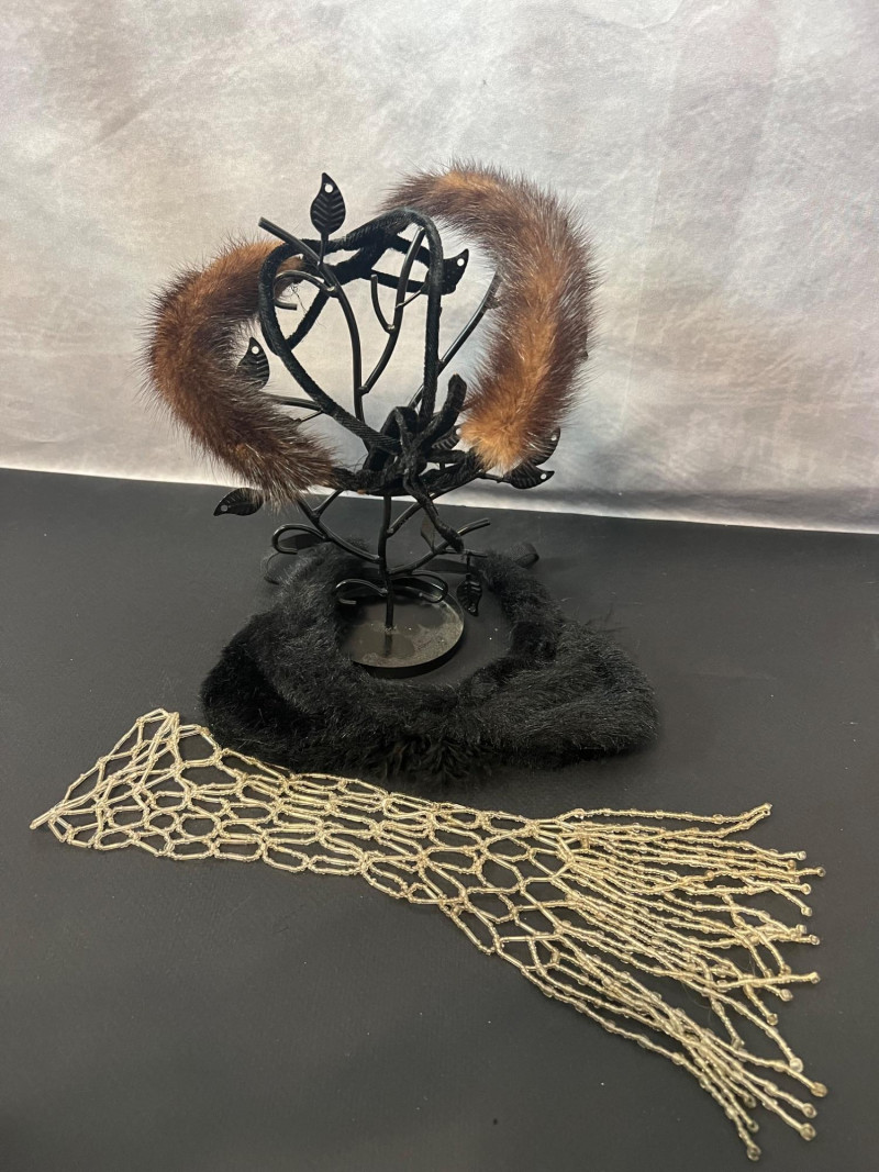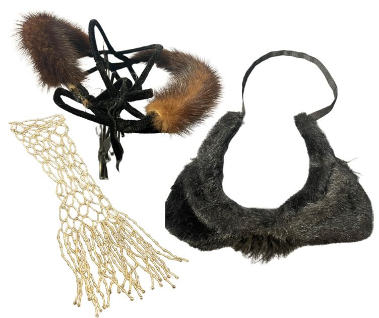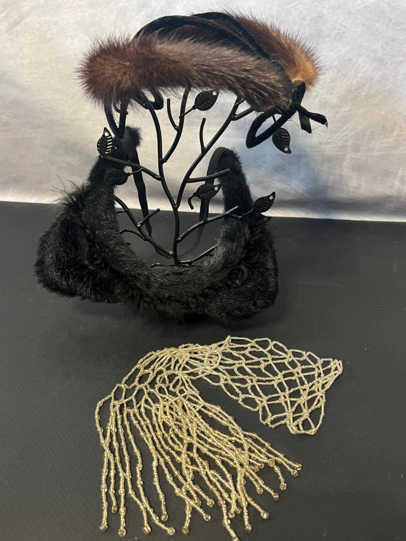 This lot includes: Wire & Faux Fur Hat — an expressive headpiece crafted on a structured wire base, accented with soft faux fur for dramatic silhouette and texture. Faux Fur Collar — a plush, dark collar designed to fasten at the neck, adding warmth and a touch of mid‑century glamour. Beaded Accessory — an intricate mesh‑style beaded piece with draped strands, wearable as a necklace, collar, or styling accent. Together, these pieces offer a rare glimpse into the inventive artistry of post‑war fashion — ideal for collectors, stylists, costumers, and lovers of sculptural vintage design.