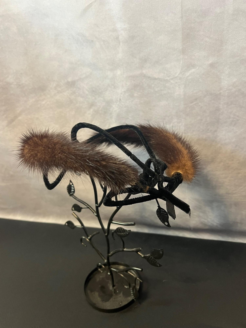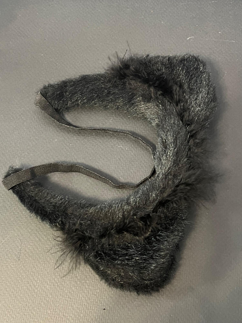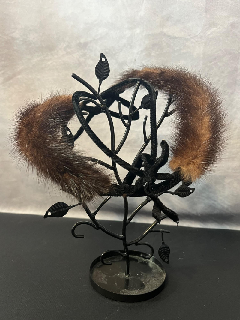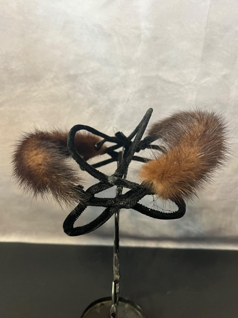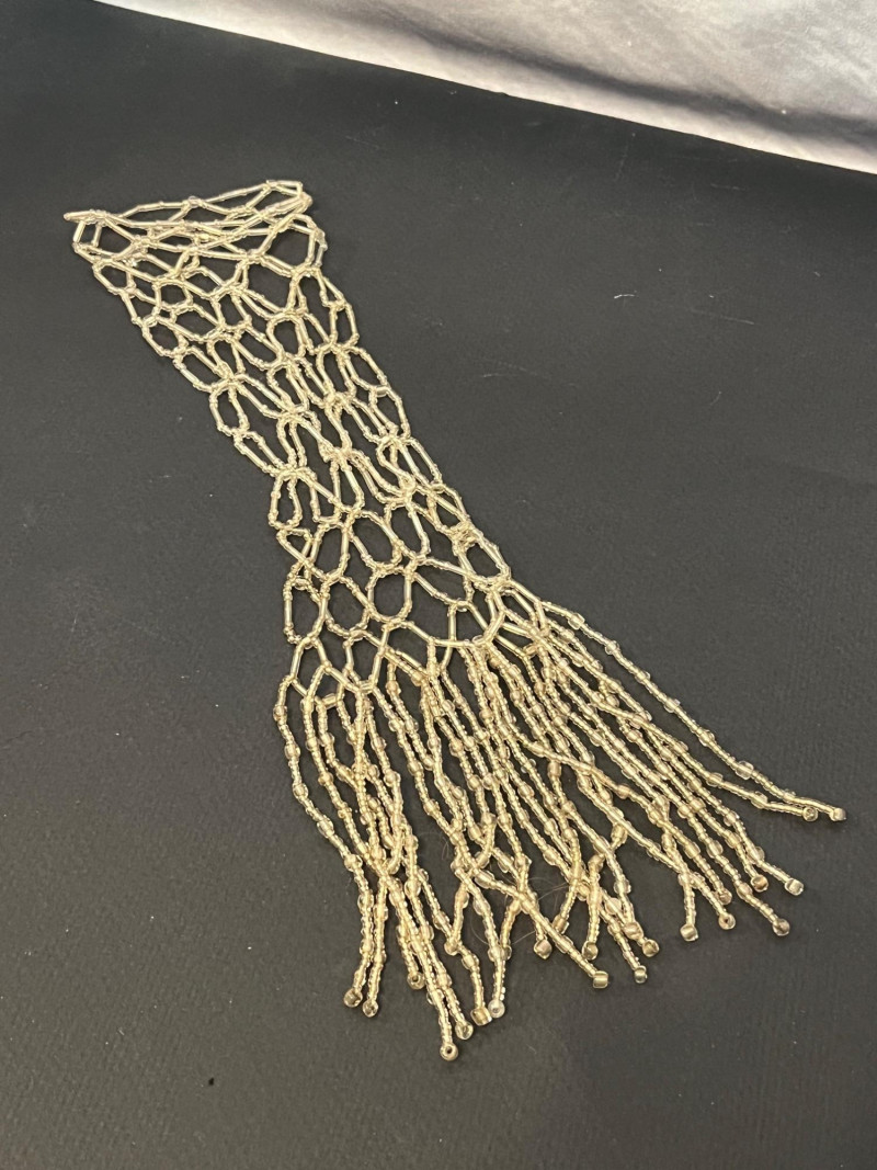 This lot includes: Wire & Faux Fur Hat — an expressive headpiece crafted on a structured wire base, accented with soft faux fur for dramatic silhouette and texture. Faux Fur Collar — a plush, dark collar designed to fasten at the neck, adding warmth and a touch of mid‑century glamour. Beaded Accessory — an intricate mesh‑style beaded piece with draped strands, wearable as a necklace, collar, or styling accent. Together, these pieces offer a rare glimpse into the inventive artistry of post‑war fashion — ideal for collectors, stylists, costumers, and lovers of sculptural vintage design.