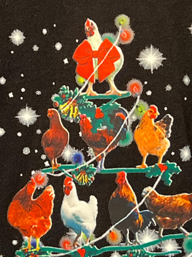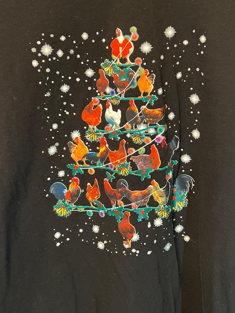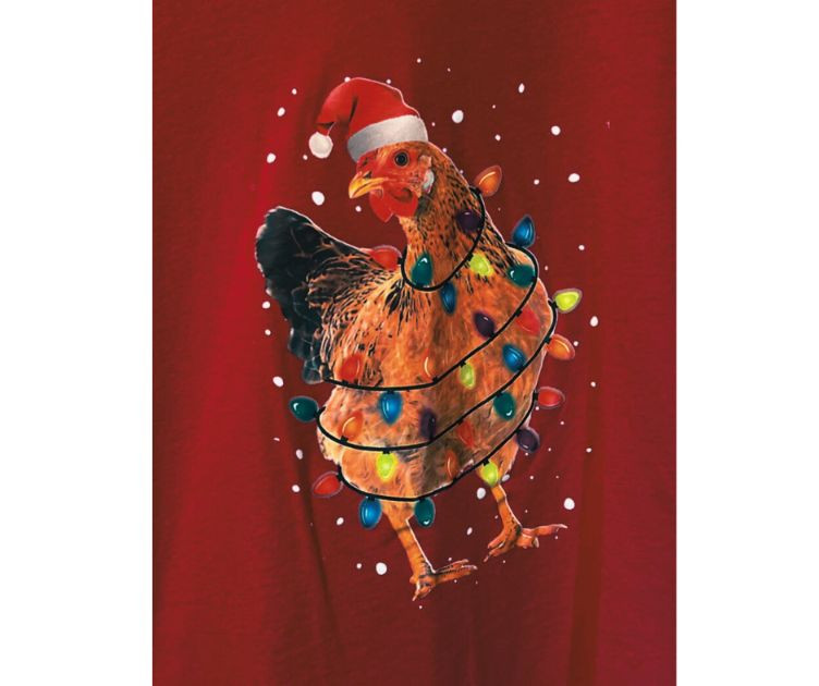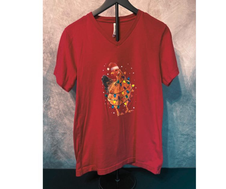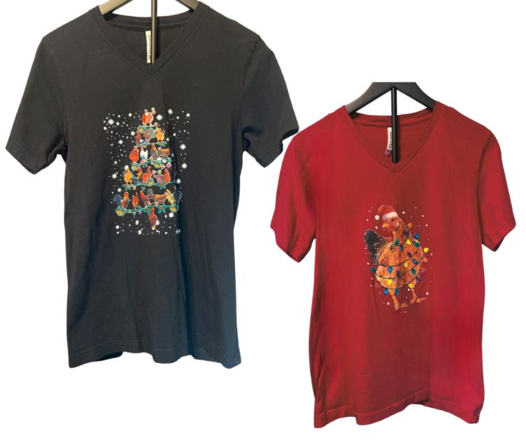 Set of two Bella+Canvas holiday T‑shirts featuring playful bird‑themed designs. One tee showcases a flock of colorful birds stacked into a Christmas‑tree shape, complete with twinkle lights and snowy accents. The second features a festive turkey decked out in Christmas lights and a Santa hat. Soft Bella+Canvas fabric, bright graphics, and cheerful novelty style — perfect for holiday parties, gifting, or seasonal fun. USA/Nicaragua produced.