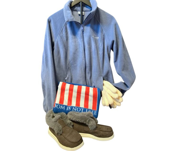 A cozy, practical winter essentials set combining comfort, warmth, and everyday usability. This bundle includes: Columbia Sportswear Blue Fleece Jacket — a soft, zip‑front fleece ideal for layering in cold weather. Patriotic Flag Fleece Throw — a warm red‑white‑and‑blue fleece blanket featuring the phrase “Freedom Is Not Free.” Cream Knit Gloves by Joe Boxer — soft, insulating gloves perfect for daily winter wear. Brown Winter Slip‑On Shoes — plush‑lined slip‑ons with faux‑fur interior and sturdy soles for indoor‑outdoor comfort. A versatile cold‑weather bundle perfect for gifting, home use, or building out your winter rotation.