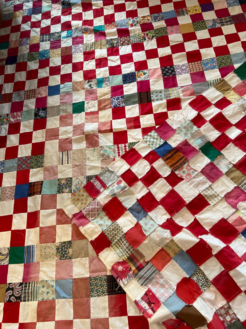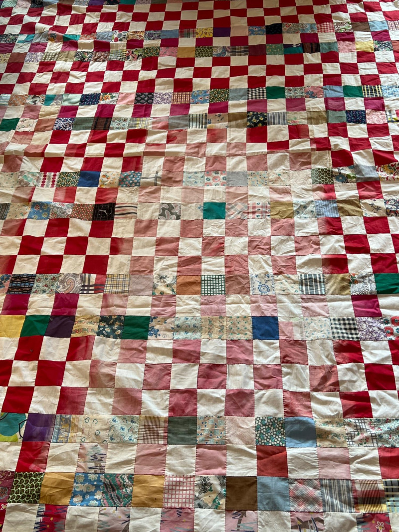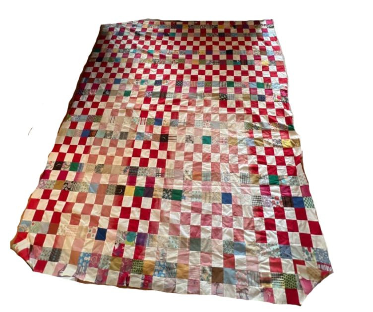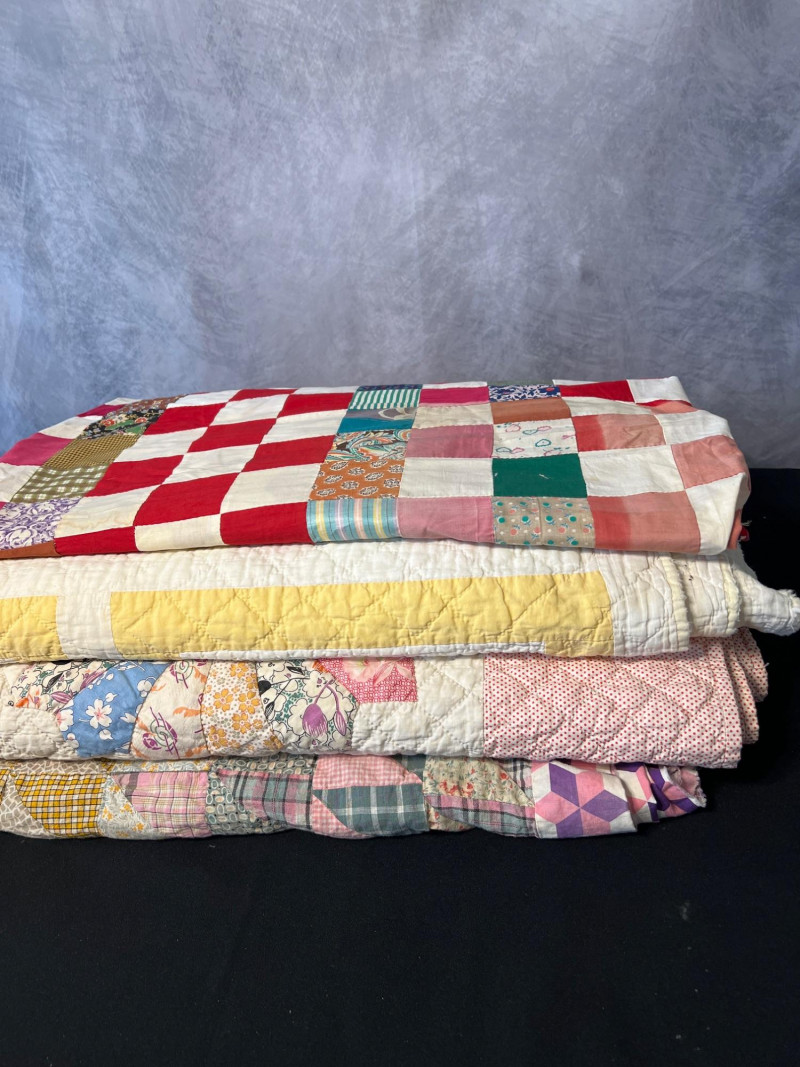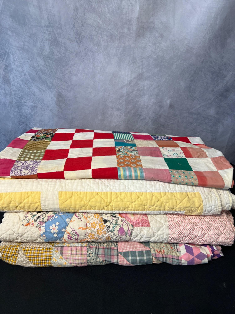 A wonderful lot for collectors, quilters, or anyone who appreciates vintage hand‑sewn craftsmanship. See photos for individual patterns. Yellow - 92" x 75" Pink - 82" x 68" Diagonal Patchwork - 78" x 62" (no back) Red Square Patchwork - 87.5 x 73.5 (no back)