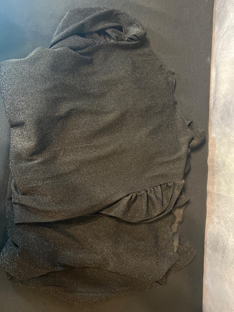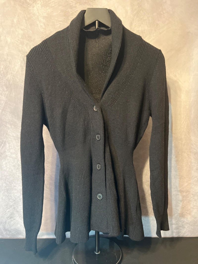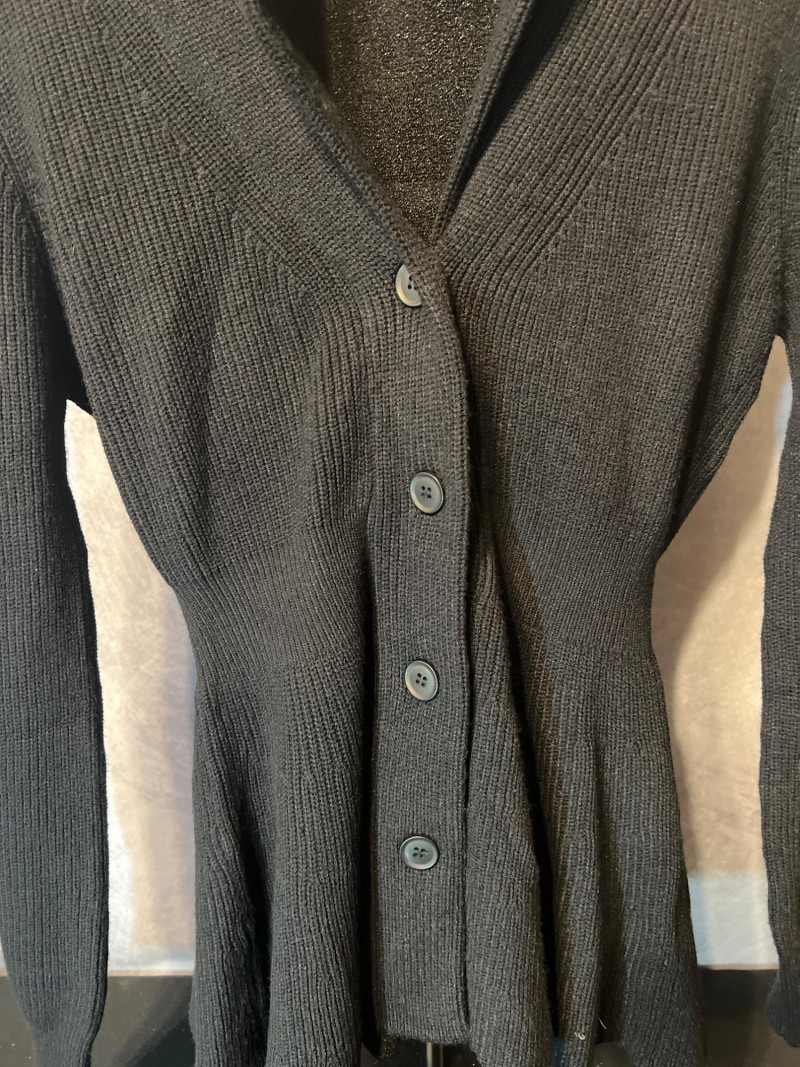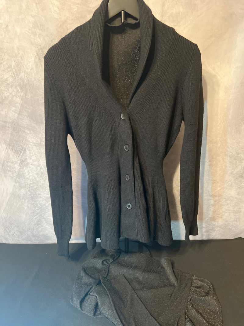 Two‑piece black apparel set featuring a Bella Pogue tailored rib‑knit sweater with a structured silhouette and button front, paired with an unbranded sparkly black stretch top. The top features a ruffled high neckline, puffed/pleated shoulders, and a shimmering finish for a dramatic layered look. Wear together or separately for versatile styling. Size Medium.