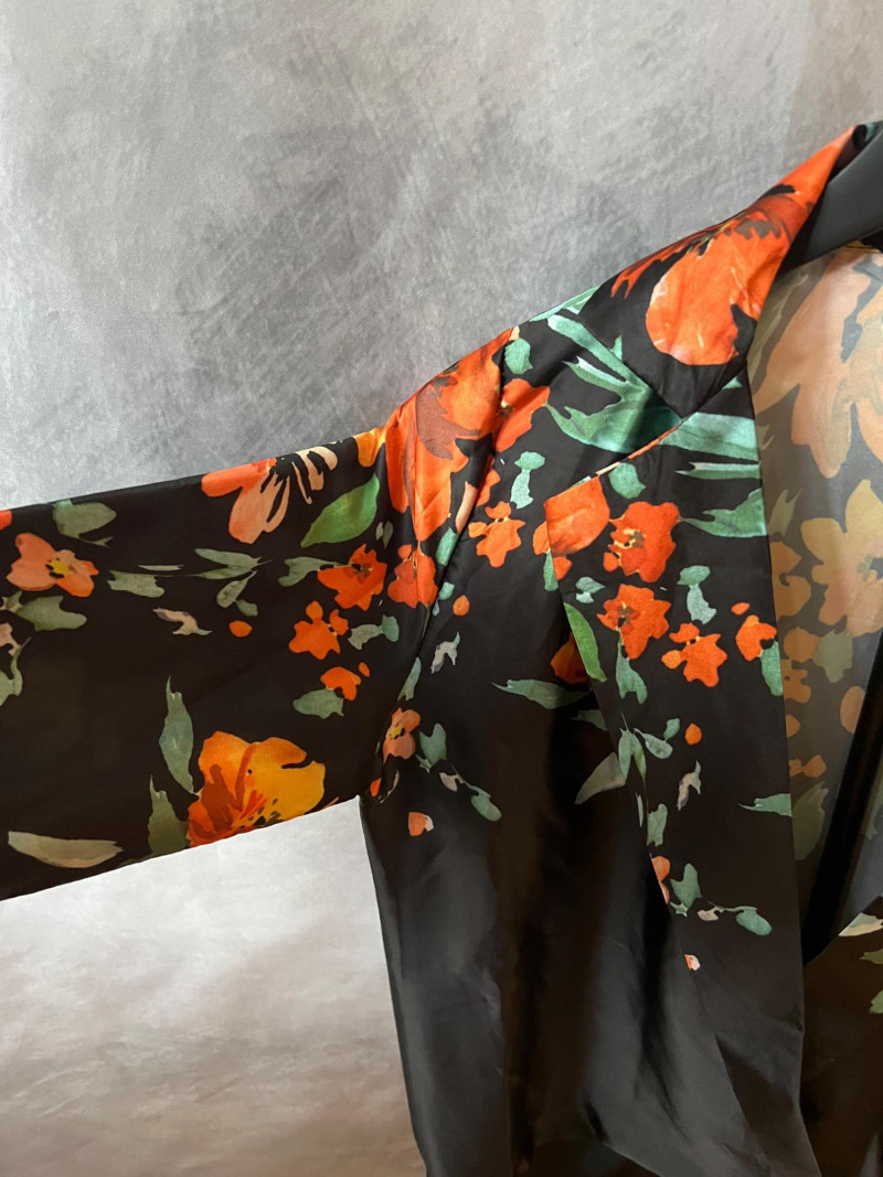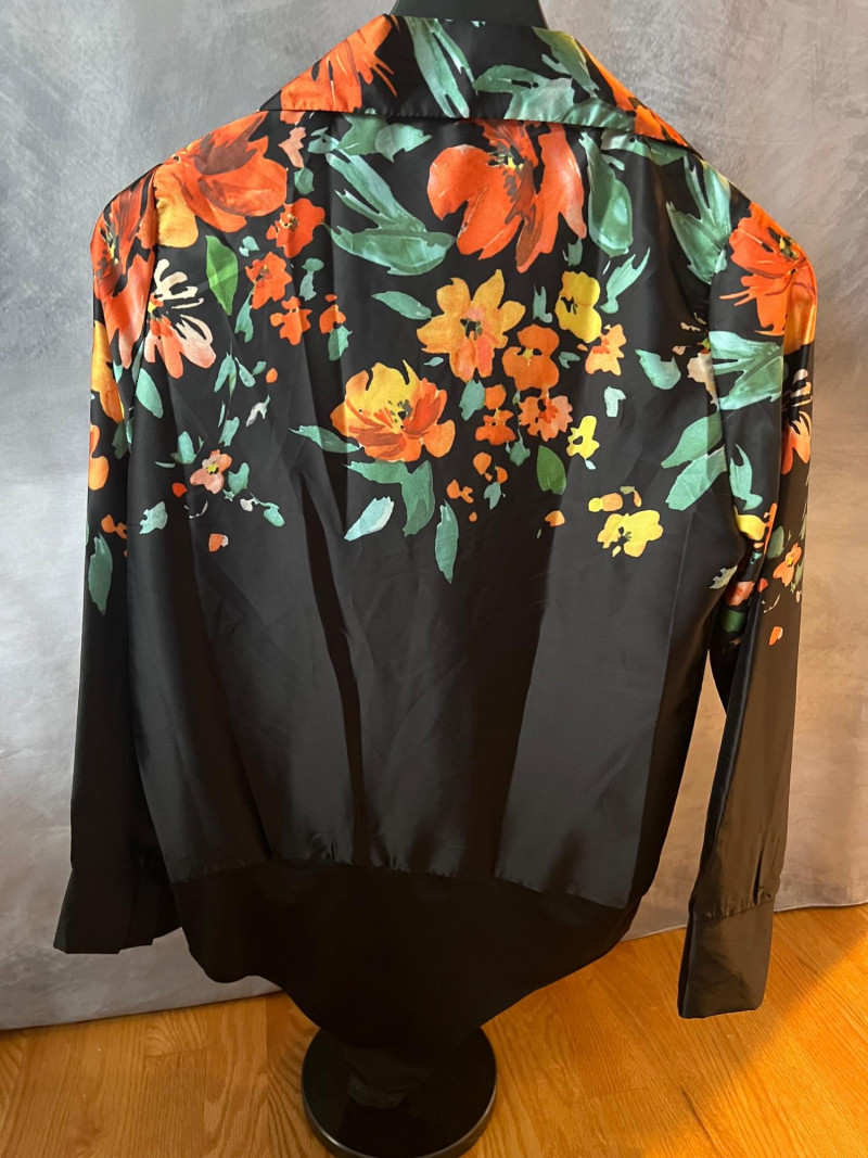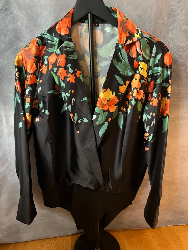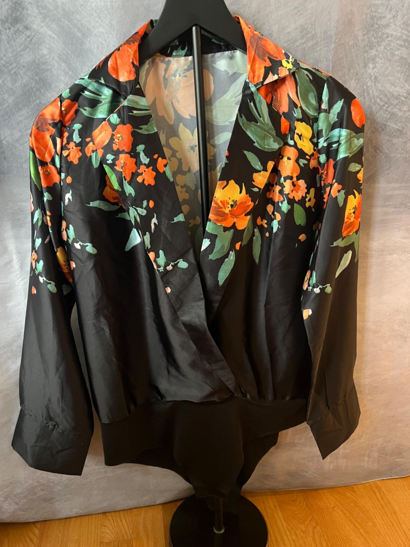 A striking floral bodysuit from Zara featuring a deep V‑neckline, wrap‑style front, and long sleeves - Size Medium. The vivid floral print brings warm tones of red, orange, and yellow against a dark background, creating a bold, elegant silhouette. Designed with a fitted waist and smooth, lightweight fabric, this piece transitions effortlessly from day to night — perfect for pairing with denim, skirts, or tailored layers. Zara floral long‑sleeve bodysuit Deep V‑neckline with wrap‑front styling Vibrant multicolor floral print Fitted waist for a flattering shape Lightweight, silky feel Snap‑closure bodysuit designFeatures