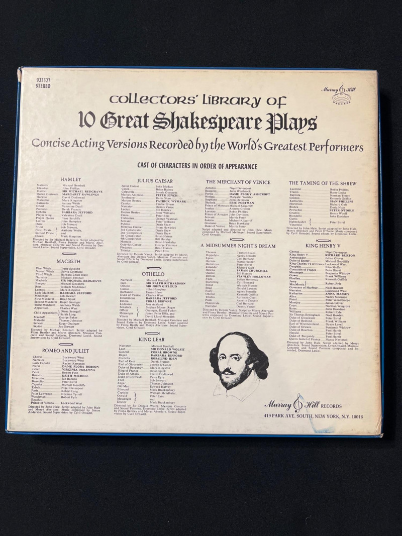 A classic multi‑record collection featuring dramatic performances of ten of Shakespeare’s most celebrated works. This vintage set brings together full‑cast productions, period‑appropriate soundscapes, and rich vocal performances that capture the depth, rhythm, and emotional power of Shakespeare’s language. Ideal for collectors of vinyl, theater enthusiasts, educators, and anyone who appreciates historic audio interpretations of the Bard’s plays. All 10 records (20 sides) included along with background and read-along pamphlet. Multi‑record vinyl set Includes ten Shakespeare plays Full‑cast dramatic performances Vintage packaging and presentation Ideal for collectors and Shakespeare enthusiastsFeatures