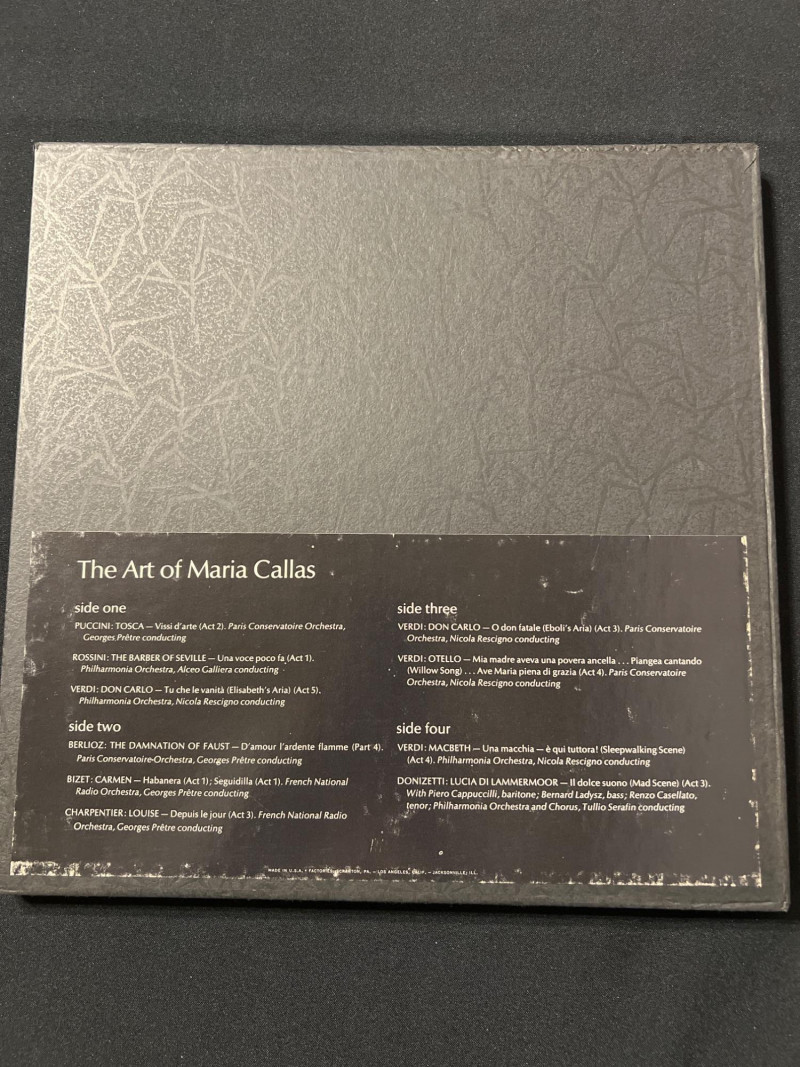 A beautifully preserved edition of The Art of Maria Callas, issued by Angel Records and featuring selections from some of her most celebrated operatic roles. This compilation highlights Callas’s extraordinary vocal artistry across works such as The Barber of Seville, Lucia di Lammermoor, Macbeth, Don Carlo, Otello, Tosca, The Damnation of Faust, Louise, and Carmen. Known as “La Divina,” Maria Callas remains one of the most influential sopranos of the 20th century, and this set captures the dramatic intensity and musical intelligence that defined her legacy. A must‑have for opera lovers, collectors of classical vinyl, and admirers of Callas’s unmatched interpretive power.