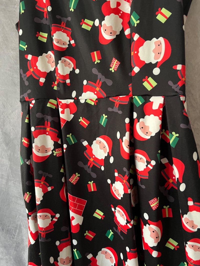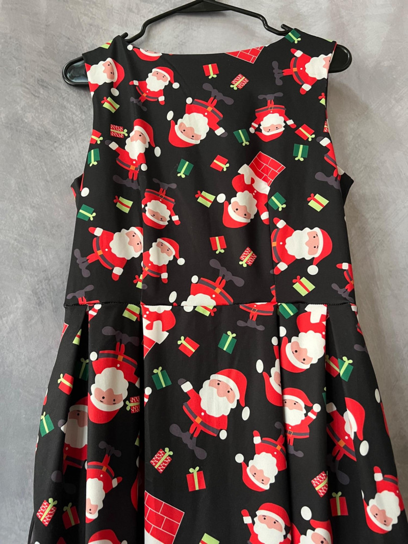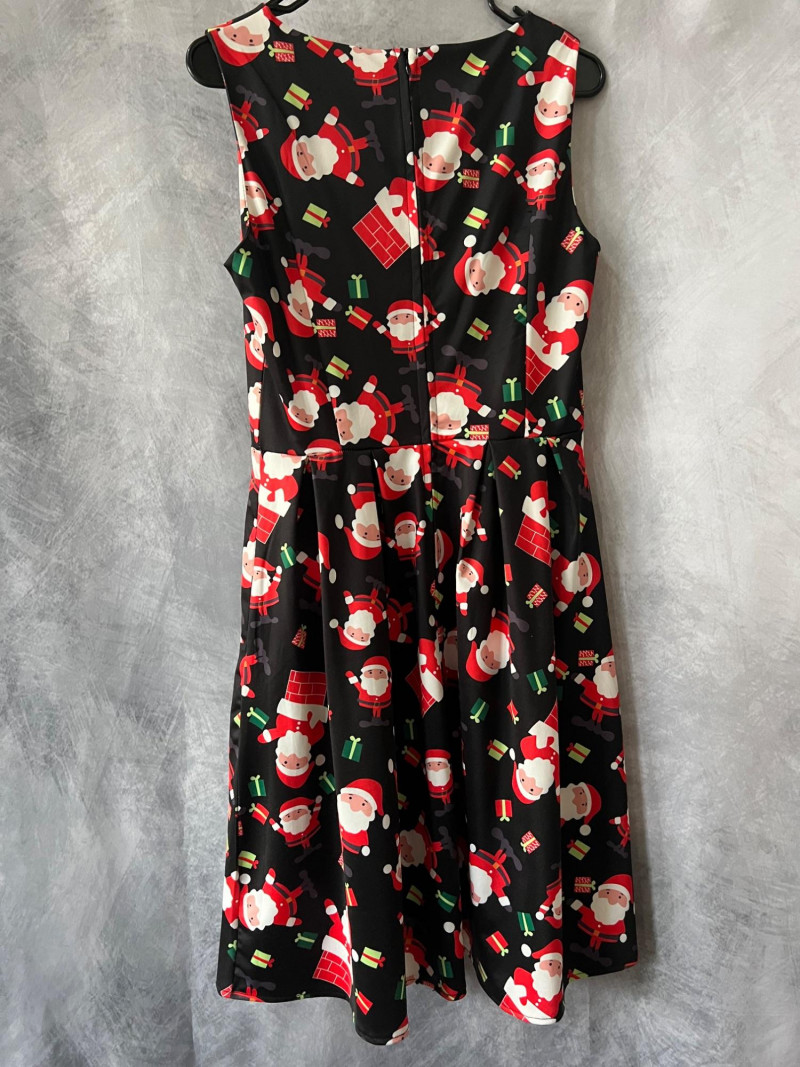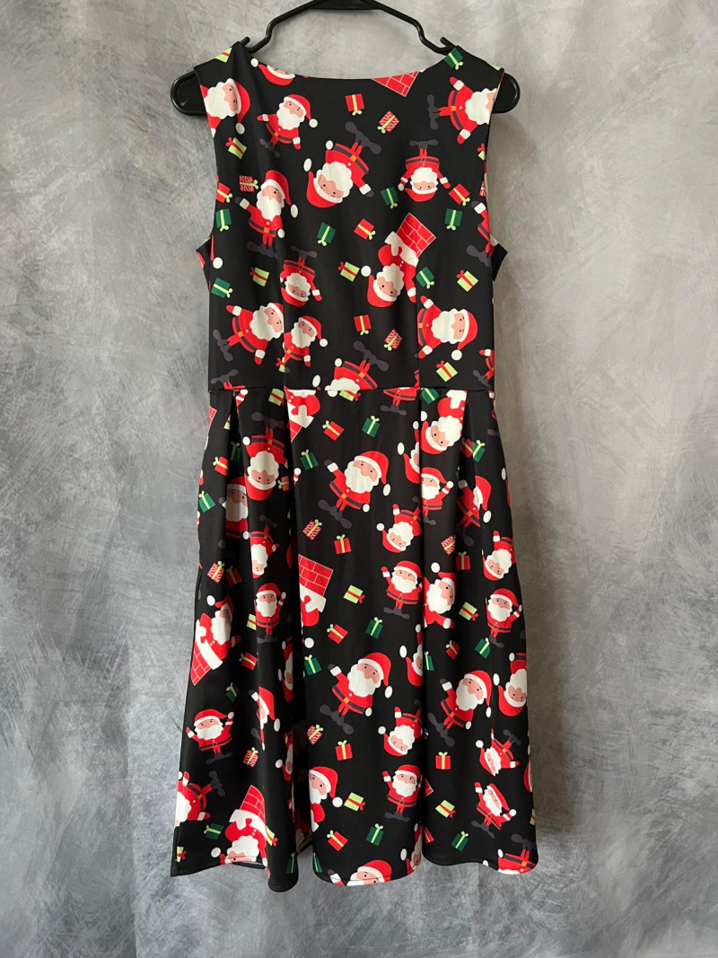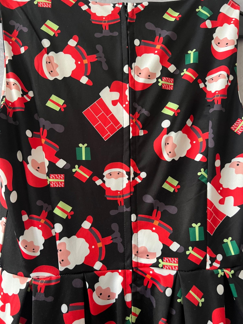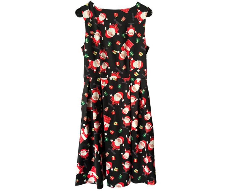 Santa Claus Print Sleeveless Dress with Flared Skirt – Zip‑Back – Women’s Size Small Festive and fun sleeveless dress featuring an all‑over Santa Claus print, perfect for holiday parties, themed events, or seasonal photos. Designed with a flattering flared skirt and a smooth zip‑up back for easy wear. Comfortable fabric with bright, cheerful graphics that hold their shape.