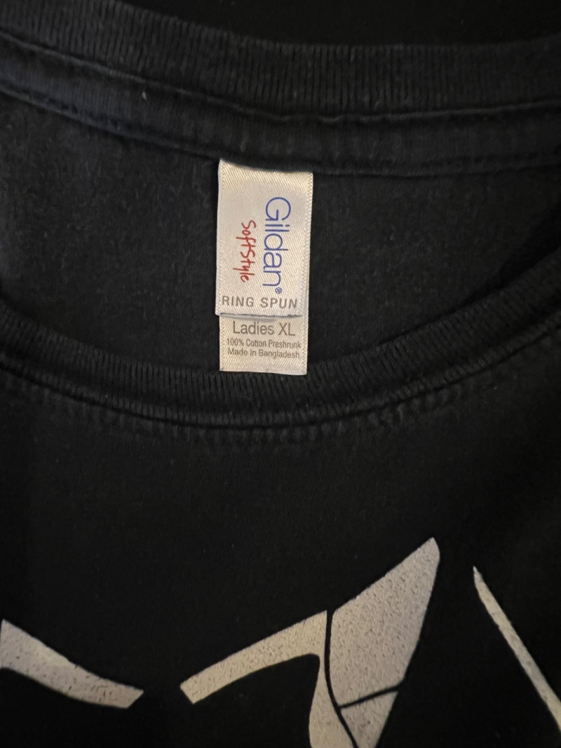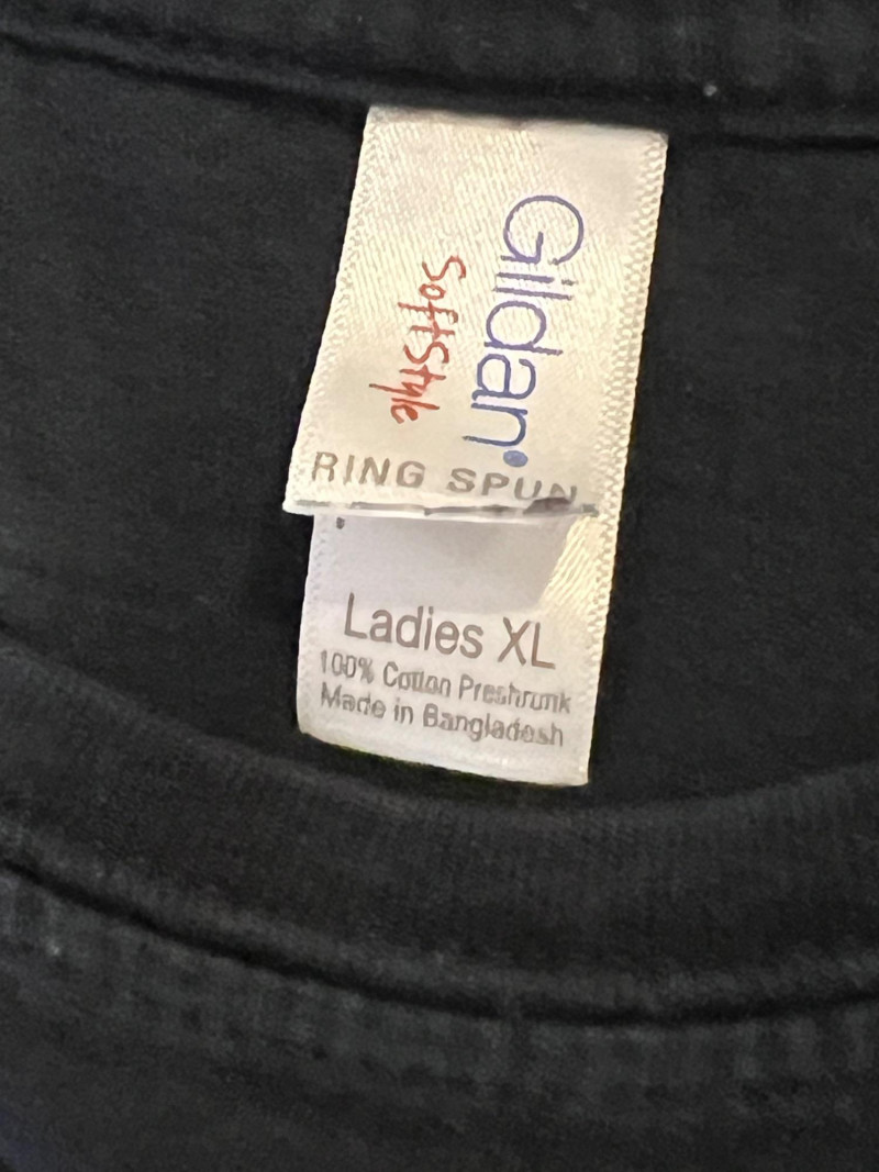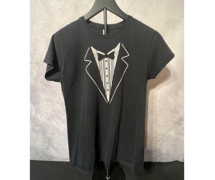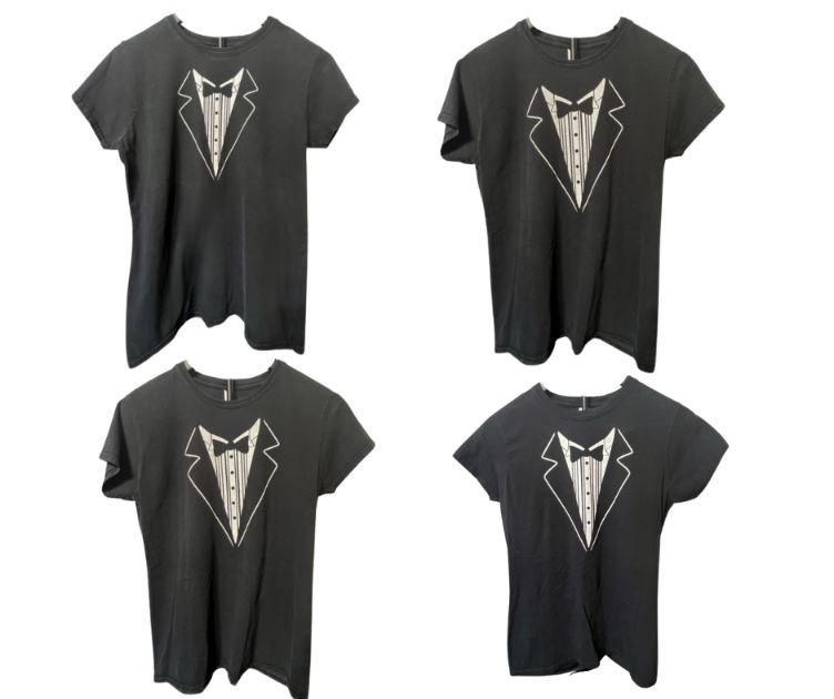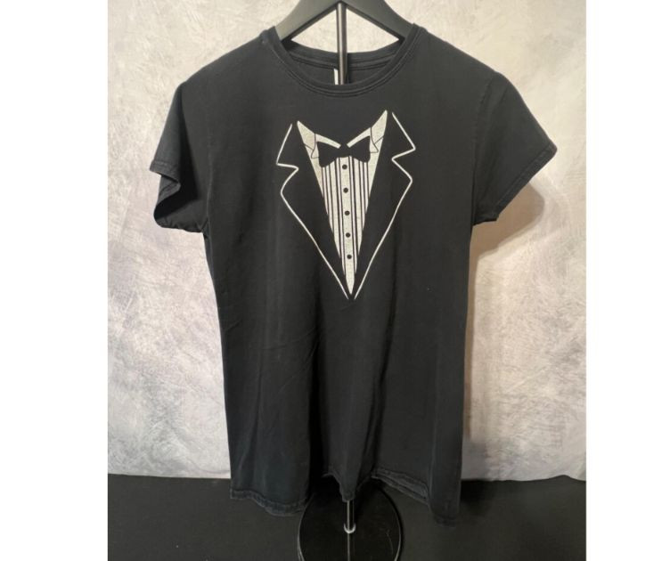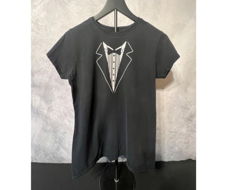 Set of four classic tuxedo‑illusion T‑shirts printed on black Gildan tees. Each shirt features the iconic faux‑formal tuxedo front with bow tie, lapels, and button detailing — a playful take on dress‑up style. Lightweight, comfortable, and perfect for themed events, parties, or casual humor. Marked Ladies Size XL and L but appears to be small to medium.