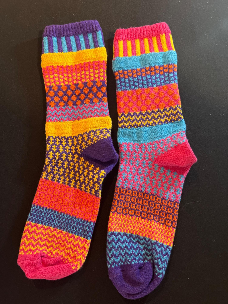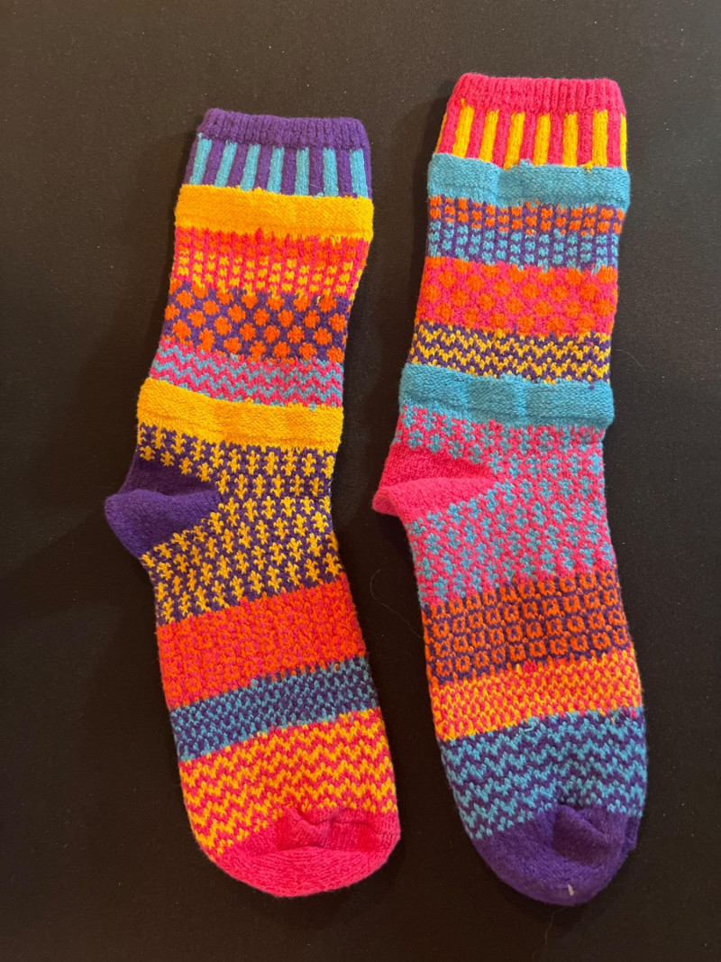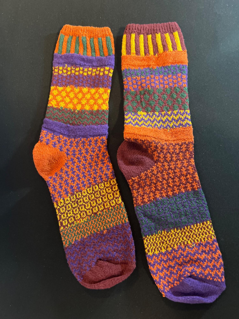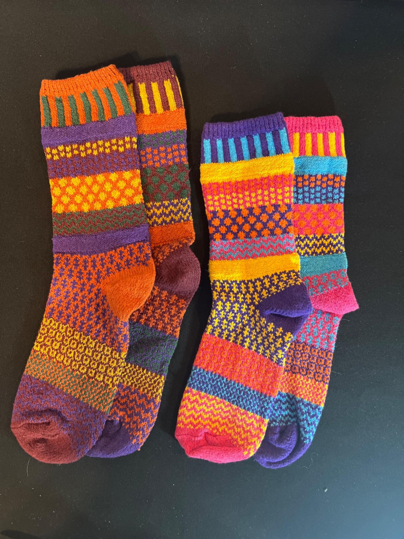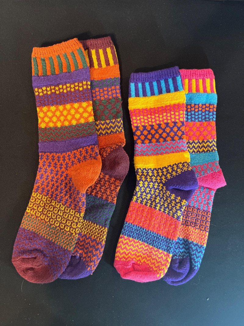 Two pairs of vibrant folk‑style knit socks featuring multicolor geometric patterns in traditional Nordic and Andean‑inspired motifs. Soft, cozy, and likely artisan‑made with no maker tag. Bright, playful colorwork makes each pair a standout accessory.
