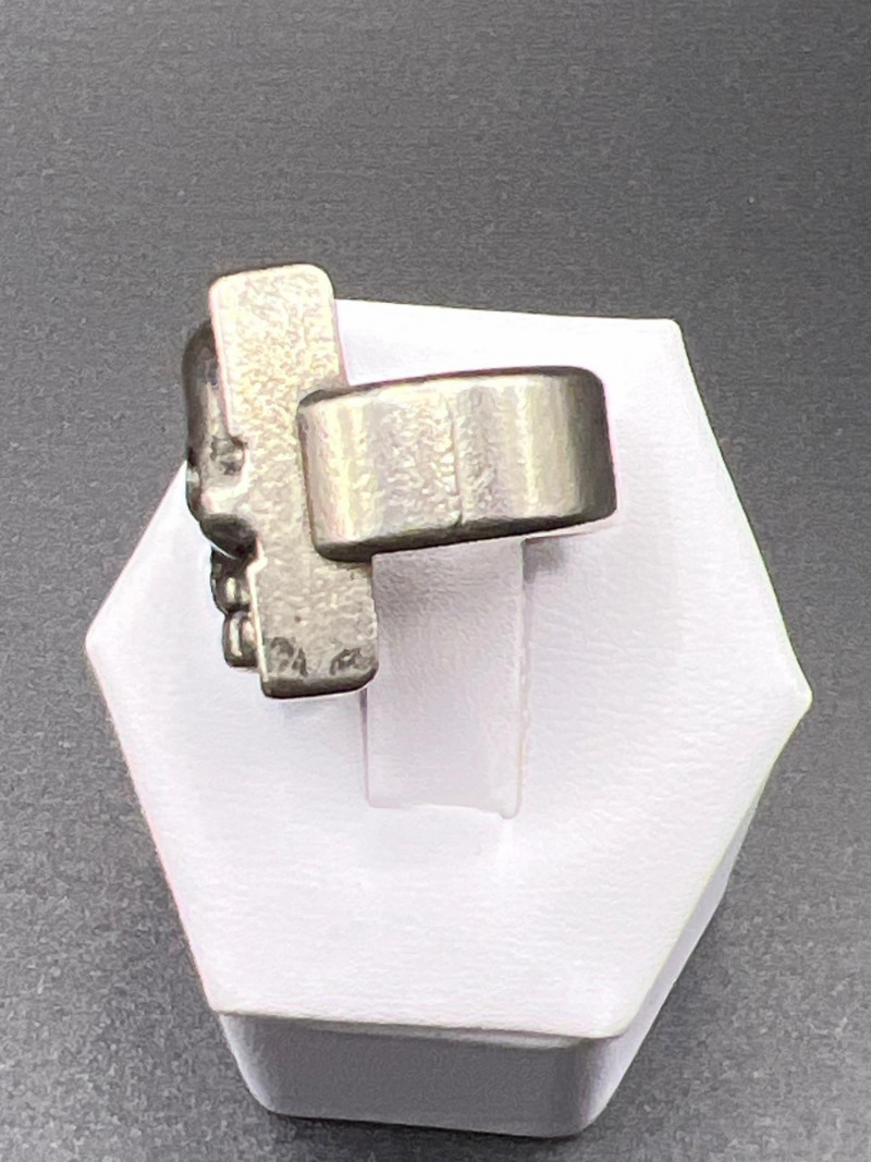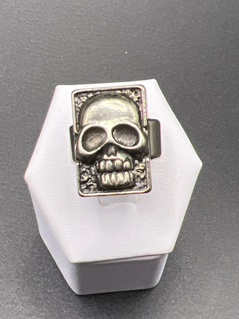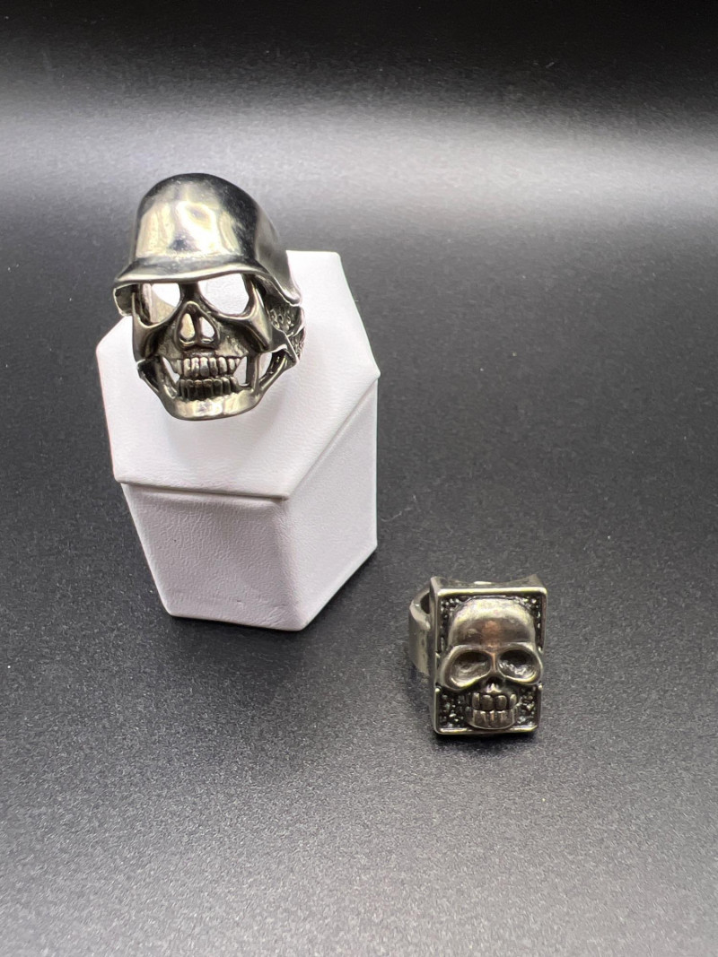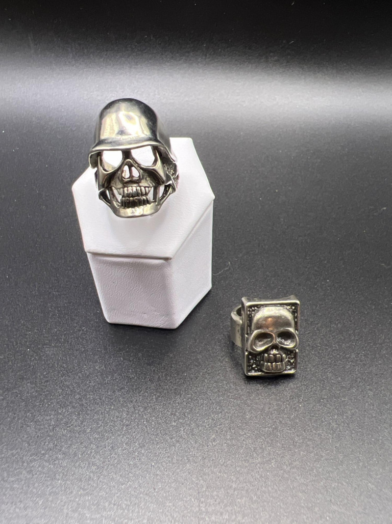 Pair of bold skull‑themed rings in heavy silver-toned? metal. Includes a substantial biker‑style ring featuring a detailed skull with helmet (size 8), and a rectangular signet‑style ring with a raised skull framed (size 5) by decorative edging. Strong, graphic designs with solid weight and attitude — ideal for biker, gothic, and alternative fashion collectors.