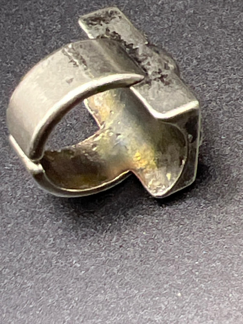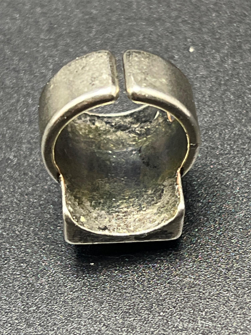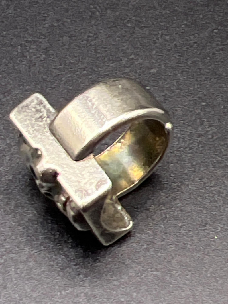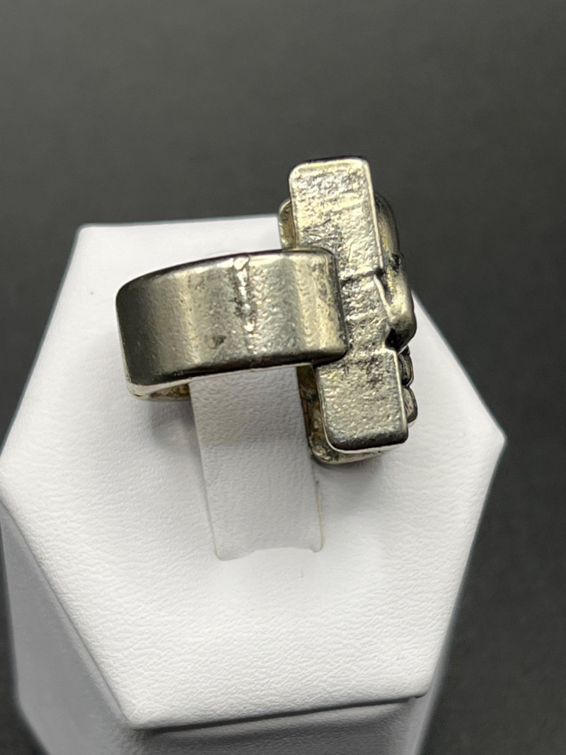 Pair of bold skull‑themed rings in heavy silver-toned? metal. Includes a substantial biker‑style ring featuring a detailed skull with helmet (size 8), and a rectangular signet‑style ring with a raised skull framed (size 5) by decorative edging. Strong, graphic designs with solid weight and attitude — ideal for biker, gothic, and alternative fashion collectors.