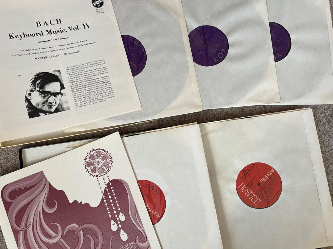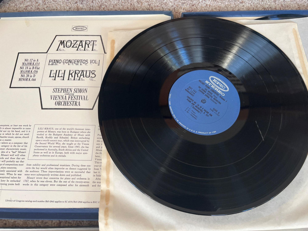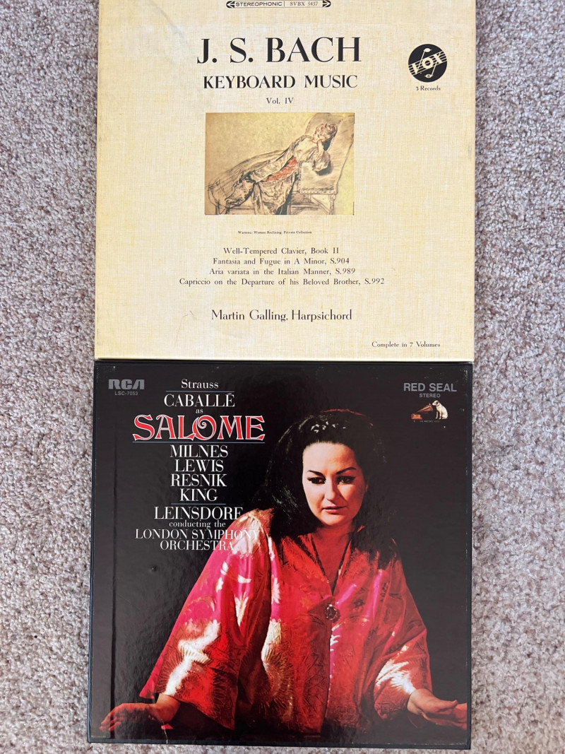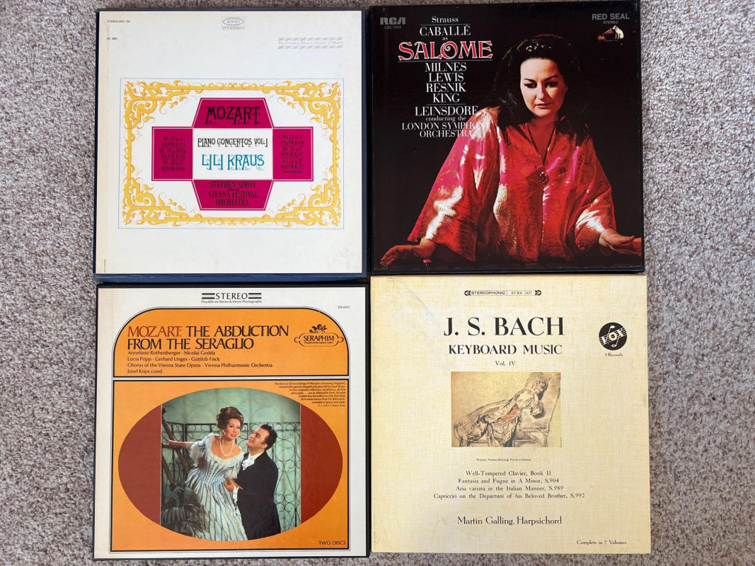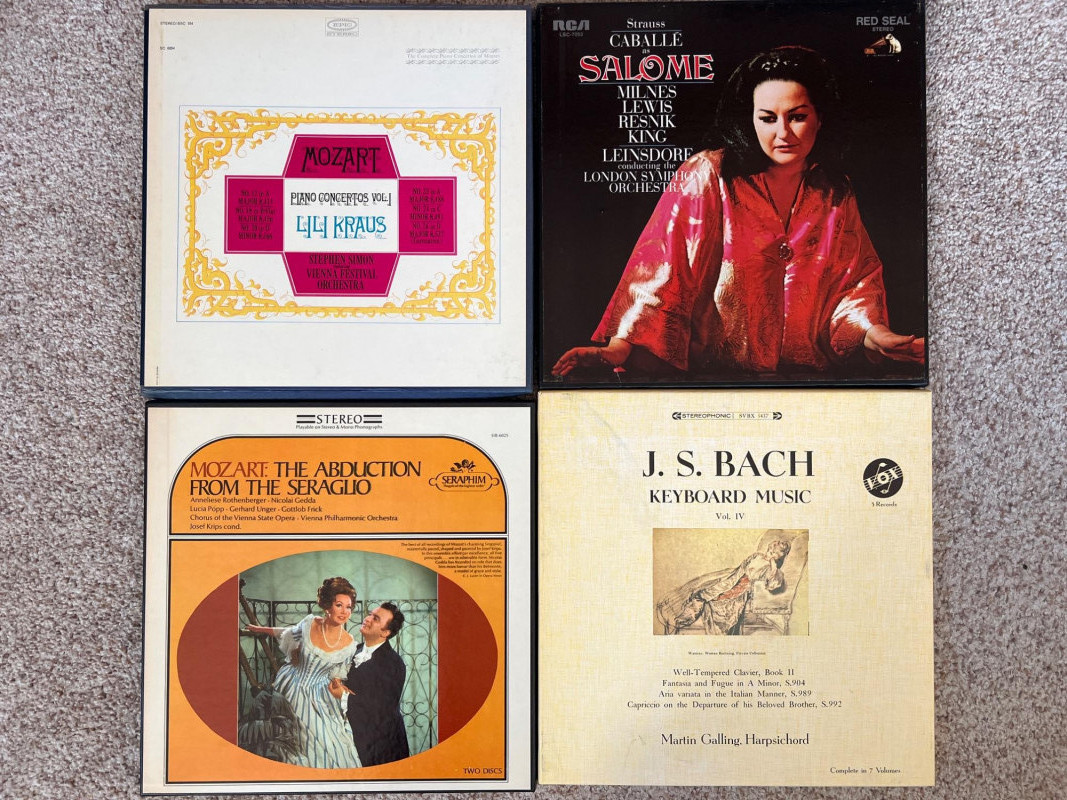 Set of four classical vinyl record sets, each including its original inner booklet. The lot features Mozart Piano Concertos Vol. I with Lili Kraus and the Vienna Festival Orchestra; Strauss’s Salome conducted by Erich Leinsdorf; Mozart’s The Abduction from the Seraglio with the Vienna Philharmonic under Josef Krips; and J.S. Bach Keyboard Music Vol. IV performed by Martin Galling. A strong mix of orchestral and operatic recordings showcasing major performers and conductors, ideal for classical vinyl collectors.