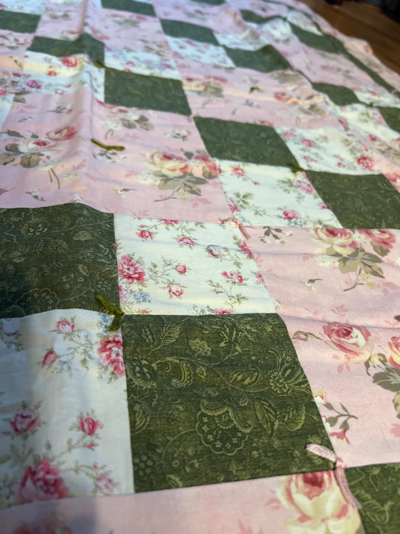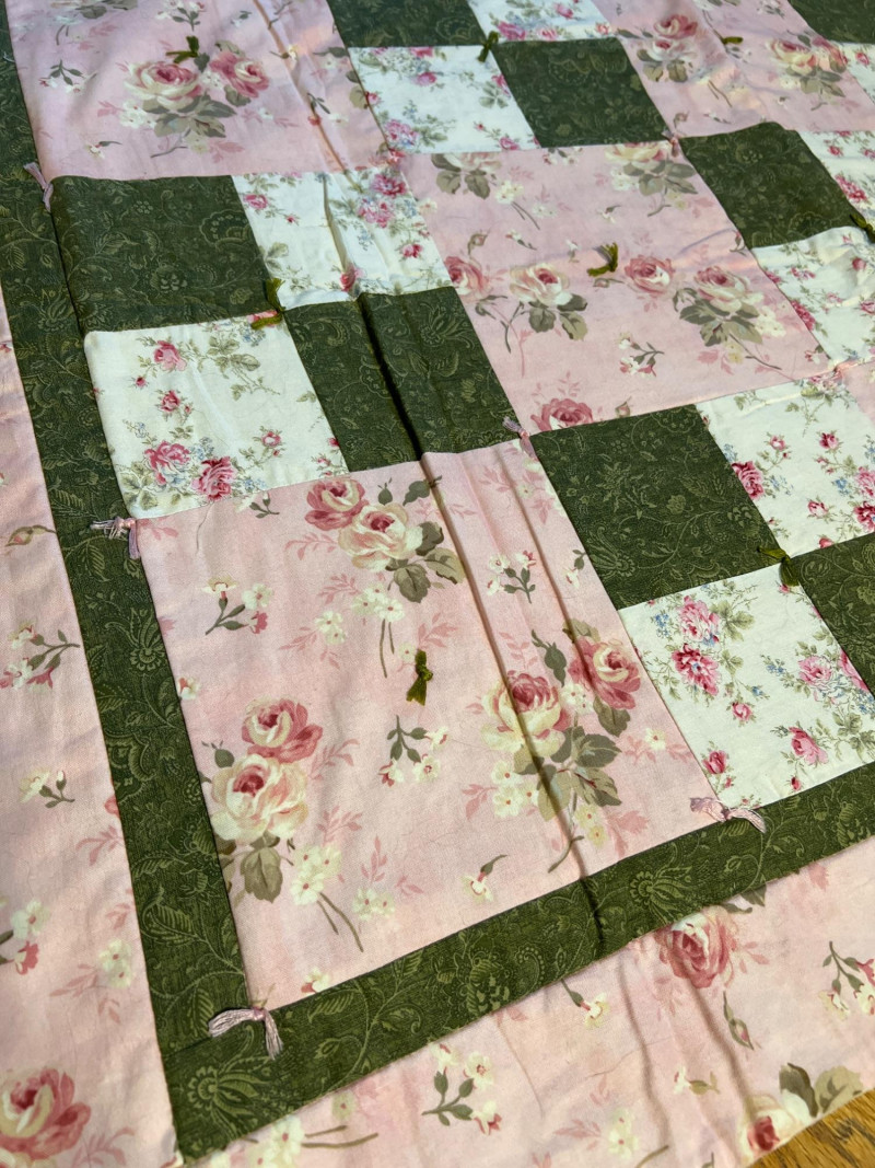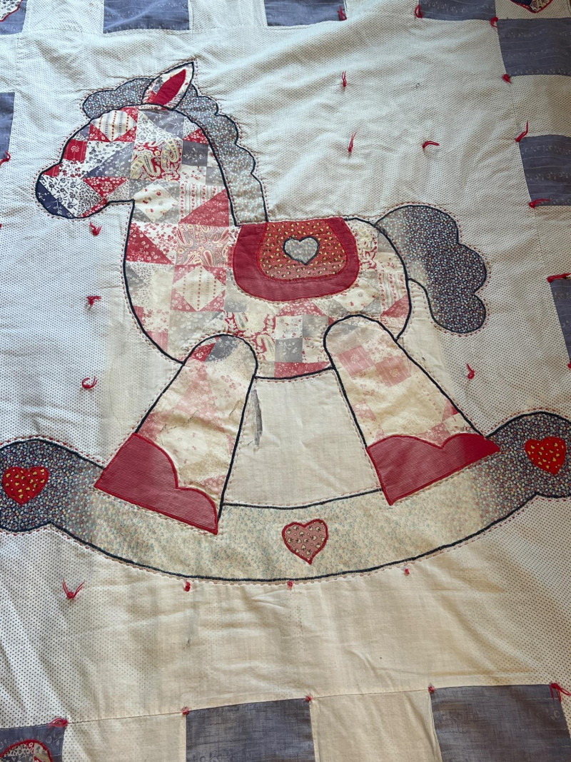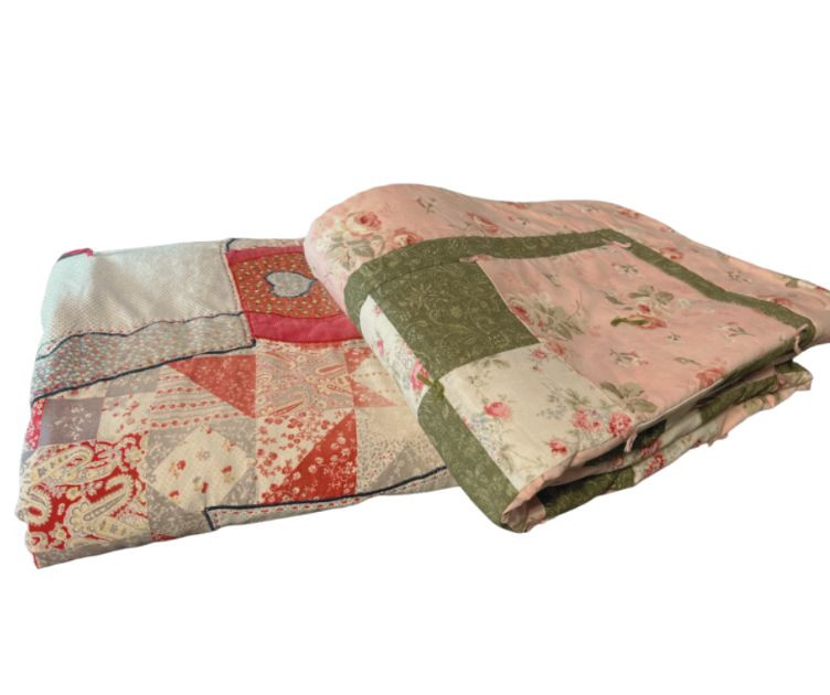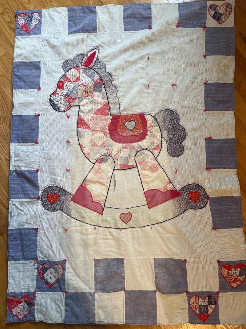 Pair of handmade quilts featuring traditional pieced construction and vibrant fabric combinations. Each quilt shows the unique character of artisan workmanship, with visible stitching, coordinated patterns, and thoughtful color placement. A warm and inviting duo suitable for display, layering, or everyday use, offering the charm and individuality found only in handmade textile work. Rocking horse quilt needs repair on a few blocks along edge and a few center squares.