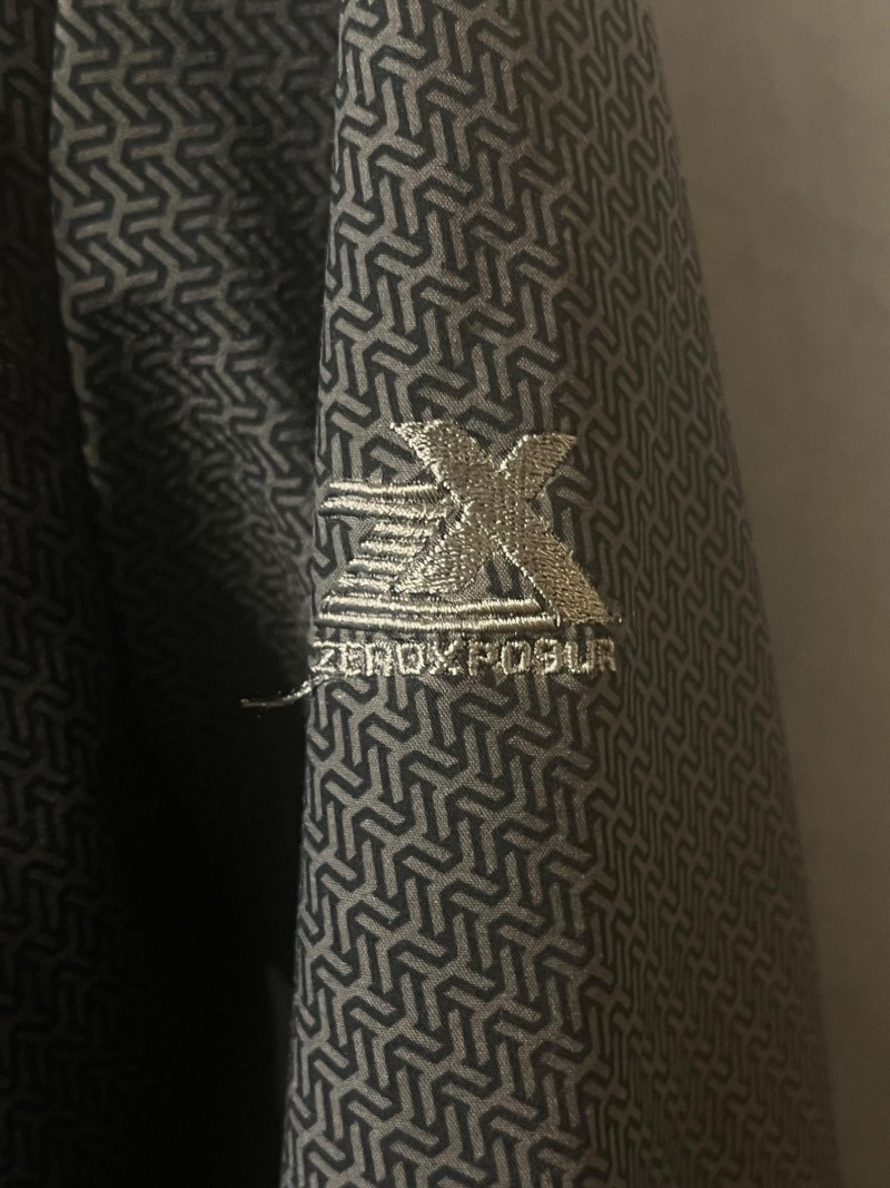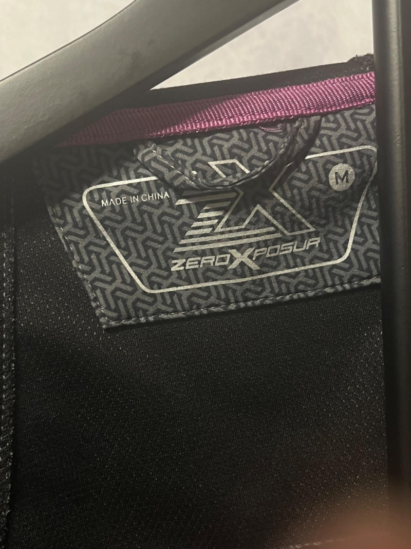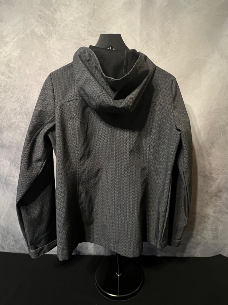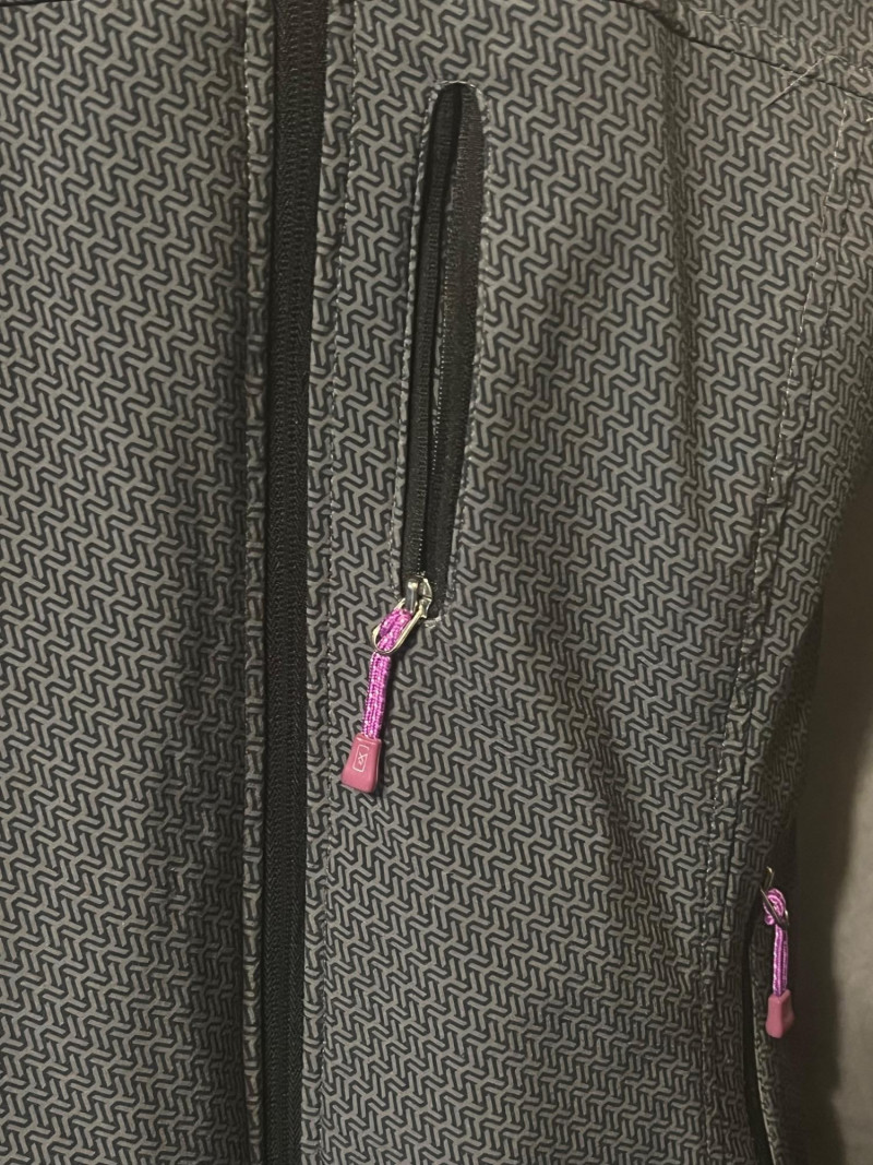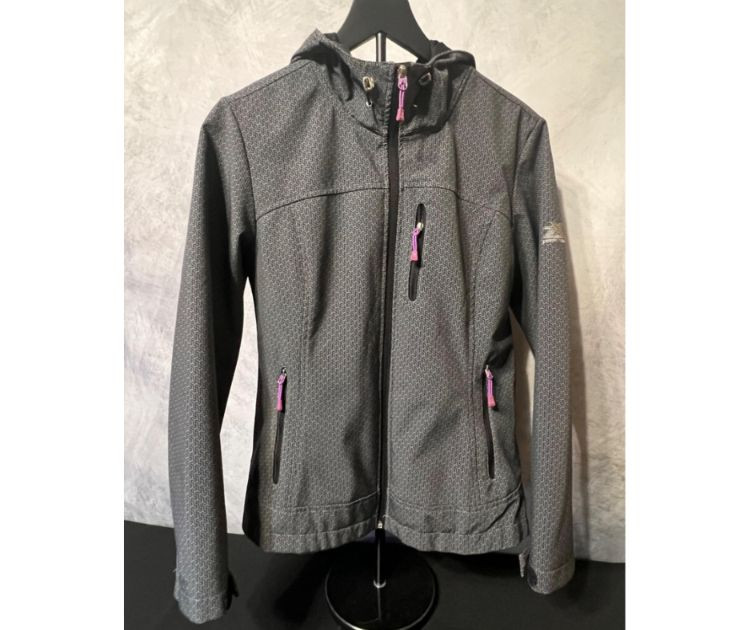 ZeroXposur women’s softshell jacket featuring a geometric patterned gray shell with purple zipper accents. Designed with a full front zip, three zippered pockets, and an attached hood with adjustable drawcords. Lightweight, flexible, and water‑resistant — ideal for everyday wear, travel, or outdoor activities. Size Medium.