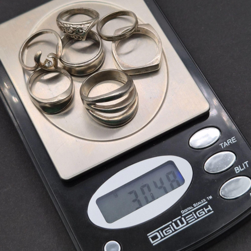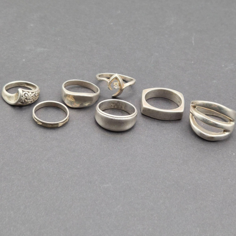 An estate grouping of sterling silver rings. This mixed assortment includes sizes 3 through 8 and weighs 30.4 grams total. Pieces display natural age patina and expected surface wear consistent with vintage estate jewelry.