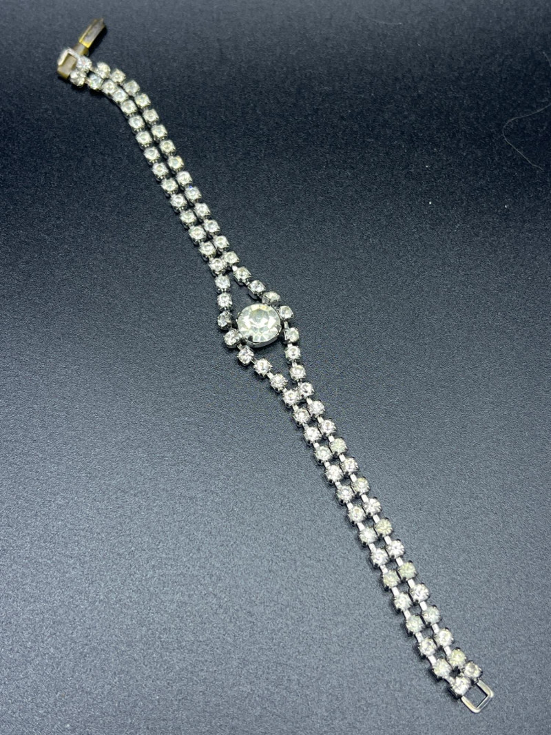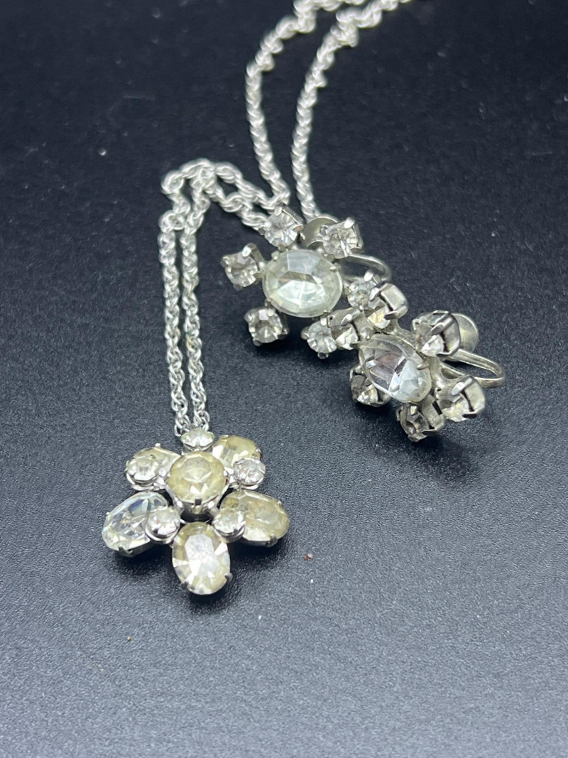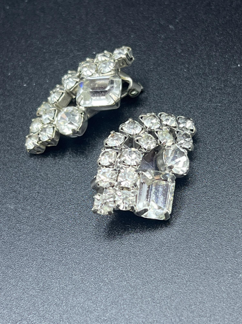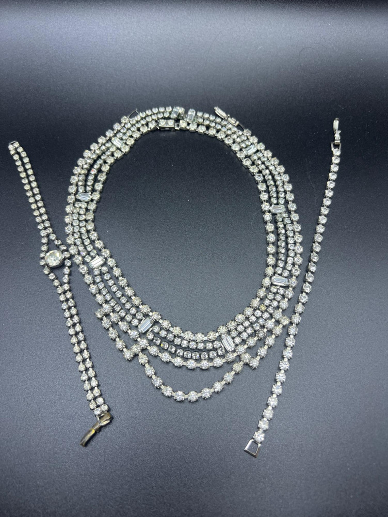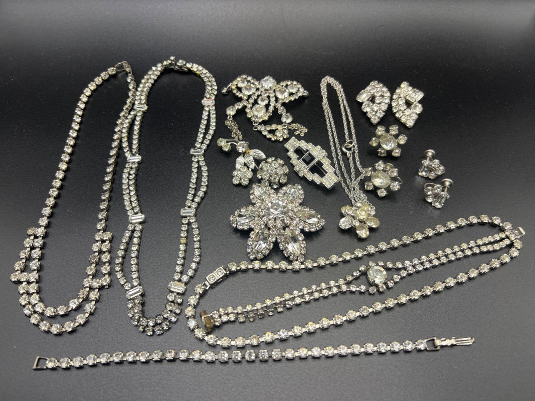 A variety of rhinestone clear stone jewelry pieces that include clip-on and screwback earrings, single strand bracelet and necklace combination, bracelet with two strands rhinestones and one clear stone at center, three necklaces, and four brooches.