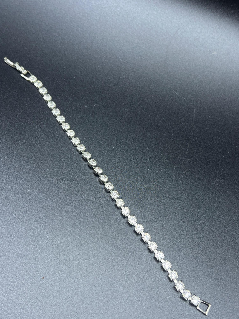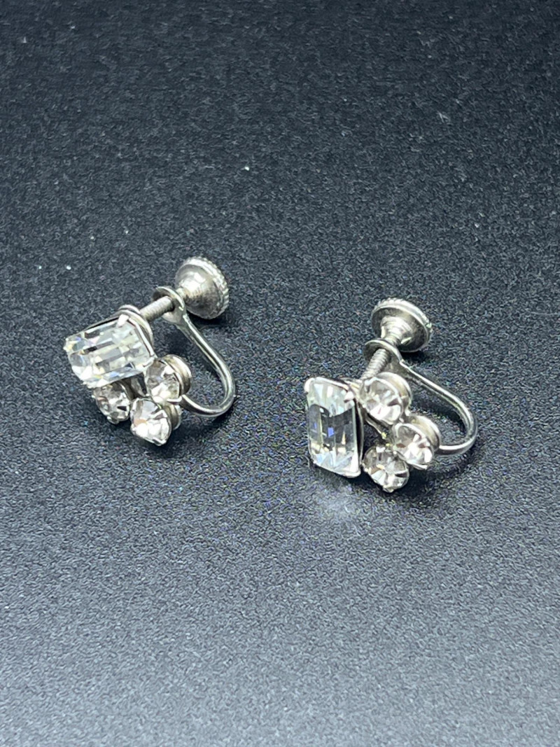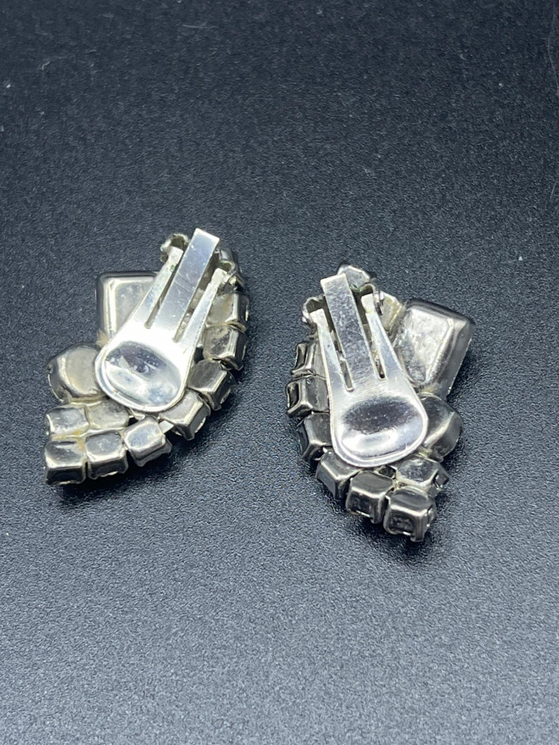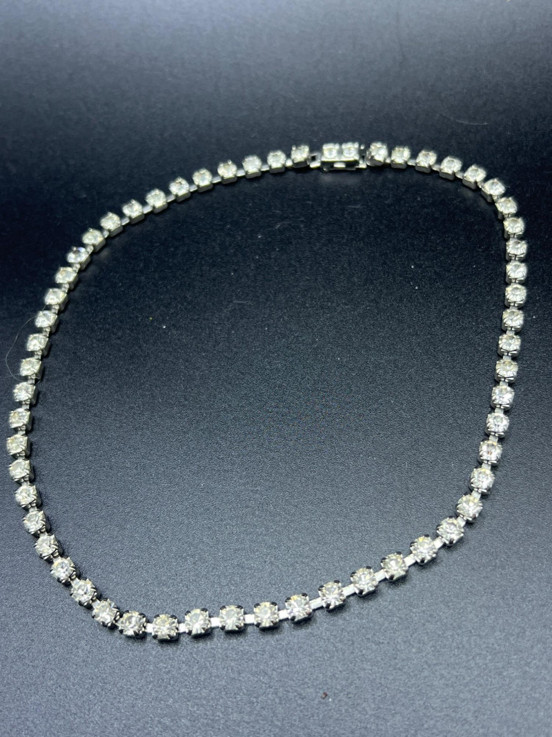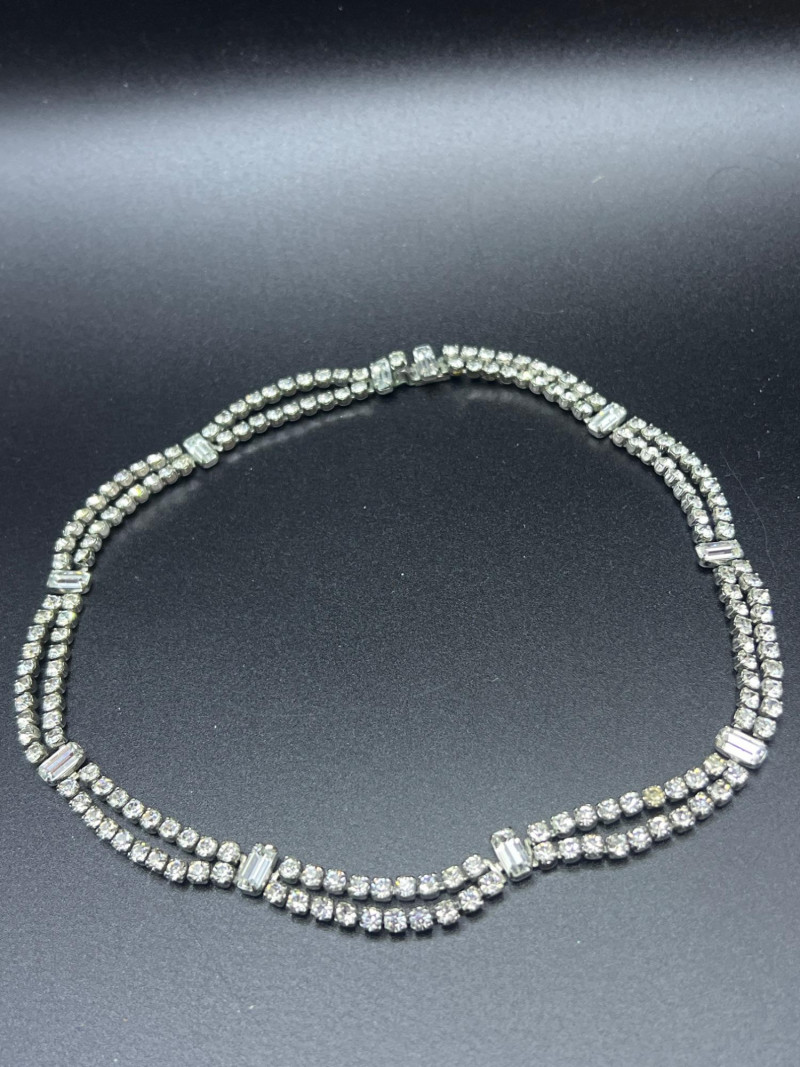 A variety of rhinestone clear stone jewelry pieces that include clip-on and screwback earrings, single strand bracelet and necklace combination, bracelet with two strands rhinestones and one clear stone at center, three necklaces, and four brooches.
